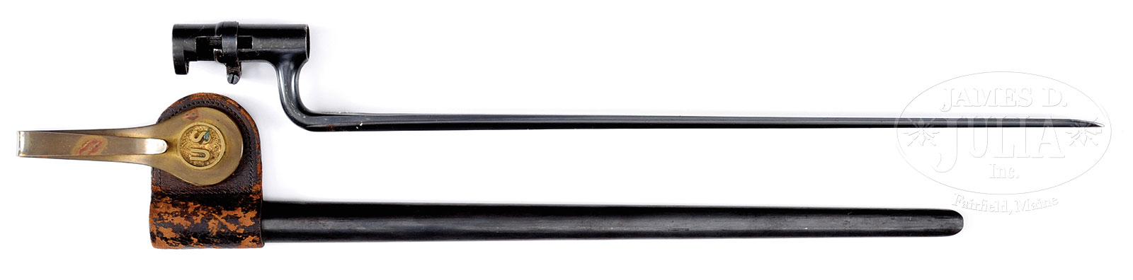EXCEPTIONAL 1889 DATED US MODEL 1884 TRAPDOOR SPRINGFIELD RIFLE.SN 357894. Cal. 45-70. Standard configuration with 32-5/8″ rnd bbl with long range Buffington rear sight. Gun retains virtually all of its bright orig blue and case hardened finish. Traces of cosmoline in breech. Accompanied by a correct socket bayonet and 1885 standard issue scabbard.It would be difficult to find a nicer example. CONDITION: Extremely fine. About 99% orig blue found on bbl, lock, trigger guard, bands and screws, light wear to muzzle. Buttplate retains 95% plus orig blue with wear where stacked. Breechblock and tang retain 90% plus bright to muted case colors. Stock is sound, solid with several cosmetic dents and dings. Bright cartouches. Mechanically crisp with shiny bright bore. 51905-2 JS (2,000-3,000) – Lot 3239