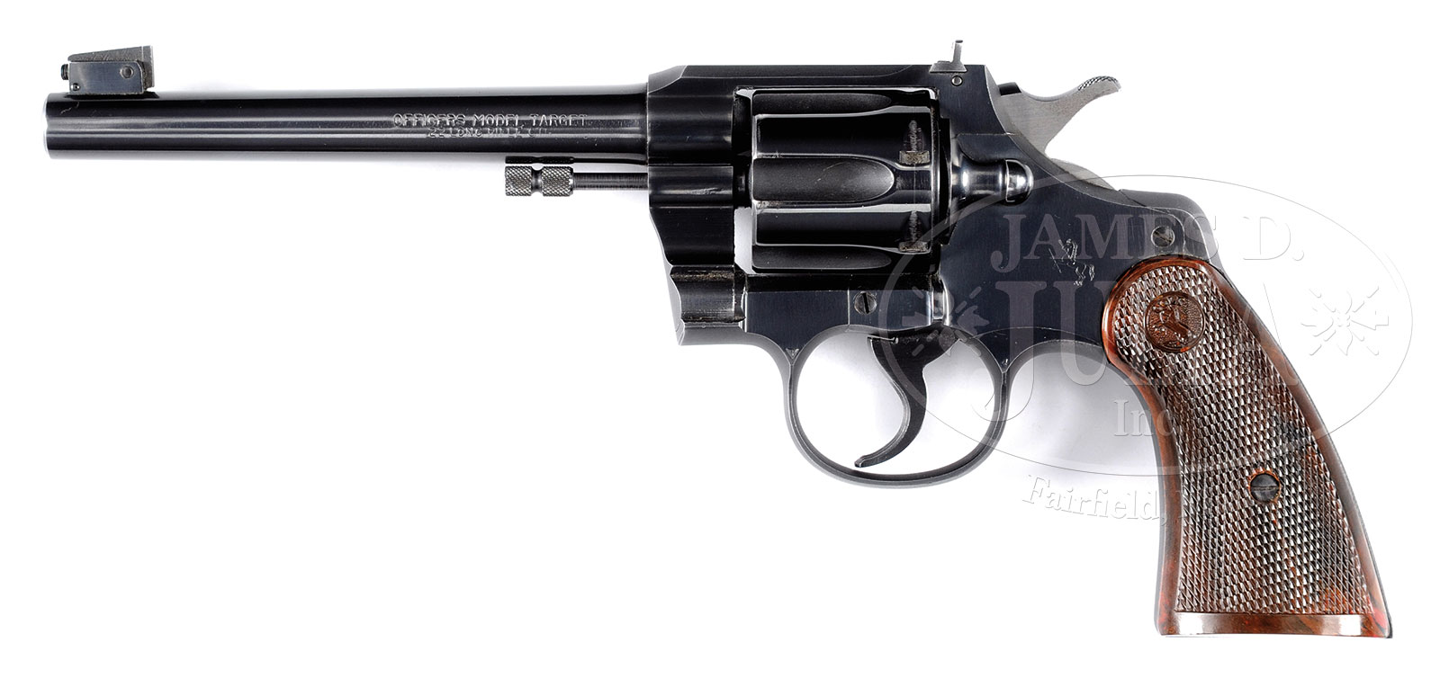 *COLT OFFICER MODEL TARGET BOXED 3RD ISSUE REVOLVER.SN 56193. Cal 22LR. Bbl 6″. Adjustable Patridge front sight with adjustable square notch rear sight. 6-shot fluted cyl. Serrated trigger and backstrap. 2-pc checkered composite grips. Manufactured 1930-1949. With 1-pc brown box with appropriate label containing test target shooting suggestion pamphlet and cleaning brush & swab. Box does not have SN. CONDITION: Fine. Over 90% orig blue showing light edge wear and small scratches. Very good grips. Mechanics are fine. Bright bore with sharp rifling. Box shows light wear. 51934-3 DS (1,500-2,000) C&R – Lot 2481