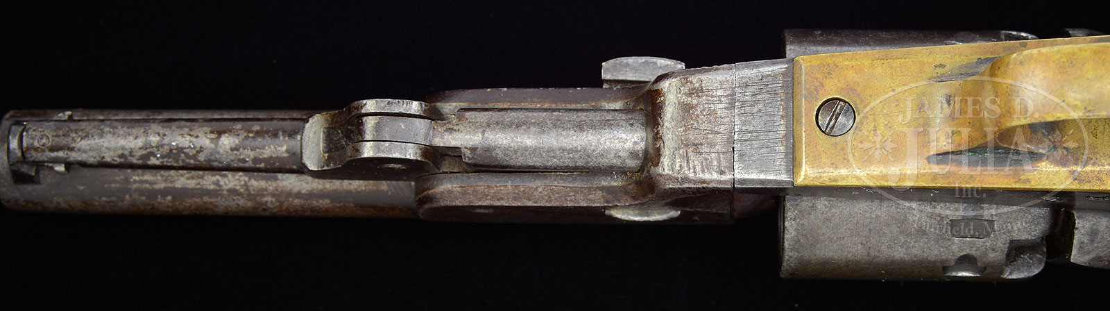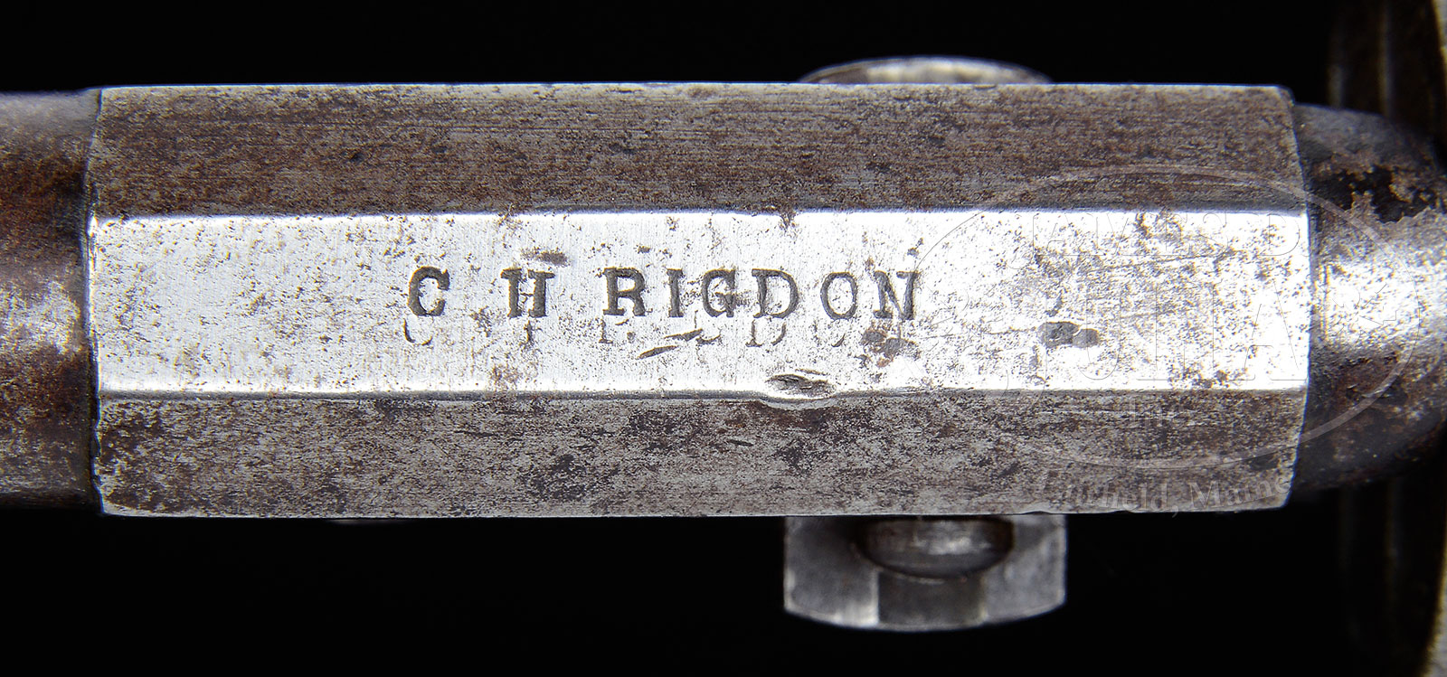 UNIQUE CONFEDERATE C.H. RIGDON 5″ BARRELED REVOLVER.NSN. Cal. 36. For the Confederate handgun collector who wants every model, this is the only “Pocket Sized” revolver known. There are only 6 C.H. Rigdon marked pistols known and the other 5 are all standard Navy models with 7-1/2″ bbls. This gun is pictured in William Albaugh’s text Confederate Arms,1957. Albaugh comments that in his opinion, “This is the arm from which the Rigdon-Ansley were modeled.” In Frank Seller’s and Sam Smith’s book American Percussion Revolvers Sam Smith states that he believed this gun to have been Charles Rigdon’s personal gun. This gun has remained in the same collection for all these years until 2013. Regardless of the thoughts of these respected early authors on Confederate arms, studying the other Rigdon revolvers known, I have little doubt that this gun was made near the end of production. There is no doubt this gun was made as a 5″ barreled revolver and is not simply a “cut-down” Navy revolver. The cylinder is over 5% shorter than standard production Rigdon & Ansley revolvers. The back of frame and arbor are correspondingly milled to accept this shorter cylinder. In the opinion of this cataloger, this gun, like a few late Griswold’s and Spiller & Burr’s, were privately purchased and had non-military features such as special finishes and higher grade grips, such as the burled and varnished grips seen on this unique gun. The loading assembly latch, bbl catch and front sight are identically made to those seen on late production Rigdon & Ansley’s, further substantiating the originality and authenticity of this unique revolver. There is only one other identically marked “CH RIGDON” revolver and it is among the highest SN of standard Rigdon & Ansley production, 2316. One other “CH RIGDON” gun is known, also marked “AUGUSTA GA”, that being SN 1490, which is among the earliest 12 stop revolvers (1482 is lowest SN known, no maker’s mark). Three other “CSA” marked and inspected “CH RIGDON, AUGUSTA GA” standard Navy revolvers are known (SN 2154, 2180 and 2182). Two features that stand out substantiating this gun as late production are the “milled cap release channel” and wedge is “non-spring” type (first seen approximately SN 2150). When Herman Stumpf sold his gun collection in the 1950’s he only retained this unique 5″ “pocket sized” revolver he felt was Charles Rigdon’s personal gun. This gun is in wonderful condition for a Confederate revolver. PROVENANCE: Herman Stumpf collection; pictured pg 13 Albaugh “Confederate Arms’, 1957; pictured and described in Sellers & Smith “American Percussion Revolvers”, 1971; Outstanding estate collection of Confederate and historical arms of Morris Racker. CONDITION: Very good to fine overall. Appears all orig and authentic with exception of lap welded repair to mainspring and missing screw in backstrap. Metal overall is gray with tiny traces of blue finish in protected areas with scattered staining and pitting. Brass backstrap and trigger guard have mustard colored patina. Stocks retain 40-50% of their orig varnish. Rifling in bbl is well defined, though pitted overall. Gun functions mechanically though mainspring is weak. There are discernible tool marks on frame, bbl and cyl, typical of other late production guns. Maker’s mark on bbl is easily discerned, as can be seen in photos. A rebound of die can be seen in a ghost of some letters, this is noted also on other examples as marking identical on all. There are no other external marks but internally there are a pair of punch marks on wedge and backstrap. There is a large punch mark on left side of trigger guard that possibly removed “cryptic” often seen stamped on standard production Augusta made revolvers. 51957-2 JS (30,000-40,000) – Lot 1261 | Click here to view provenance
