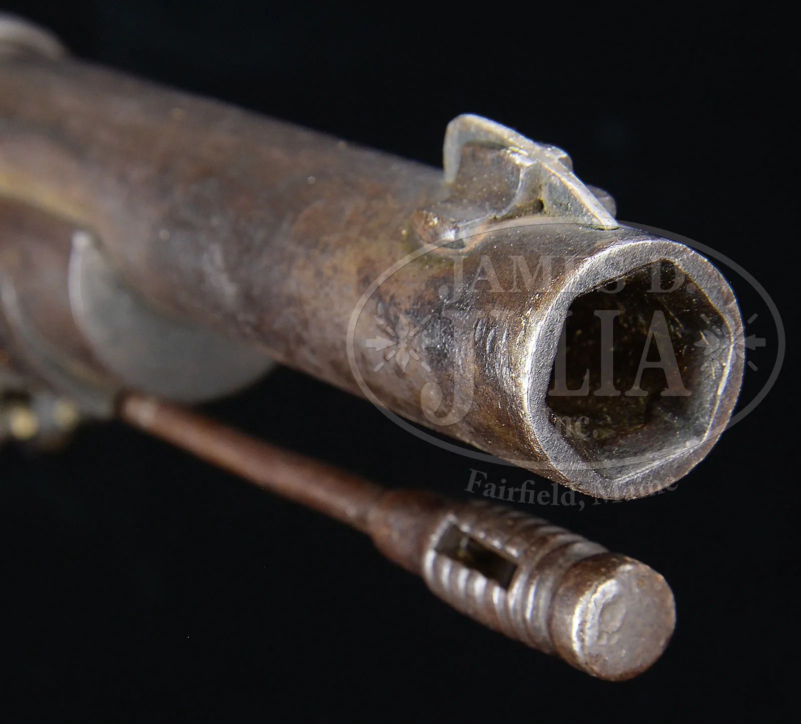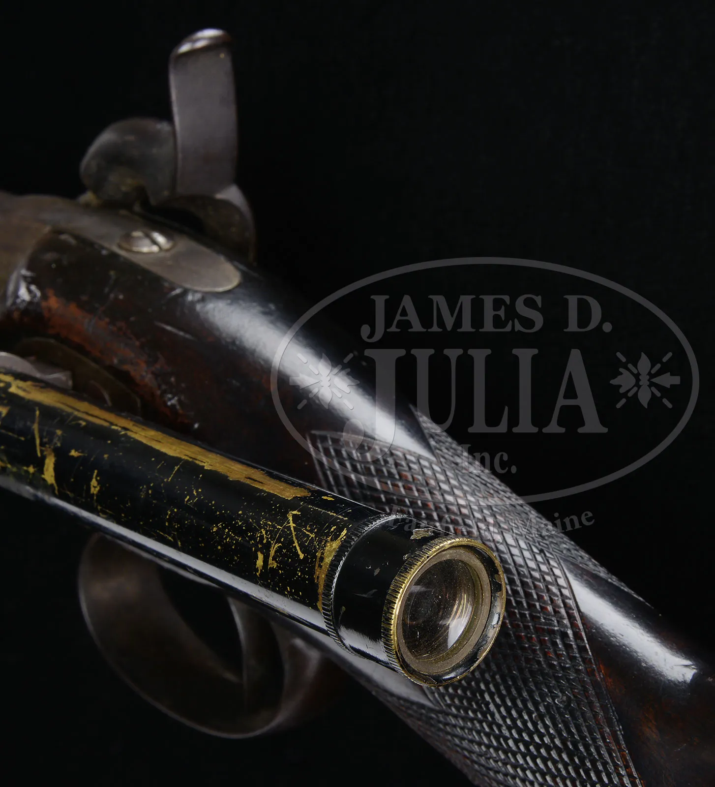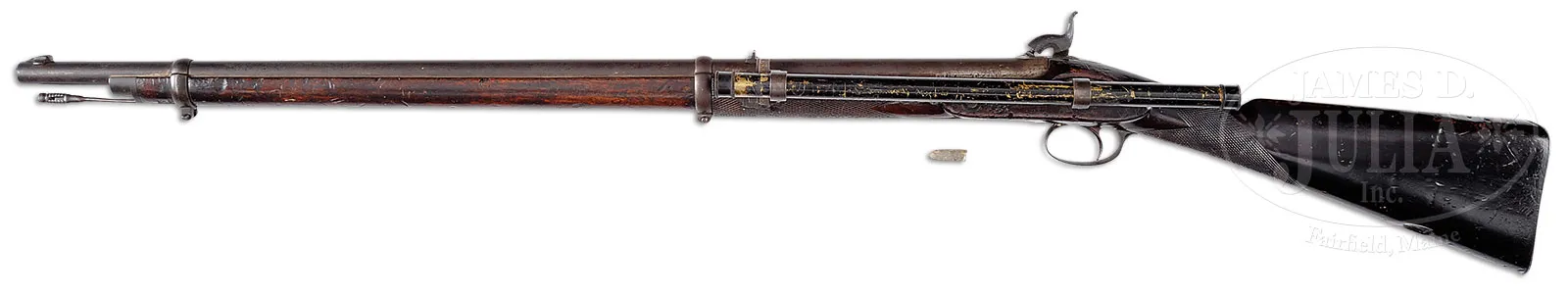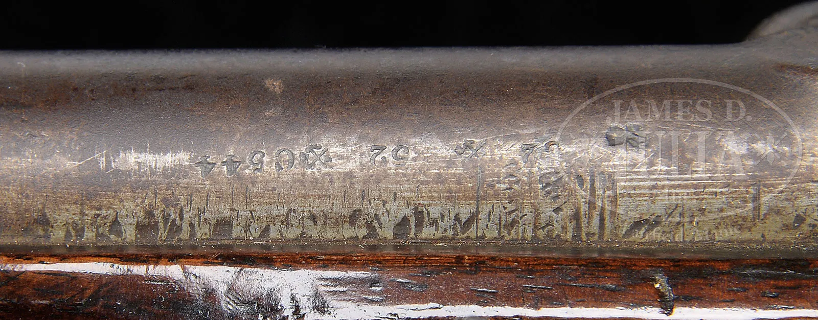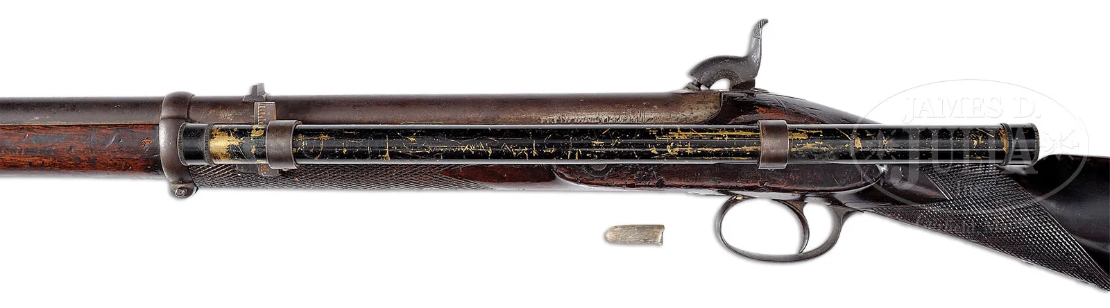 EXTREMELY RARE CONFEDERATE SCOPED 2ND QUALITY WHITWORTH SHARP SHOOTER’S RIFLE.SN C544. 52 bore, .451 cal, with Whitworth’s distinctive hexagonal bore. There are 19 SNs known on scoped 2nd Quality Whitworth rifles. This example falls within this range that saw Confederate service, B509 and the highest C619. This gun conforms to the other examples known with “WHITWORTH RIFLE CO MANCHESTER” forward of hammer on lock and Crown over “W” rear of hammer and engraved on trigger guard plate “2ND QUALITY”. Bbl marked on left of breech with Birmingham proofs, “52” gauge markings and SN “C544”. Matching SNs are also found on lock, trigger guard, breech, major screws, bbl bands and other parts not removed to check internally for SNs. The Japanned brass tube Davidson scope was adjusted for elevation by turning the knurled knob on the right side of the forearm. This loosened the clamp on the left side so the 1-1/2″ bar graduated in 1/16″ increments could be raised and lowered, pivoting on the rear mount secured by the rear lock plate screw. There is extensive documentation accompanying this rifle, along with correspondence regarding the use of these guns during the Civil War. This gun was originally found with the telescopic sight and mounts missing which were later restored. This gun is just 10 numbers removed from the Whitworth which is part of the Chickamauga National Park Museum (SN C554) which is pictured in Firearms of the Confederacy (1944), plate XXIII and discussed on pages 27 and 28. C544 is in the database of The English Connection by Russ Pritchard and C. A. Huey. This text is the most definitive and recent book on Confederate imports from Britain. This is an extremely rare Confederate sniper’s rifle with well defined bore and original Davidson scope with excellent optics. Rifle is accompanied by a battlefield recovered Whitworth bullet with letter of provenance. PROVENANCE: Joe Deserich collection; outstanding estate collection of Confederate and historical arms of Morris Racker. CONDITION: Iron is brown overall with staining and pitting. Gun appears orig and matching with addition of restored scope and mounts. The bbl is proper 33″ including internal beveled crown to fit projectile to bore. Stock is sound with old refinish and several large gouges and crack repair at wrist. Restoration was done by master craftsman Louie Parker of Jackson, Missouri. Checkering is worn. Gun was not disassembled, but this gun is well known with old collection history. Ramrod is newer addition. Mechanically sound with crisp well defined bore. Scope has good optics with crosshairs. 51957-23 JS (40,000-60,000) – Lot 1281 Click here to view provenance