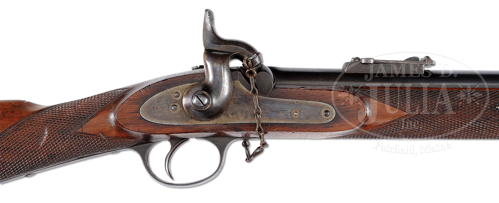 EXTREMELY FINE & RARE PATTERN 1862 BRITISH MILITARY WHITWORTH SHARPSHOOTER’S RIFLE, USED IN FIELD TRIALS.SN UNK. Cal. 52 bore, .451 cal. This rare 1863 dated Enfield rifle with broad arrow proof has 33″ bbl with Whitworth’s unique hexagonal 52 bore. Gun is made for bayonet that attached to front band and has long range adjustable ladder sight, which is marked “C” on right and “H” on left showing two separate ranges for use of either “Conical” or “Hexagonal” ammunition. The British military version Pattern 1863 which would eventually be adopted from of this rifle is more common with 36″ bbl and 3-bands. Subject rifle here is same configuration of Confederate used versions, however British military is of 1st quality. Tim Prince, co-author of The English Connection” stated “these 1,000 rifles were utilized in various field tests, and were commented upon favorably enough for the Board of Ordnance to authorized the production of 8,000 more rifles for field trials. These rifles, which would become the Pattern 1863 Whitworth Rifle, had slightly shorter barrels, at 33”, due to the fact that the barrels were made of steel rather than iron, and consequently weighed more than their iron counterparts. The new P-1863 also incorporated some minor improvements in the rear sight, and introduced a bayonet lug on the upper barrel band to accept a bayonet based upon the Pattern 1856 saber bayonet. The reason the bayonet lug (“bar” in English terminology) placed on the upper barrel band rather than directly on the barrel was the belief that it would be too difficult to adequately weld the bayonet lug directly to the steel barrel. As a result, the upper band was of the wide variety with a transverse pin through the band and stock for additional support. This pattern of barrel band had been introduced for the P-1856 Type II (or P-1858) “Bar on Band” series of rifles. These 8,000 rifles were produced at R.S.A.F. and were issued to a large number of regiments for field trials. In general, 68 of the rifles were issued each of the regiments that received them for trial (possibly to equip the “light companies”), and field reports were to be complied regarding the rifles in service performance over the next few years. At least 12 regiments not in service in Indian were issued the new P-1863 Whitworth Rifle, including the 2nd Battalion Grenadier Guards, 1st Battalion Scots Fusilier Guards, 1st Battalion 3rd Foot, 2nd Battalion 5th Foot, both 1st & 2nd Battalion of the 60th Rifles and the 73rd Foot. Five additional regiments in Indian service were also issued the rifles, including the 42nd Highland Foot and 2nd Battalion Rifle Brigade. In general, the reports from the field were quite similar, the rifles tended to foul badly when used in hot environments. In many cases it was difficult for the average solider to ram more than a half dozen rounds before the rifle became too fouled to load. When combined with the much higher cost per unit versus a standard P-1853 Enfield rifle musket, as well as the slower rate of fire, it quickly became obvious that the P-1853 was more than sufficient for the typical needs of the line infantry, and that even though the Whitworth had tremendous advantages in accuracy, it was not practical weapon for general issue. Although the guns remained in limited experimental issue through 1867-1868 with many of the regiments testing them, they were never considered a potential replacement for the P-1853 Enfield. In the end, the Whitworth design became an anachronism that proved the potential for smaller bore rifle accuracy, but at a time when the age of muzzle loader was coming to an end and the metallic cartridge breechloader was about to change the world of warfare forever. The Pattern 1863 Whitworth rifles were eventually returned to storage and eventually sold as surplus, becoming a sort of footnote in the history of 19th century British military small arms development. While the rifles never made a significant difference in the British military, they did manage to gain iconic status in the hands of a few of Confederate sharpshooters, and at the shooting competitions at Wimbledon, insuring that the Whitworth Rifle would never be merely a footnote to arms historians and collectors.” PROVENANCE: Outstanding estate collection of Confederate and historical arms of Morris Racker. CONDITION: Very fine. Bbl retains 90%+ original thinning blue finish. Lock and hammer retain 60% of their bright case colors. Mechanically excellent with crisp, bright bore. Stock has several dings and dents and an indiscernible stock marking with fairly crisp checkering. 51957-24 JS (10,000-15,000) – Lot 1282 Click here to view provenance