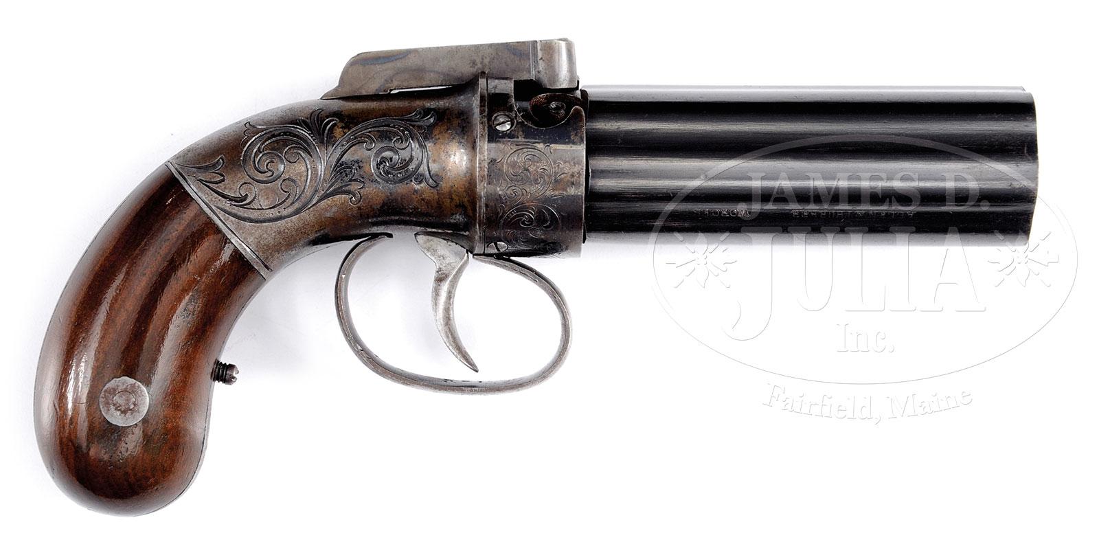 EXTREMELY FINE CASED ALLEN & THURBER PEPPERBOX REVOLVER.Cal. 32. Gun is 7-3/4″ overall with 3-1/2″ 6-bbl cluster retaining most of its finish with equally fine accessories including a very unusual 2-cavity mold which molded “ovoid”, almost egg-shaped projectiles which several loose examples found in casing. Rare, early plunger flask and wood handled loading tool. All found in burgundy lined compartmentalized mahogany casing. PROVENANCE: Outstanding estate collection of Confederate and historical arms of Morris Racker. CONDITION: Extremely fine, retaining 98% orig bright blue on bbls. Bright case colors on hammer. Frame and trigger guard retain about 20% bright blue. Grips retain virtually all their orig high polish piano-type varnish. Mechanically crisp. Mold has staining and light pitting. Flask retains about 70% orig varnish. Casing sound with old pry marks and broken clasp to lock, Interior is very good with fading and soiling. 51958-22 JS (3,000-5,000) – Lot 3211