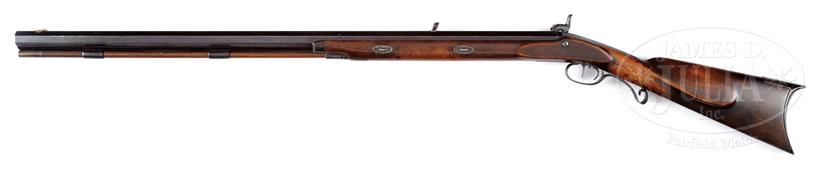 FINE “S HAWKEN ST LOUIS” HALF-STOCK PLAINS RIFLE.NSN. This appears to be an honest, complete, 58 caliber, 50″ overall, 33-1/2″ full oct bbl. Iron mounted with German silver blade front sight. Marked on top of bbl “S.HAWKEN ST. LOUIS”. Set triggers, dbl keys. PROVENANCE: Pictured plate 61, page 46, John D. Baird’s text “The Mountain Man’s Choice”. Outstanding estate collection of Confederate and historical arms of Morris Racker. CONDITION: Very good overall, good marking, functional action, with clean crisp rifled bore. Stock is sound and solid. Refinished with small cosmetic blemishes. Brass tipped ram rod has iron tip threaded for worm, correct style for era, but added. Nose-cap is professional restoration by Louie Parker. 51958-28 JS (5,000-7,000) – Lot 3289 Click here to view provenance