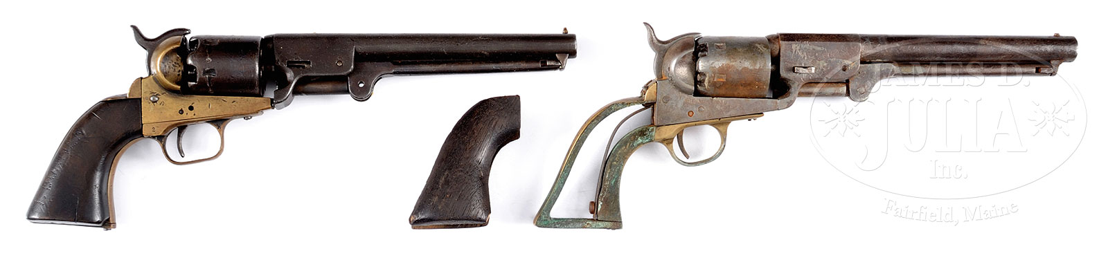 PAIR OF FAKE CONFEDERATE REVOLVERS.SN 58,582. Cal. 36. There are many fake Confederate revolvers offered as original and there have been many sold in auction as original. 1) There are only 3 complete Columbus Firearms pistols known and SN 58 is one of the numerous fakes that have been made over the years. Cataloger is not sure what this gun started out as, but possibly made from scratch with similar small SNs seen by this extremely rare manufacturer. Full fraudulent manufacturer’s address on bbl and cylinder. 2) Griswold 1st Model revolver SN 582, most likely made and artificially aged from a Navy Arms brass framed reproduction with added markings. PROVENANCE: Outstanding estate collection of Confederate and historical arms of Morris Racker. CONDITION: 1) Artificially aged and pitted. Fair overall. Mechanically not functional, but appears complete. 2) Also fair. Missing several screws and wedge. 51958-37 JS (2,000-3,000) – Lot 3471