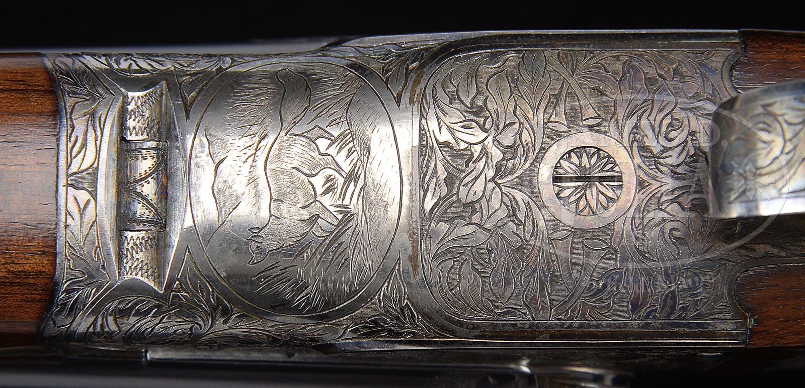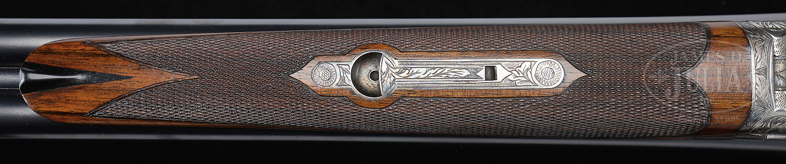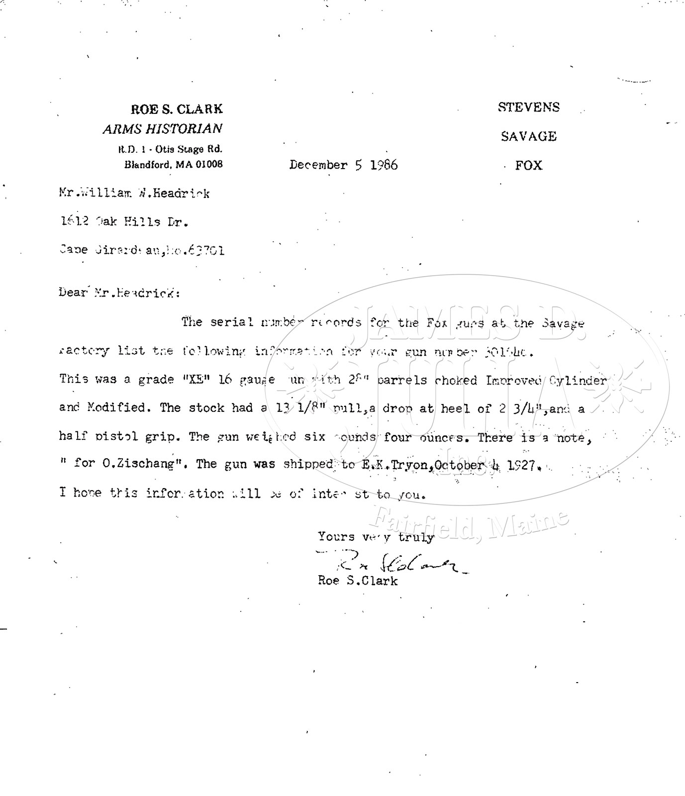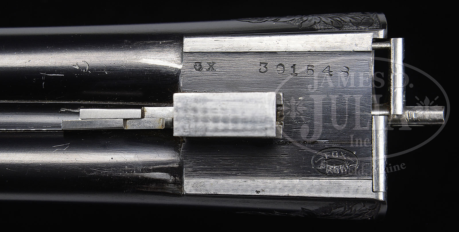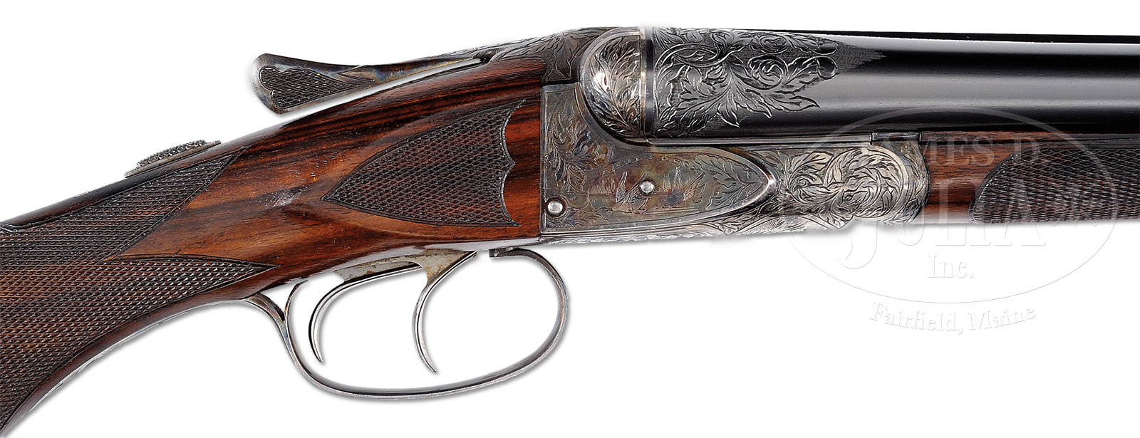 *RARE, AS FOUND, HIGH ORIGINAL CONDITION SMALL BORE PHILADELPHIA FOX “XE” SHOTGUN WITH FACTORY LETTER.SN 301648. Cal. 16 ga. 2-1/2″ Chambers. 28″ Bbls are stamped “CHROMOX FLUID COMPRESSED STEEL” and “MADE BY A. H. FOX GUN CO. PHILA. PA U.S.A.” on tops either side of slightly raised, matted rib. Breech ends are engraved with second generation “X” grade 2″ triangles of large shaded scroll and acanthus. Bbl flats are stamped with SN, grade, and Fox proof. Cocking slide and sides of bbl flats are engine turned. Breech ends of bbls are damascened. Striking weight “3” is stamped on bottoms of bbls. Case hardened action with rebated frame, features automatic safety (SAFE engraved), and dbl triggers. Action is engraved with near full coverage bold open scrolling acanthus which surrounds vignettes of snipe on left, and grouse on right. Fences are also acanthus engraved. “ANSLEY H. FOX” is over each bird scene. Bottom of action depicts a bushy tailed fox in mountainous background within oval border. Trigger plate is engraved with more acanthus scroll. Trigger guard has more scroll flanking vacant shield. SN is on tang. Well streaked and lightly figured European walnut round knob pistol grip buttstock measures 13-1/2″ over essentially flattened leather covered Silver pad. Side panels are checkered and checkering at grip is of modified point pattern with fancy back. A silver oval on toe line is engraved with indecipherable monogram. Typical high grade Fox extra long splinter forend with inset schnabeled ebony tip, is checkered to match buttstock. Interior of iron is engraved with patent dates. Bore diameter: left -.661, right – .657. Bore restrictions: left – .019 (mod), right – .008 (IC). Wall thickness: left – .031, right – .032. Drop at heel: 2-11/16″, drop at comb: 1-5/8″. Neutral cast. Weight: 6 lbs. 2 oz. LOP: 13-1/2″. PROVENANCE: Clark letter giving specifications from orig build card and stating gun was originally built for “O. Zischang” most likely “W. O. Zischang” the son of famed rifle smith “A. O. Zischang” who died in 1925. Estate collection of Dana Tauber. CONDITION: Excellent, original as found. Bbls retain 95 – 98% orig blue, with only some light handling marks and rubs. Engine turning and damascening are strong. Action retains 70 – 80% orig case hardening color, pleasingly silvered around bottom and fences from normal hand wear. Thumbpiece is slightly silvered as is trigger guard tang. Color on forend latch is thinning at rear. Stocks retain nearly all their orig finish with some light marks. Later pad has rubber considerably flattened and deteriorated. Orig factory specifications were for a LOP of 13-1/8″ and wood is at its orig length of 13″, giving a 13-1/8″ LOP with a thin buttplate, or 14″ with a new pad. Bores are excellent. Action is tight. Ejectors are strong and in time. It is estimated that only 90 “XE” 16 bores were made, 79 in Philadelphia. 51980-10 MGM (9,000-14,000) C&R – Lot 1421 Click here to view provenance