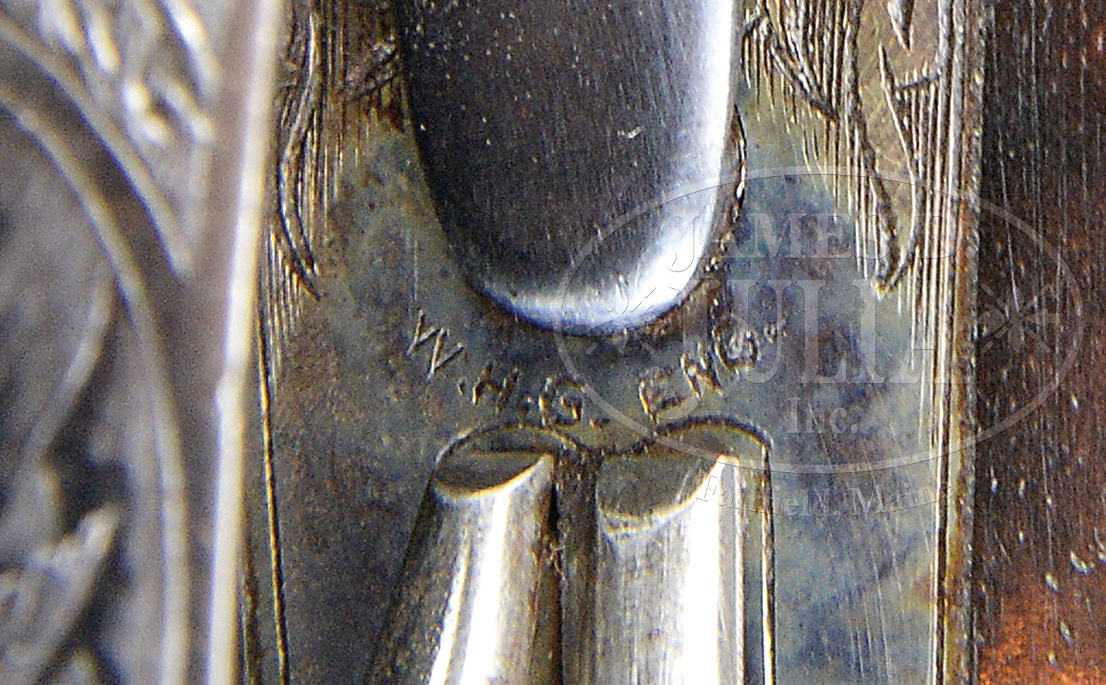 *EXCEPTIONALLY RARE (ONE OF THREE) AND EXTREMELY FINE 20 BORE A. H. FOX “FE” SHOTGUN WITH SPECIAL GOLD INLAYS WITH CALLAHAN LETTER.SN 202194. Cal. 20 ga. 2-1/2″ Chambers. 28″ Bbls with narrow, matted rib, and special order ivory and copper Lyman bead, are hand engraved “CHROMOX FLUID STEEL” “MADE BY A. H. FOX GUN CO. PHILA. PA U.S.A.” on tops. Breech ends are engraved with classic “F” grade 3″ triangles of large scroll and acanthus bisected by gold inlaid lightning bolts. 3/16″ Bands of geometric engraving are around muzzles. Bbl flats are hand engraved with SN, grade, and stamped with Fox proof. Sides of flats, cocking slide, and breech ends of bbls are damascened. Bottoms of bbls are stamped with striking weight “3”. Small sized case hardened action with rebated and dbl ogee backed frame, features automatic safety (SAFE inlaid in gold), and dbl triggers. Water table is hand engraved with patent dates, SN, and grade. Action is engraved with full coverage well done open shaded scroll with acanthus and floral highlights which surrounds unusual dbl vignettes of gold inlaid dogs; pointers on left side in mountainous backgrounds, and setters on right in open meadows. There are gold bands around fences and gold inlaid stars on hinge pin heads. “ANSLEY H. FOX” is in arched band above rear dog scenes. Bottom of action depicts ruffed grouse with four chicks in woodland scene within fancy border. Trigger plate is engraved with scroll, acanthus, and flowers to match remainder of action. In front of triggers engraver signature “W.H. Gough” noted in tiny print, an extreme rarity on a Fox. Trigger guard has more scroll flanking twin vignette of flying snipe. SN is in gold on tang. Round knob pistol grip buttstock is of very finely marbled and lightly figured dense European walnut, and measures 14″ over leather faced Silver pad. Side panels have closely spaced checkering with attractive fleur-di-lis intrusions. Borderless checkering at grip is of fancy crenelated pattern shot through with ribbons and fleur-di-lis in typical “FE” style. A gold shield on toe line is engraved “Chester Snyder”. Typical high grade Fox extra long splinter forend with inset schnabeled horn tip, is checkered to match buttstock in fancy pattern with ribbons and fleur-di-lis. Interior of iron has wiggle and line border engraving, and standard roll stamped patent dates. Bore diameter: left -.623, right – .624. Bore restrictions: left – .032 (full), right – .018 (mod). Wall thickness: left – .022 (one very small area 6″ back from muzzle, mostly .026), right – .026. Drop at heel: 2-7/8″, drop at comb: 1-11/16″. Neutral cast. Weight: 6 lbs. 1 oz. LOP: 14″. PROVENANCE: Callahan letter confirming specifications and specifying Chester Snyder as orig consignee, and with his name engraved on shield. Copy of build card for 202194 confirming specifications. Letter, discussing another SN, (202698) with comparisons to this item. Estate collection of Dana Tauber. Ex: Tom Kidd and Jack Puglisi Collections. CONDITION: Excellent. Bbls retain essentially all of a very light sympathetic touch-up blue added to areas on sides of bbls over some evidence of light marks and wear. Damascening appears orig and is strong. Action retains most of its orig case hardening color, actual percentage difficult to ascertain because of extensive engraving, but most likely is in excess of 70%. Bottom of action (bird scene) is gray to light brown. Trigger guard retains most of its bright original blue on bow, silvering on tang. Stocks retain nearly all of their orig finish with numerous old marks and dings, and some rubs and thinning on toe line. Checkering is untouched, a bit dirty, with light wear. Pad appears to be orig, alligatored on sides, and flattened at heel. There is a slight 3/4″ grain check on left side panel running from center of bottom ogee back into checkering, which appears to have been repaired by factory at time of manufacture. Bores are excellent, bright and shiny throughout, with no visible imperfections. Action is tight. Ejectors are strong. One of the finest small bore Fox’s extant, factory records indicate a total of 6 “FE” 20’s made, only 3 in Philadelphia. The double dog treatment is very unusual with only one other FE Grade known engraved in this pattern which is offered elsewhere in this sale. Special Note: This item(s) contains plant or animal properties that may be covered by the Endangered Species Act (ESA). Please read the Conditions of Sale, section 15, for more information regarding the Endangered Species Act, and your responsibilities as a buyer. 51980-12 MGM (150,000-225,000) C&R; ESA – Lot 1403 | Click here to view provenance