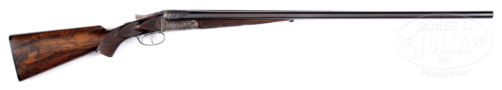 SN 22490. Cal. 12 ga. 3″ Chambers. 32″ Bbls are stamped “Krupp Fluid Steel” and “MADE BY A. H. FOX GUN CO. PHILA. PA ” on tops either side of slightly raised, matted rib, with front ivory bead. Breech ends are engraved with second generation “X” grade 2″ triangles of large shaded scroll and acanthus. Bbl flats are stamped with SN, grade, and Fox proof. Case hardened action features automatic safety (SAFE engraved), and dbl triggers. Action is engraved with near full coverage bold open scrolling acanthus which surrounds vignettes of snipe on left, and grouse on right. The engraving on the sides of this gun is exceptionally deep. Fences are also acanthus engraved. “ANSLEY H. FOX” is over each bird scene. Bottom of action depicts a bushy tailed fox within oval border. Trigger plate is engraved with more acanthus scroll, but not as deep as action. Trigger guard has more scroll flanking vacant shield. SN is on tang. Very finely figured and well marbled dense European walnut pistol grip buttstock measures 13-3/4″ over ribbed composition buttplate. Pistol grip ends in an ogee flourish instead of being capped. Side panels are checkered and checkering at grip is of modified point pattern in two sections separated by ribbons. Typical high grade Fox extra long splinter forend with inset schnabeled ebony tip, is checkered to match buttstock. Interior of iron is engraved with patent dates. Bore diameter: left -.727, right – .727. Bore restrictions: left – .034 (full), right – .021 (mod). Wall thickness: left – .032, right – .030. Drop at heel: 2-1/2″, drop at comb: 1-1/2″. Cast about 1/4″ on. Weight: 7 lbs. 4 oz. LOP: 13-3/4″. PROVENANCE: Callahan letter giving specifications from orig build card and stating gun was originally built with single selective trigger. (It appears gun was returned to factory for new trigger plate and trigger guard at some time.) Estate collection of Dana Tauber. CONDITION: Excellent. Bbls retain nearly all of a well done rust re-blue, over some light scratches and marks, with subsequent silvering on rib. Action retains 70 – 80% orig color, silvered and thinned on fences and beads, considerably lightened on bottom of action (color was never very strong.). Trigger guard retains nearly all of what appears to be its orig blue with some small rust stains. Stocks retain most of their orig hand rubbed oil finish with a number of light marks and compressions. Checkering lightly worn. Bores are very fine to excellent, very lightly frosted. Action is tight. Ejectors are strong and in time. Special Note: This item(s) contains plant or animal properties that may be covered by the Endangered Species Act (ESA). Please read the Conditions of Sale, section 15, for more information regarding the Endangered Species Act, and your responsibilities as a buyer. 51980-13 MGM (8,000-12,000) C&R; ESA – Lot 1422