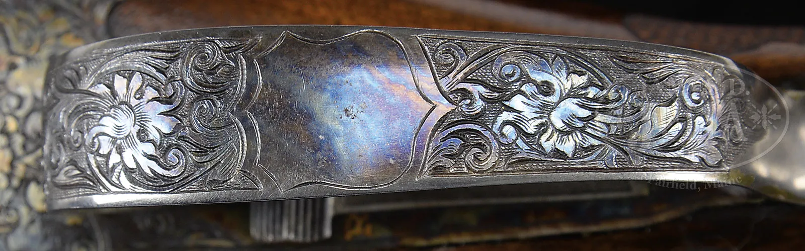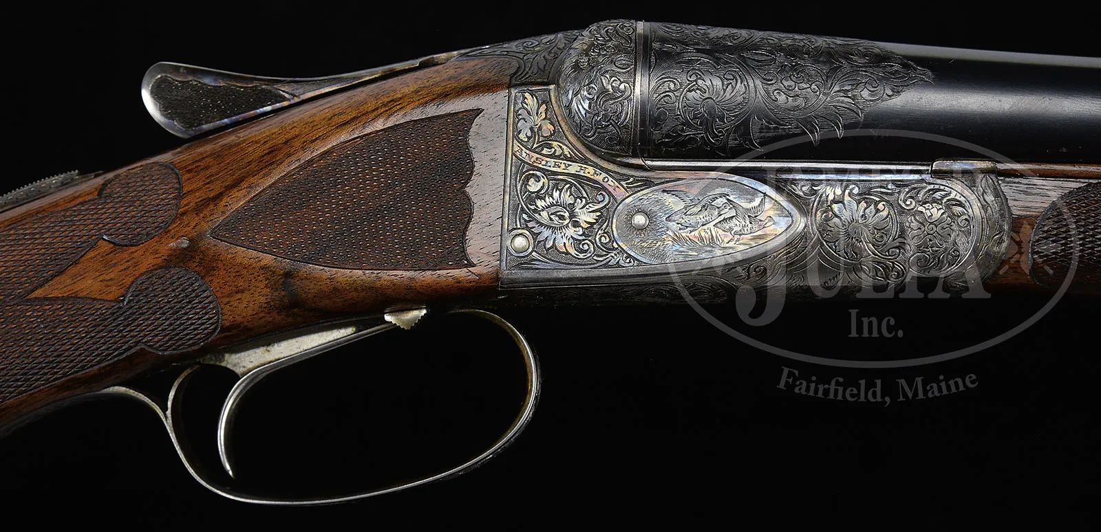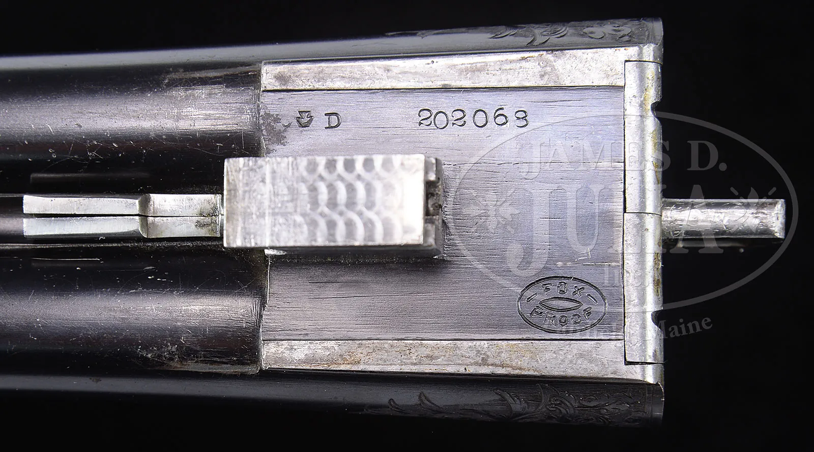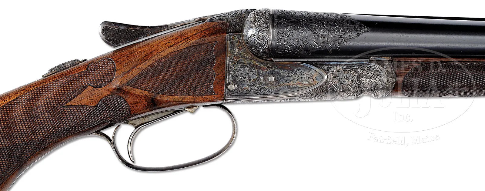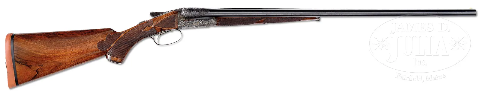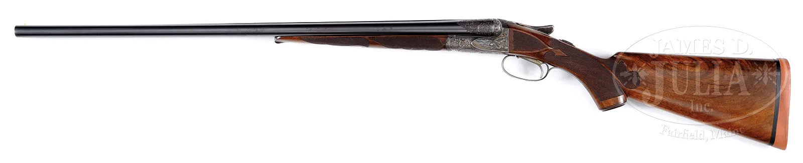 *VERY RARE (54 PRODUCED) HIGH ORIGINAL CONDITION SPECIAL ORDER FOX 20 GAUGE “DE” SHOTGUN WITH SINGLE TRIGGER.SN 202068. Cal. 20 ga. 2-1/2″ Chambers. 26″ Bbls with matted rib holding two ivory beads, are hand engraved “CHROMOX FLUID STEEL” “MADE BY A. H. FOX GUN CO. PHILA. PA. U.S.A.” on tops. There are 2″ triangles of open, shaded, scrolling acanthus at breech ends. Bbl flats are stamped with grade, SN and Fox proof. Sides of flats and cocking slide are engine turned. Small rebated frame, case hardened action has all correct markings on water table, patent info is hand engraved. Action features automatic safety (SAFE in gold) and Kautzky single selective trigger. Action is engraved in classic late “D” style with full coverage shaded scrolling acanthus surrounding oval vignettes of game birds; snipe flying over marsh on left and quail flying over marsh on right. “ANSLEY H. FOX” is on riband at upper rear of each scene. Bottom of action depicts a setter standing in meadow within crenelated border. Trigger plate is engraved with acanthus matching action. Case hardened trigger guard has matching acanthus flanking central shield on box, with SN at grip. Well marbled European walnut Fox capped extra long (obviously special order) pistol grip buttstock measures 13-5/8″ over black leather faced Silver pad. Side panels are checkered and fancy pattern checkering with lozenge intrusion and scroll flourishes into butt, is at grip. Matching long slim ejector forend with inset ebony tip, has Fox’s Deeley type release. Interior of iron has border engraving and has all correct marks and numbers. Bore diameter: left -.616, right – .615. Bore restrictions: left – .018 (mod), right – .007 (IC). Wall thickness: left – .031, right – .031. Drop at heel: 2-3/8″, drop at comb: 1-13/16″. Cast 1/4 on. Weight: 5 lbs. 15 oz. LOP: 13-5/8″. PROVENANCE: Estate collection of Dana Tauber. CONDITION: Excellent. Bbls retain 90 – 95% orig blue, thinning slightly on sides from normal hand wear, with a few cleaned minor rust spots. Action retains approx 90% orig case hardening color, silvered on high edges and thinning on bottom. Trigger guard retains most of its orig color, silvered at grip. Stocks retain most of an old hand rubbed oil finish, possibly orig, with some minor marks and nicks. Checkering cleaned and slightly worn. Newer pad is somewhat flattened. Bores are excellent with some light scratches. Action is tight. Mechanically excellent. An extremely rare small bore Fox. Factory records indicate a total production of 54, 49 in Philadelphia. Special Note: This item(s) contains plant or animal properties that may be covered by the Endangered Species Act (ESA). Please read the Conditions of Sale, section 15, for more information regarding the Endangered Species Act, and your responsibilities as a buyer. 51980-36 MGM (27,500-42,500) C&R; ESA – Lot 1412