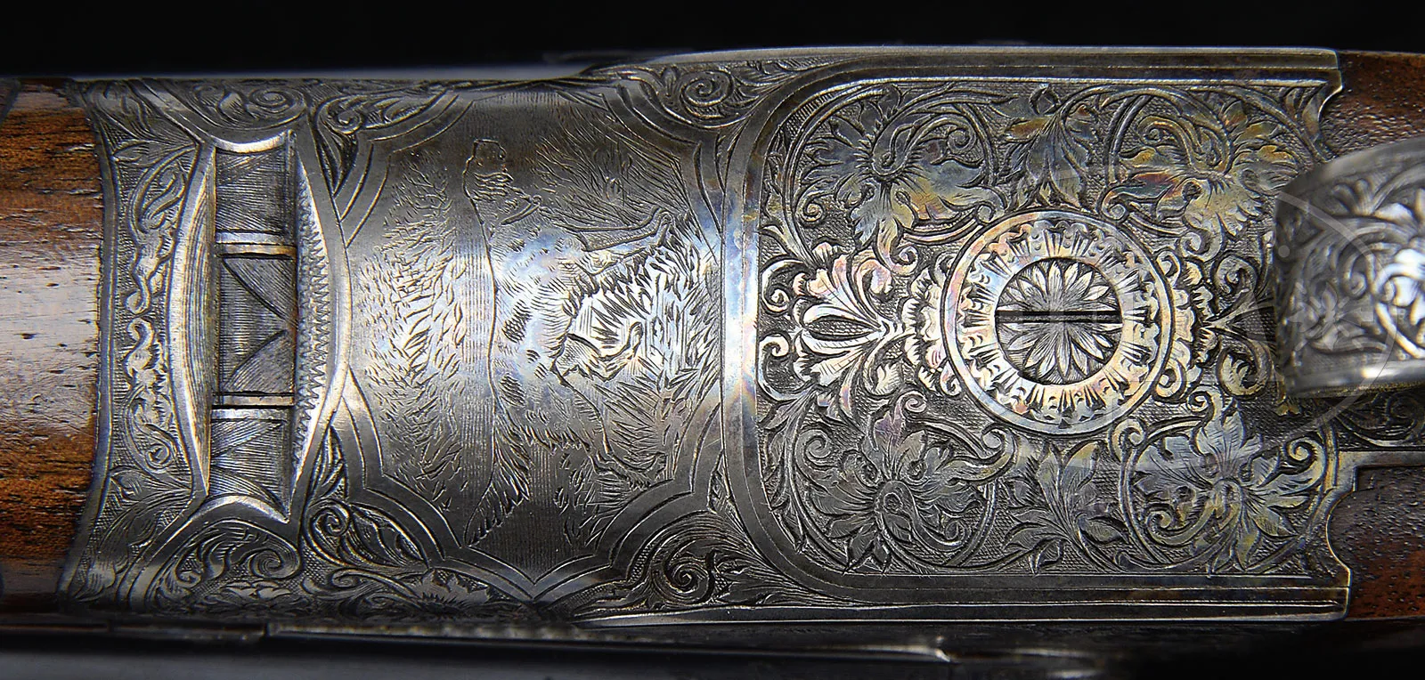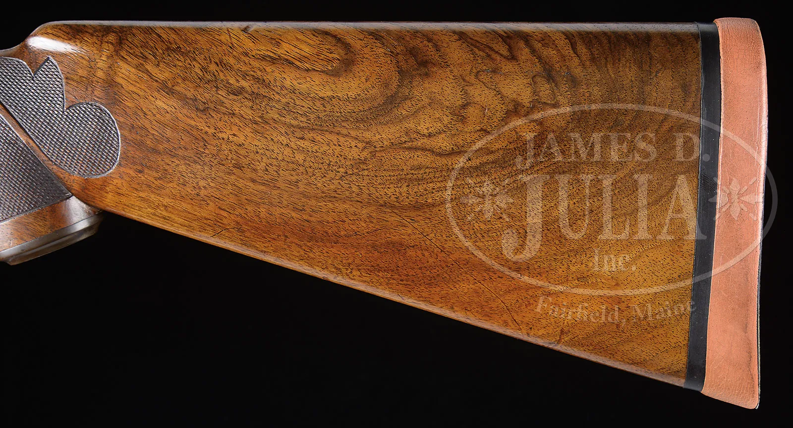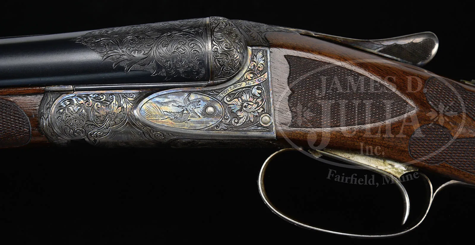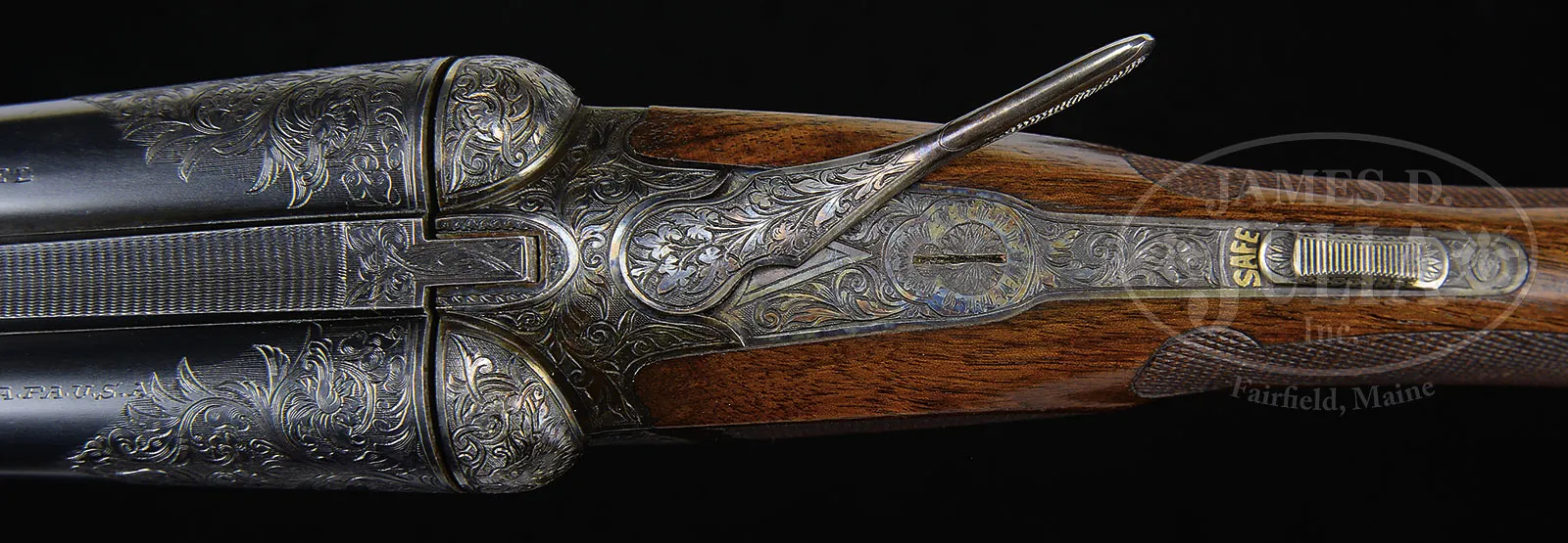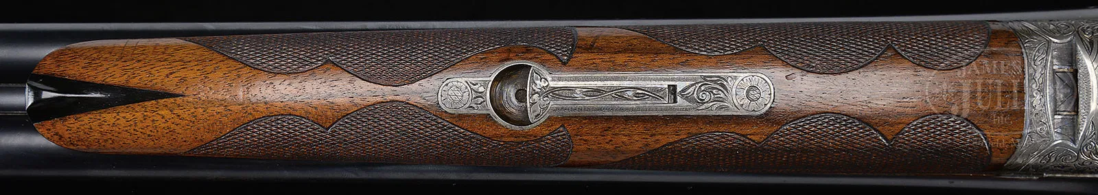 *VERY RARE (54 PRODUCED) HIGH ORIGINAL CONDITION SPECIAL ORDER FOX 20 GAUGE “DE” SHOTGUN WITH SINGLE TRIGGER.SN 202068. Cal. 20 ga. 2-1/2″ Chambers. 26″ Bbls with matted rib holding two ivory beads, are hand engraved “CHROMOX FLUID STEEL” “MADE BY A. H. FOX GUN CO. PHILA. PA. U.S.A.” on tops. There are 2″ triangles of open, shaded, scrolling acanthus at breech ends. Bbl flats are stamped with grade, SN and Fox proof. Sides of flats and cocking slide are engine turned. Small rebated frame, case hardened action has all correct markings on water table, patent info is hand engraved. Action features automatic safety (SAFE in gold) and Kautzky single selective trigger. Action is engraved in classic late “D” style with full coverage shaded scrolling acanthus surrounding oval vignettes of game birds; snipe flying over marsh on left and quail flying over marsh on right. “ANSLEY H. FOX” is on riband at upper rear of each scene. Bottom of action depicts a setter standing in meadow within crenelated border. Trigger plate is engraved with acanthus matching action. Case hardened trigger guard has matching acanthus flanking central shield on box, with SN at grip. Well marbled European walnut Fox capped extra long (obviously special order) pistol grip buttstock measures 13-5/8″ over black leather faced Silver pad. Side panels are checkered and fancy pattern checkering with lozenge intrusion and scroll flourishes into butt, is at grip. Matching long slim ejector forend with inset ebony tip, has Fox’s Deeley type release. Interior of iron has border engraving and has all correct marks and numbers. Bore diameter: left -.616, right – .615. Bore restrictions: left – .018 (mod), right – .007 (IC). Wall thickness: left – .031, right – .031. Drop at heel: 2-3/8″, drop at comb: 1-13/16″. Cast 1/4 on. Weight: 5 lbs. 15 oz. LOP: 13-5/8″. PROVENANCE: Estate collection of Dana Tauber. CONDITION: Excellent. Bbls retain 90 – 95% orig blue, thinning slightly on sides from normal hand wear, with a few cleaned minor rust spots. Action retains approx 90% orig case hardening color, silvered on high edges and thinning on bottom. Trigger guard retains most of its orig color, silvered at grip. Stocks retain most of an old hand rubbed oil finish, possibly orig, with some minor marks and nicks. Checkering cleaned and slightly worn. Newer pad is somewhat flattened. Bores are excellent with some light scratches. Action is tight. Mechanically excellent. An extremely rare small bore Fox. Factory records indicate a total production of 54, 49 in Philadelphia. Special Note: This item(s) contains plant or animal properties that may be covered by the Endangered Species Act (ESA). Please read the Conditions of Sale, section 15, for more information regarding the Endangered Species Act, and your responsibilities as a buyer. 51980-36 MGM (27,500-42,500) C&R; ESA – Lot 1412
