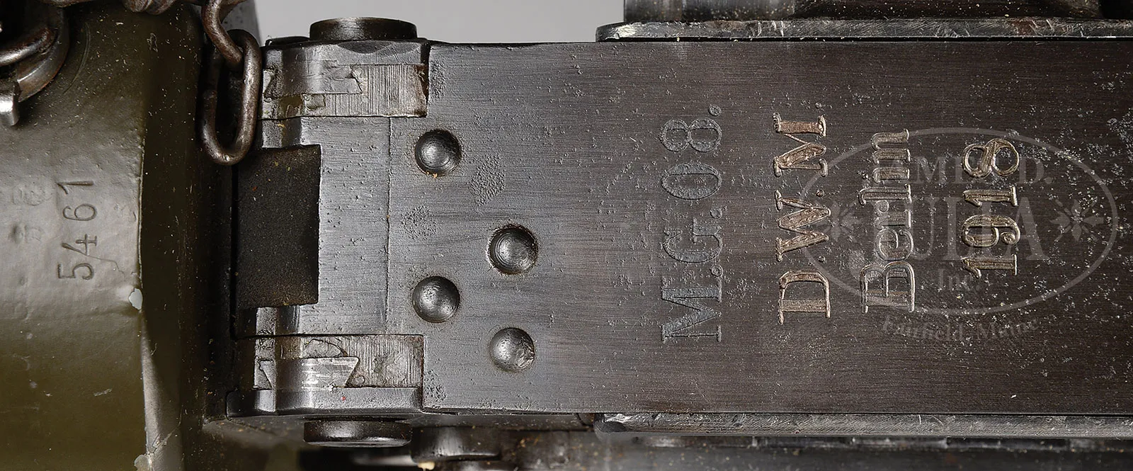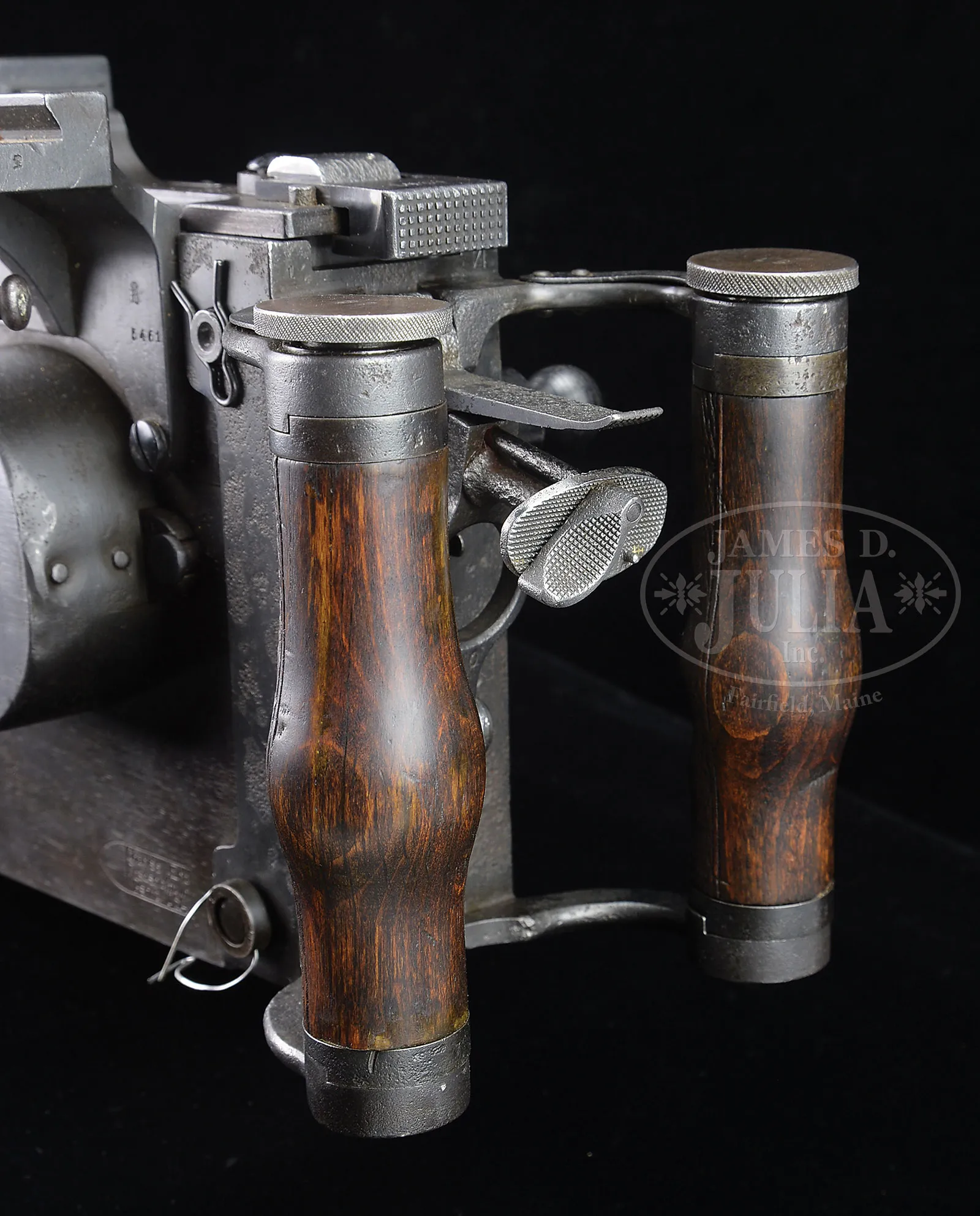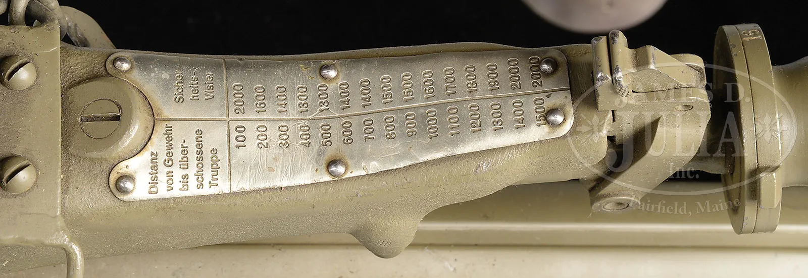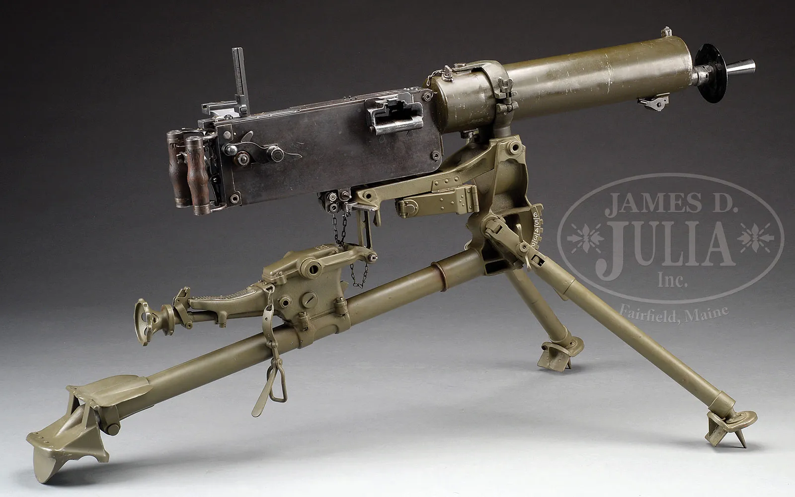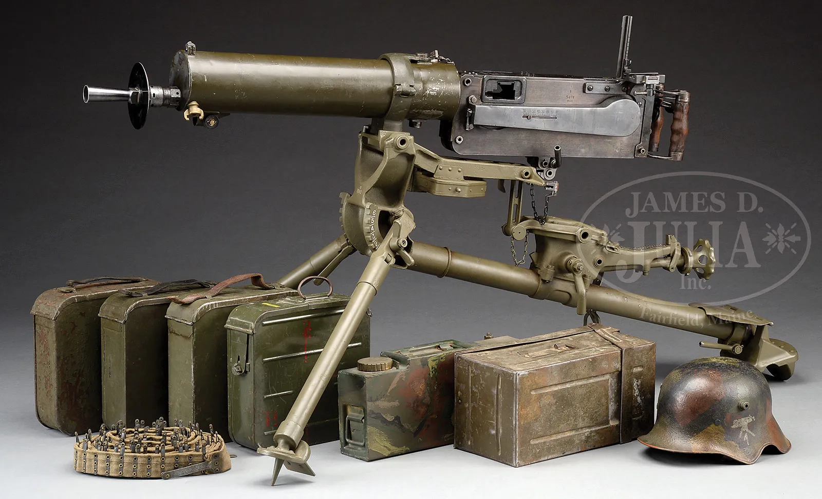 Please Note: 1) Magnificent addition: Consignor found and has provided an original C.E. JUNCKER mfg machine gunners badge. This is an extremely difficult find collector’s piece. 2) Please Note: There is a typographical error. The estimate should be $15,000-$20,000. In addition, the Finnish steel 7.62 Russian belt loading machine is not included with this lot. ***SHOOTER’S DREAM DWM MG-08 MAXIM MACHINE GUN AS REGISTERED BY ERB CONVERTED TO 7.62 RUSSIAN (FULLY TRANSFERABLE).SN 5461. Cal. 7.62x54R. 33″ bbl with flash hider. This attractive MG-08 Maxim was originally mfg by DWM Berlin in 1918. SN’s match on water jacket, top cover, left sideplate, fusee cover, and optic sight bracket. Gun has been registered by Charles Erb and left sideplate sports his bullet logo address below the fusee cover. Gun has been professionally converted to 7.62 Russian by adapting a Russian feed block, bolt, and charging handle, cross head and bbl. Cyrillic markings visible on cross head, charging handle and on top of feed block surface which has been renumbered to “12A”. Included with this lot is an original WWI Swiss tripod SN 7593 with trunnion adapter for MG-08, camouflaged “ear cutout” M-18 helmet with post-war replacement liner and chin strap, four Russian-style ammunition belt boxes; three with empty Finnish belt’s and one with steel cased 7.62 Russian ammo. Also included is one steel tabbed Russian cloth belt. Also a Finnish steel 7.62 Russian belt loading machine in its can and a camouflaged painted water can. Gun has a reproduction muzzle plate with Imperial proofed muzzle and bearing. Steam hose brass fitting at front of water jacket is a post-war replacement. The top cover extractor assist springs are replacements, with the heads of the attachment screws visible on top cover. Water jacket fill cap chain is present however, wooden/hard rubber thumb piece is not present. Seven crates of 7.62 x 54 Russian ammo in sealed tins (approx 6200 rounds) are included with this lot. This is a National Firearms Act item and requires BATF approval prior to transfer. This item is fully transferable on an ATF Form 3 or Form 4. CONDITION: Overall appearance and finish is very fine as refinished over light pitting on top cover, rear sight bracket, top and sides of fusee cover as well as to a lesser degree on both side plates. Water jacket is an attractive olive green with a couple of very small dings and some scratches and handling marks. Fusee cover has also taken a slight ding at the high edge parallel to the front feed block. Feed block actuator arm exhibits some plum color from heat treating upon rework. It is interesting to note that the feed block was adapted by welding an approx 3/8″ spacer plate on the front of the feed block. This cataloger has seen such conversions before. Back plate handles have somewhat more moderate pitting underneath the refinish and handles have been restored to be completely serviceable. Tripod is in outstanding condition, hardly used. Mechanics are fine. Bore is fine with sharp grooves and bright rifling. Belt loading machine is in very fine condition with crisp mechanics. Both helmet and water can exhibit an attractive camouflage pattern of correct period color and pattern. However, it is unlikely in this cataloger’s opinion that this is vintage WWI paint. The MG-08 Maxim was the ultimate well-made machine gun made on a large scale for WWI. Beautifully machined and fitted. It is always an attention getter at the range. This specimen, converted to 7.62 Russian is particularly popular as the 7.62 Russian ammunition is still readily obtainable at a relatively reasonable price. Add to this that this gun utilizes Russian, or Finnish metal or cloth belts, and you have one very attractive ensemble. 52001-1 JWK (12,000-18,000) – Lot 1014