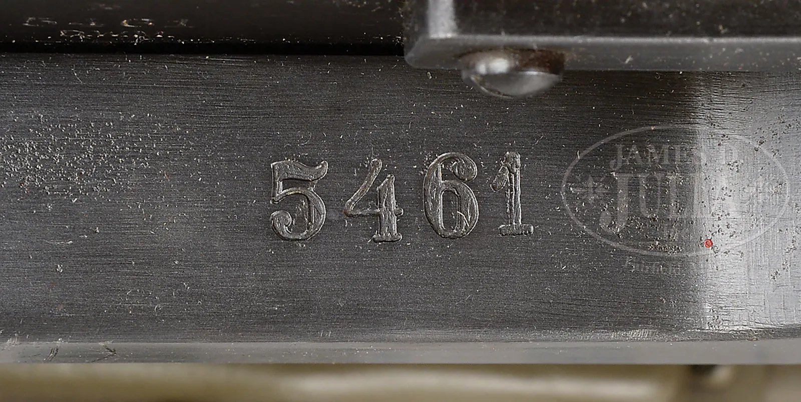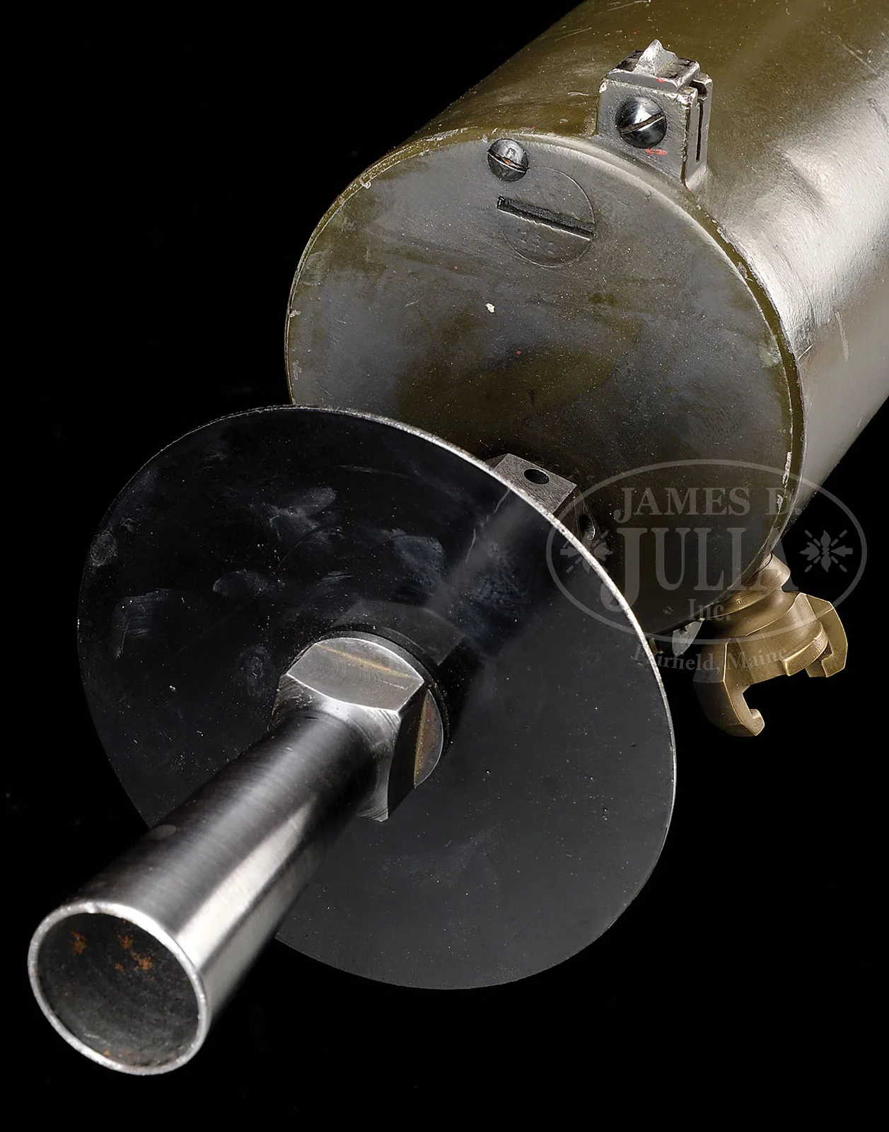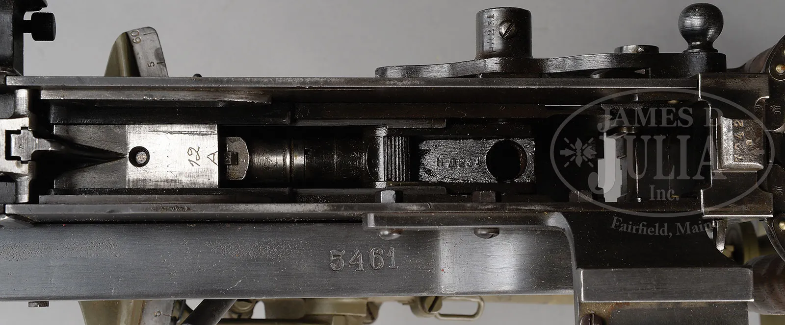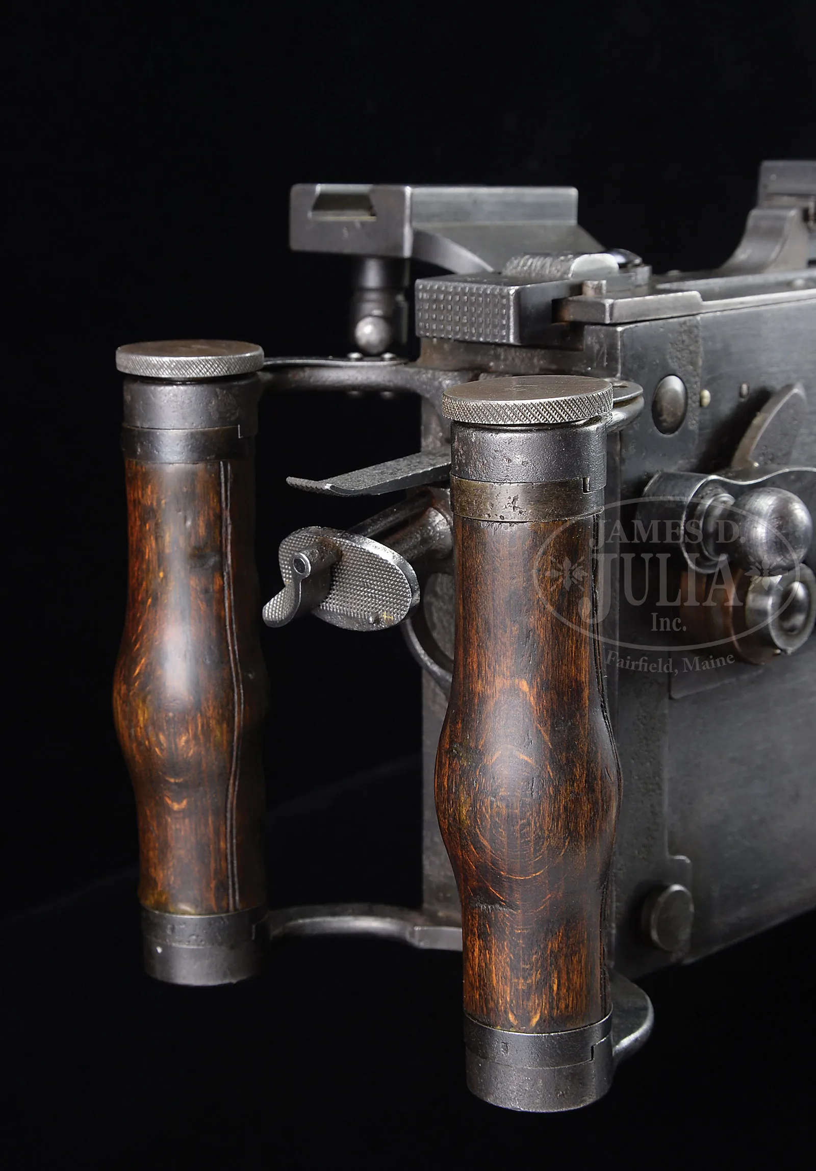 Please Note: 1) Magnificent addition: Consignor found and has provided an original C.E. JUNCKER mfg machine gunners badge. This is an extremely difficult find collector’s piece. 2) Please Note: There is a typographical error. The estimate should be $15,000-$20,000. In addition, the Finnish steel 7.62 Russian belt loading machine is not included with this lot. ***SHOOTER’S DREAM DWM MG-08 MAXIM MACHINE GUN AS REGISTERED BY ERB CONVERTED TO 7.62 RUSSIAN (FULLY TRANSFERABLE).SN 5461. Cal. 7.62x54R. 33″ bbl with flash hider. This attractive MG-08 Maxim was originally mfg by DWM Berlin in 1918. SN’s match on water jacket, top cover, left sideplate, fusee cover, and optic sight bracket. Gun has been registered by Charles Erb and left sideplate sports his bullet logo address below the fusee cover. Gun has been professionally converted to 7.62 Russian by adapting a Russian feed block, bolt, and charging handle, cross head and bbl. Cyrillic markings visible on cross head, charging handle and on top of feed block surface which has been renumbered to “12A”. Included with this lot is an original WWI Swiss tripod SN 7593 with trunnion adapter for MG-08, camouflaged “ear cutout” M-18 helmet with post-war replacement liner and chin strap, four Russian-style ammunition belt boxes; three with empty Finnish belt’s and one with steel cased 7.62 Russian ammo. Also included is one steel tabbed Russian cloth belt. Also a Finnish steel 7.62 Russian belt loading machine in its can and a camouflaged painted water can. Gun has a reproduction muzzle plate with Imperial proofed muzzle and bearing. Steam hose brass fitting at front of water jacket is a post-war replacement. The top cover extractor assist springs are replacements, with the heads of the attachment screws visible on top cover. Water jacket fill cap chain is present however, wooden/hard rubber thumb piece is not present. Seven crates of 7.62 x 54 Russian ammo in sealed tins (approx 6200 rounds) are included with this lot. This is a National Firearms Act item and requires BATF approval prior to transfer. This item is fully transferable on an ATF Form 3 or Form 4. CONDITION: Overall appearance and finish is very fine as refinished over light pitting on top cover, rear sight bracket, top and sides of fusee cover as well as to a lesser degree on both side plates. Water jacket is an attractive olive green with a couple of very small dings and some scratches and handling marks. Fusee cover has also taken a slight ding at the high edge parallel to the front feed block. Feed block actuator arm exhibits some plum color from heat treating upon rework. It is interesting to note that the feed block was adapted by welding an approx 3/8″ spacer plate on the front of the feed block. This cataloger has seen such conversions before. Back plate handles have somewhat more moderate pitting underneath the refinish and handles have been restored to be completely serviceable. Tripod is in outstanding condition, hardly used. Mechanics are fine. Bore is fine with sharp grooves and bright rifling. Belt loading machine is in very fine condition with crisp mechanics. Both helmet and water can exhibit an attractive camouflage pattern of correct period color and pattern. However, it is unlikely in this cataloger’s opinion that this is vintage WWI paint. The MG-08 Maxim was the ultimate well-made machine gun made on a large scale for WWI. Beautifully machined and fitted. It is always an attention getter at the range. This specimen, converted to 7.62 Russian is particularly popular as the 7.62 Russian ammunition is still readily obtainable at a relatively reasonable price. Add to this that this gun utilizes Russian, or Finnish metal or cloth belts, and you have one very attractive ensemble. 52001-1 JWK (12,000-18,000) – Lot 1014
