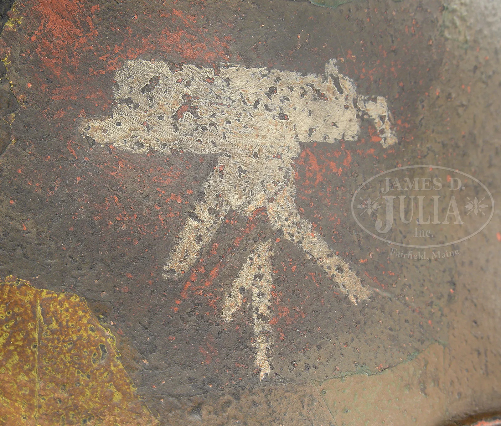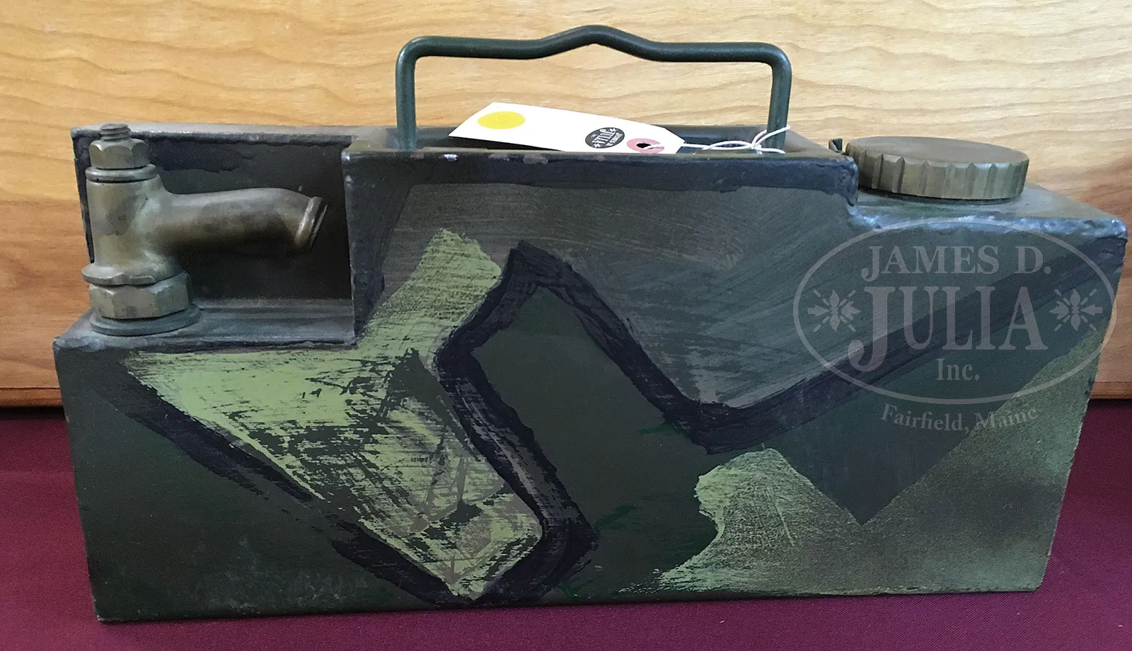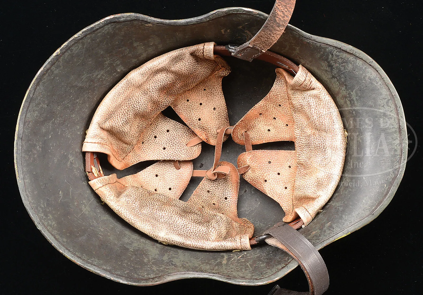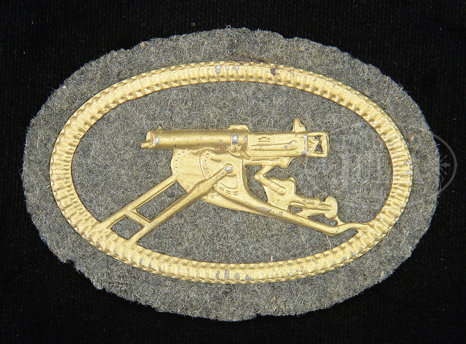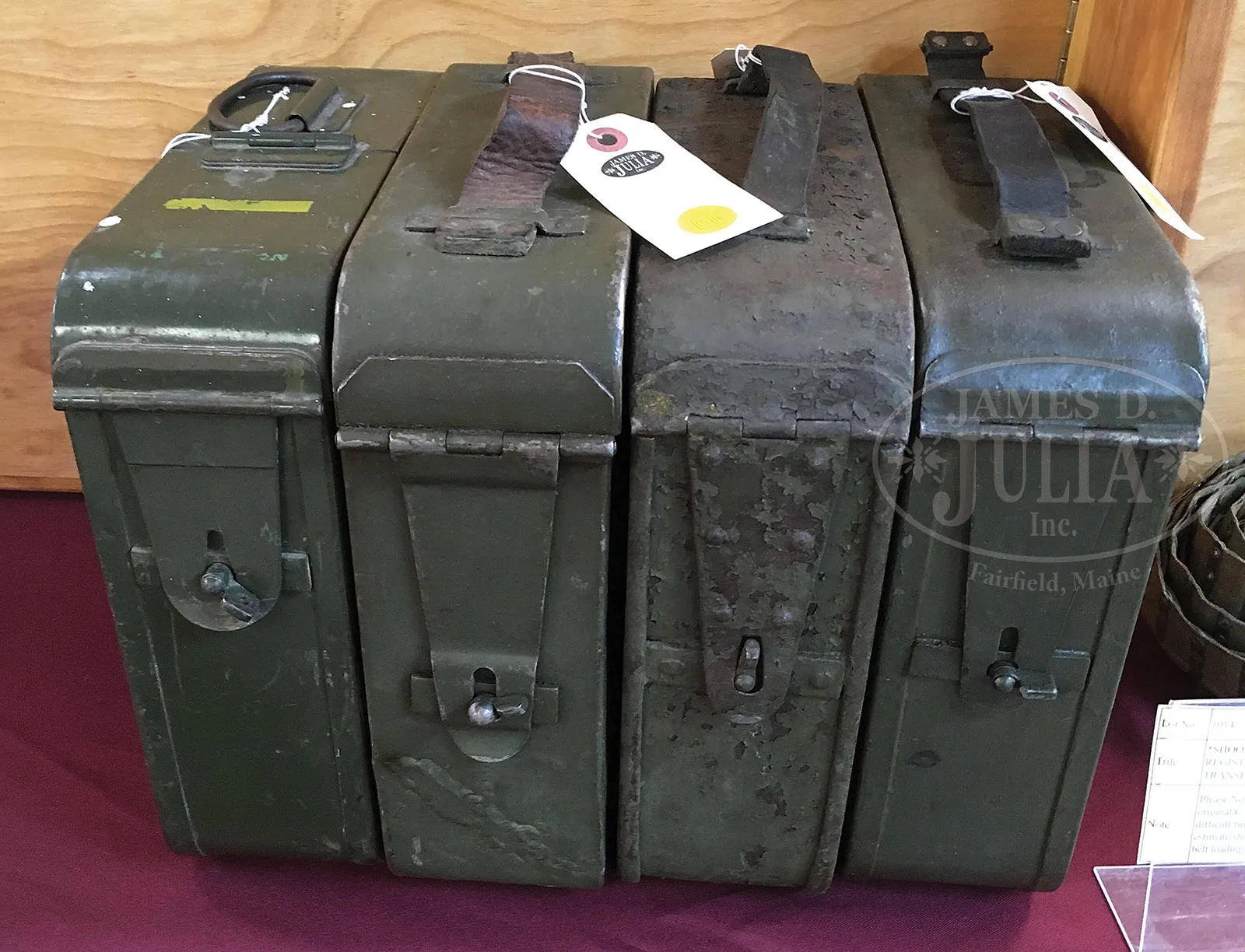 Please Note: 1) Magnificent addition: Consignor found and has provided an original C.E. JUNCKER mfg machine gunners badge. This is an extremely difficult find collector’s piece. 2) Please Note: There is a typographical error. The estimate should be $15,000-$20,000. In addition, the Finnish steel 7.62 Russian belt loading machine is not included with this lot. ***SHOOTER’S DREAM DWM MG-08 MAXIM MACHINE GUN AS REGISTERED BY ERB CONVERTED TO 7.62 RUSSIAN (FULLY TRANSFERABLE).SN 5461. Cal. 7.62x54R. 33″ bbl with flash hider. This attractive MG-08 Maxim was originally mfg by DWM Berlin in 1918. SN’s match on water jacket, top cover, left sideplate, fusee cover, and optic sight bracket. Gun has been registered by Charles Erb and left sideplate sports his bullet logo address below the fusee cover. Gun has been professionally converted to 7.62 Russian by adapting a Russian feed block, bolt, and charging handle, cross head and bbl. Cyrillic markings visible on cross head, charging handle and on top of feed block surface which has been renumbered to “12A”. Included with this lot is an original WWI Swiss tripod SN 7593 with trunnion adapter for MG-08, camouflaged “ear cutout” M-18 helmet with post-war replacement liner and chin strap, four Russian-style ammunition belt boxes; three with empty Finnish belt’s and one with steel cased 7.62 Russian ammo. Also included is one steel tabbed Russian cloth belt. Also a Finnish steel 7.62 Russian belt loading machine in its can and a camouflaged painted water can. Gun has a reproduction muzzle plate with Imperial proofed muzzle and bearing. Steam hose brass fitting at front of water jacket is a post-war replacement. The top cover extractor assist springs are replacements, with the heads of the attachment screws visible on top cover. Water jacket fill cap chain is present however, wooden/hard rubber thumb piece is not present. Seven crates of 7.62 x 54 Russian ammo in sealed tins (approx 6200 rounds) are included with this lot. This is a National Firearms Act item and requires BATF approval prior to transfer. This item is fully transferable on an ATF Form 3 or Form 4. CONDITION: Overall appearance and finish is very fine as refinished over light pitting on top cover, rear sight bracket, top and sides of fusee cover as well as to a lesser degree on both side plates. Water jacket is an attractive olive green with a couple of very small dings and some scratches and handling marks. Fusee cover has also taken a slight ding at the high edge parallel to the front feed block. Feed block actuator arm exhibits some plum color from heat treating upon rework. It is interesting to note that the feed block was adapted by welding an approx 3/8″ spacer plate on the front of the feed block. This cataloger has seen such conversions before. Back plate handles have somewhat more moderate pitting underneath the refinish and handles have been restored to be completely serviceable. Tripod is in outstanding condition, hardly used. Mechanics are fine. Bore is fine with sharp grooves and bright rifling. Belt loading machine is in very fine condition with crisp mechanics. Both helmet and water can exhibit an attractive camouflage pattern of correct period color and pattern. However, it is unlikely in this cataloger’s opinion that this is vintage WWI paint. The MG-08 Maxim was the ultimate well-made machine gun made on a large scale for WWI. Beautifully machined and fitted. It is always an attention getter at the range. This specimen, converted to 7.62 Russian is particularly popular as the 7.62 Russian ammunition is still readily obtainable at a relatively reasonable price. Add to this that this gun utilizes Russian, or Finnish metal or cloth belts, and you have one very attractive ensemble. 52001-1 JWK (12,000-18,000) – Lot 1014
