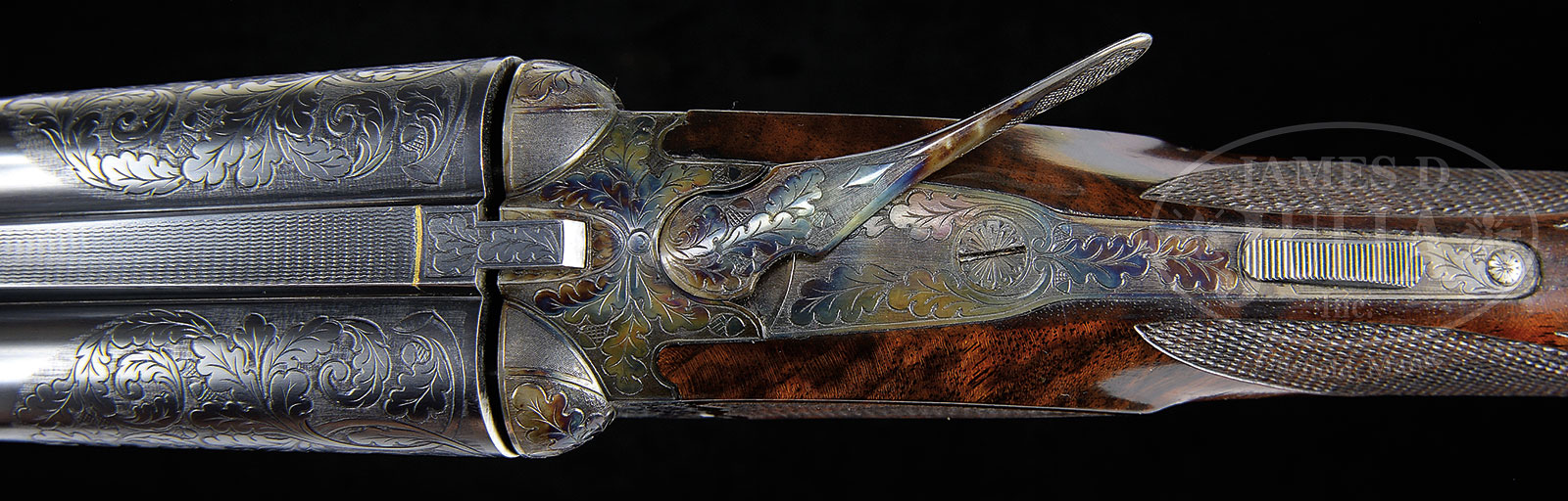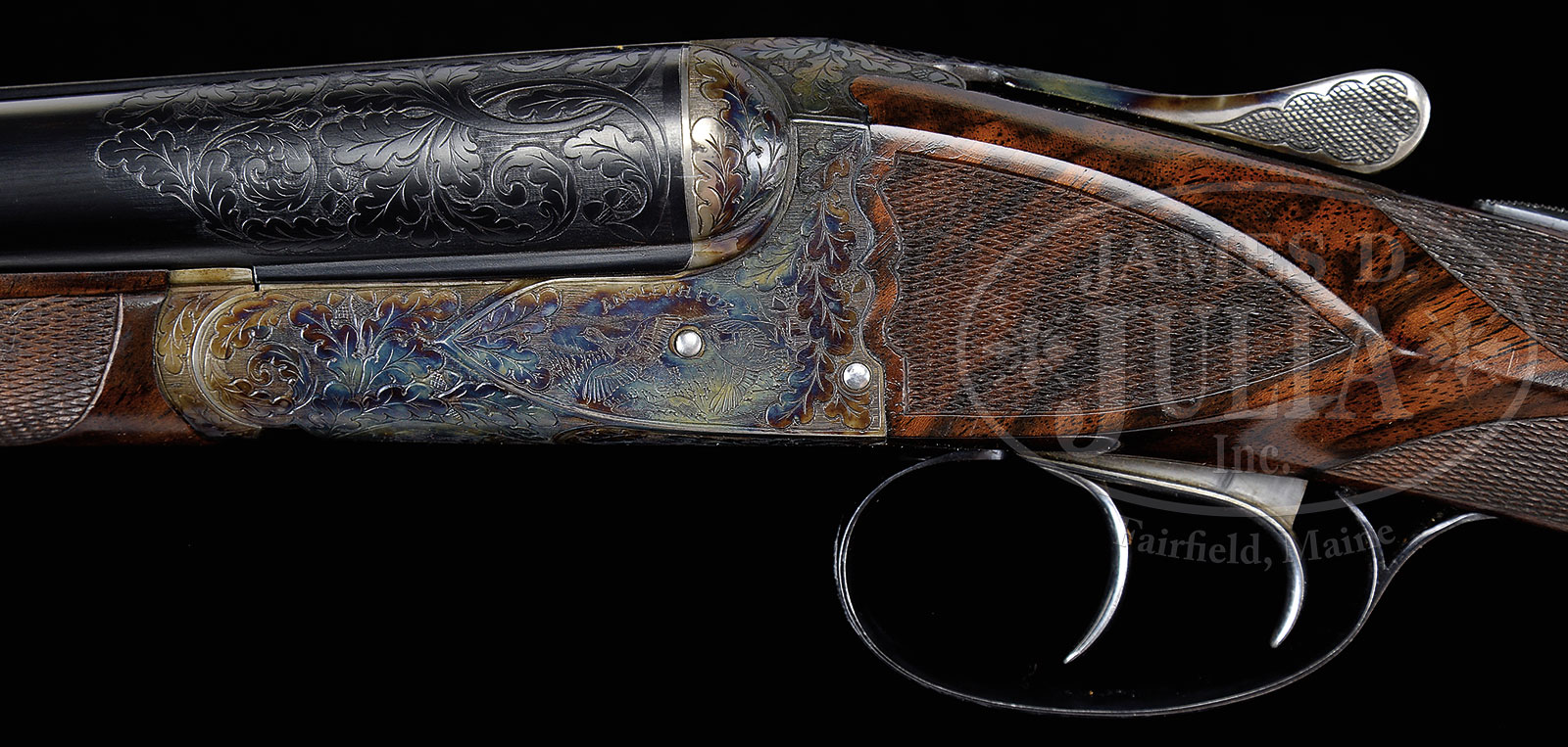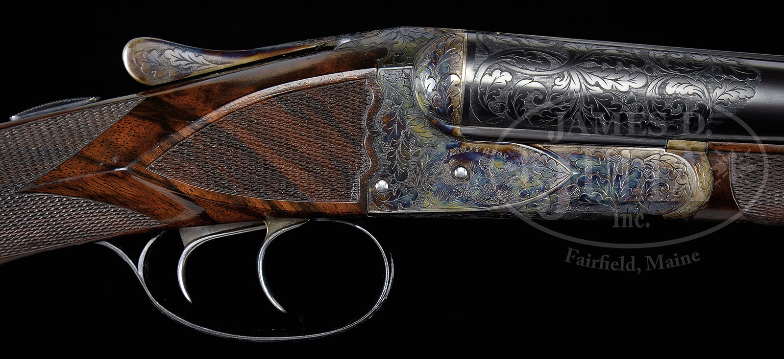 *20 GAUGE CSMC FOX “XE” SHOTGUN WITH EXTRA BARRELS AND CASE.SN F205609XE. Cal. 20 ga. 30″ (“1″) and 26” (“2”) bbls with narrow matted ribs are marked “MADE TO ORDER. A. H. FOX” “CHROMOX – FLUID – STEEL” on tops. 2-1/2″ Areas of well cut shaded scrolling oak leaves are at breech ends. Bbl flats are engraved with SN, grade, and bbl number (“1” or “2”), and stamped with gauge, chamber, and Fox proof. Manufacturers name and address are on loops. Small frame case hardened Fox action features double ogee back and rebated frame, as well as non-automatic safety and dbl triggers. Action is engraved with near full coverage shaded scrolling oak leaves matching that on bbls but with some acorn accents. This interesting treatment surrounds vignettes of game birds on sides; quail (?) on left, and flushing pheasant on right, both under “ANSLEY H. FOX”. A circular vignette on bottom of action portrays a quartering fox stopped in mid-stride by scent of rabbit hiding under a log. Blued trigger guard with matching acorns on bow, has initials “Le F” on central shield. SN is on tang. Obviously specially selected, wonderfully marbled stump European walnut straight grip buttstock measures 14″ over black leather covered pad. Side panels are checkered, and there is modified point pattern borderless checkering with bisecting ribbons on diamond grip. Each bbl set has its own dedicated long splinter ejector forend, with inset schnabeled horn tip, and typical Fox type Deeley release. BBL set “1”: Bore diameter: left -.612, right – .612. Bore restrictions: left – .018 (mod), right – .007 (IC). Drop at heel: 2-5/16″, drop at comb: 1-1/2″. Neutral cast. Weight: 5 lbs. 14 oz. LOP: 14″. BBL set “2”: Bore diameter: left -.614, right – .615. Bore restrictions: left – .012 (lt mod), right – .007 (IC). Drop at heel: 2-7/16″, drop at comb: 1-9/16″. Neutral cast. Weight: 5 lbs. 8 oz. LOP: 14″. Leather case with stitched leather corners is lined in burgundy cloth, and has CSMC FOX label in lid. Partitions allow space for both sets of bbls, and case contains 2-pc cocobolo and brass cleaning rod, pair of Winchester snap caps, unmarked square oil bottle, 3 tropical wood and brass turnscrews, and a matching striker disc key. CONDITION: Excellent, with evidence of some field use. Metal finish is thinning a bit. Thumbpiece silvered. A few minor marks are in wood. Bores are excellent. Mechanically fine. Case is fine, but latch is broken. Straps and handle are good. Interior is fine with some rubs through and soiling. 52065-1 MGM (17,500-22,500) – Lot 1531 Click here to view provenance