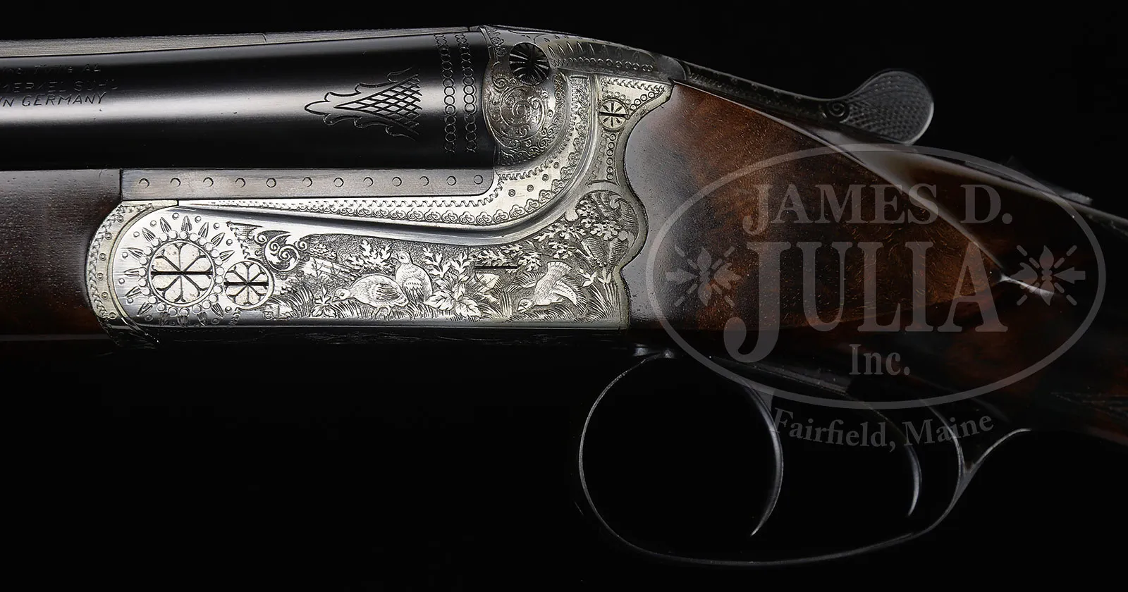 *ATTRACTIVE MERKEL 1620 ELC 16/20 GAUGE TWO BARREL SET BOXLOCK EJECTOR SHOTGUN WITH CASE.SN 384421. Cal. 16 ga/ 20 ga. 16 ga 2-3/4″ chambers and 20 ga. has 3″ chambers. 28″ Shoe lump bbls are marked “1620 ELC NO. 4” on milled out portion at rear of slightly raised, matted ribs. Extensions are numbered “1” and “2”. Makers name and address, importer, chamber, and steel information are marked on sides of bbls. Bbl flats are stamped with German proofs and SNs (20 ga bbls denoted as “-2”). Coin finished ogee backed boxlock action features automatic safety, crossbolt third fastener, side clips, bushed strikers, reinforced frame, and dbl triggers. Action is engraved with 80% coverage shaded scroll within geometric borders. A special feature of an EL is its hand engraved game scenes on sides; semi relief renderings of a trio of quail feeding are on left; and pheasants in woodland are on right. Trigger plate is stamped with Suhl workman logo. Blued top lever is silver inlaid “EL”. Blued trigger guard is engraved en suite with action. Exceptionally fine superbly marbled and nicely figured European walnut straight grip buttstock measures 14-1/4″ over Merkel ribbed buttplate. Each bbl set has its own matching ejector forend with Deeley release. 16 ga BBLS: Bore diameter: left -.669, right – .669. Bore restrictions: left – .014 (mod), right – .009 (IC). Drop at heel: 2-9/16″, drop at comb: 1-7/16″. Neutral cast. Weight: 6 lbs. 2 oz. LOP: 14-1/4″. 20 ga BBLS: Bore diameter: left -.625, right – .625. Bore restrictions: left – .013 (mod), right – .008 (IC). Drop at heel: 2-9/16″, drop at comb: 1-7/16″. Weight: 6 lbs. 3 oz. LOP: 14-1/4″. Makers green pebble vinyl, leather trimmed case by Emmebi is lined in dark green velvet, and has brown leather Merkel label stitched into lid. Case has space for gun and both sets of bbls and contains one case strap. PROVENANCE: The Larry Kelley Estate Collection. CONDITION: Excellent, very close to new, with scant evidence of firing, retaining nearly all orig finishes on all surfaces, with only a few of the faintest handling and assembly marks. Mechanically crisp. Case is fine with some scuffs. Interior cloth is fine, lid partially detached. Some cloth is loose at hinge. These fine little guns retail at over $12000.00. 52082-4 MGM (7,500-12,500) – Lot 1685