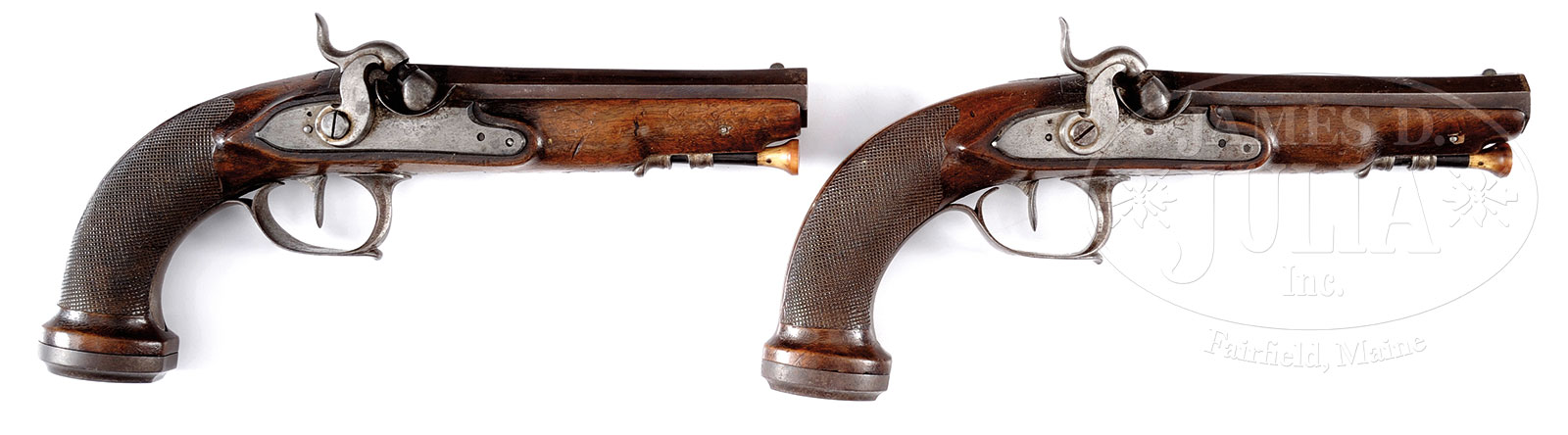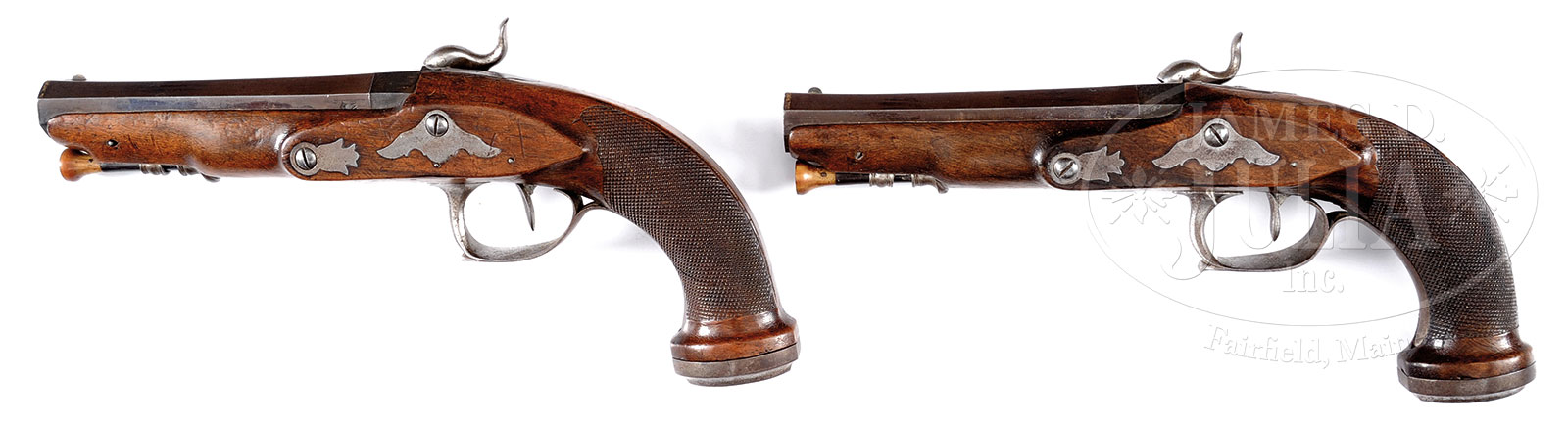 PAIR OF EUROPEAN PERCUSSION PISTOLS CONVERTED FROM FLINT.SN NSN/NSN. Cal. 59. 5″ Deeply swamped octagon bbls have gold damascened bands around muzzles and crowned “M” proofs on left sides of breech ends. Unmarked locks are fitted with flat faced hammers. All furniture is of steel, flush mounted, and of fancy outline. Flared checkered grips have steel caps, engraved with monogram “NR” (?) Stocks extend to muzzles. Horn ramrods have lighter colored horn tips and steel tails, one with worm. CONDITION: Good. Bbls retain a considerable amount of old brown. Locks and steel furniture are silver gray fading to brown. Stocks have most of their orig finish. Bores are lightly pitted. Mechanically good. 52093-3 MGM (1,500-2,000) – Lot 3421