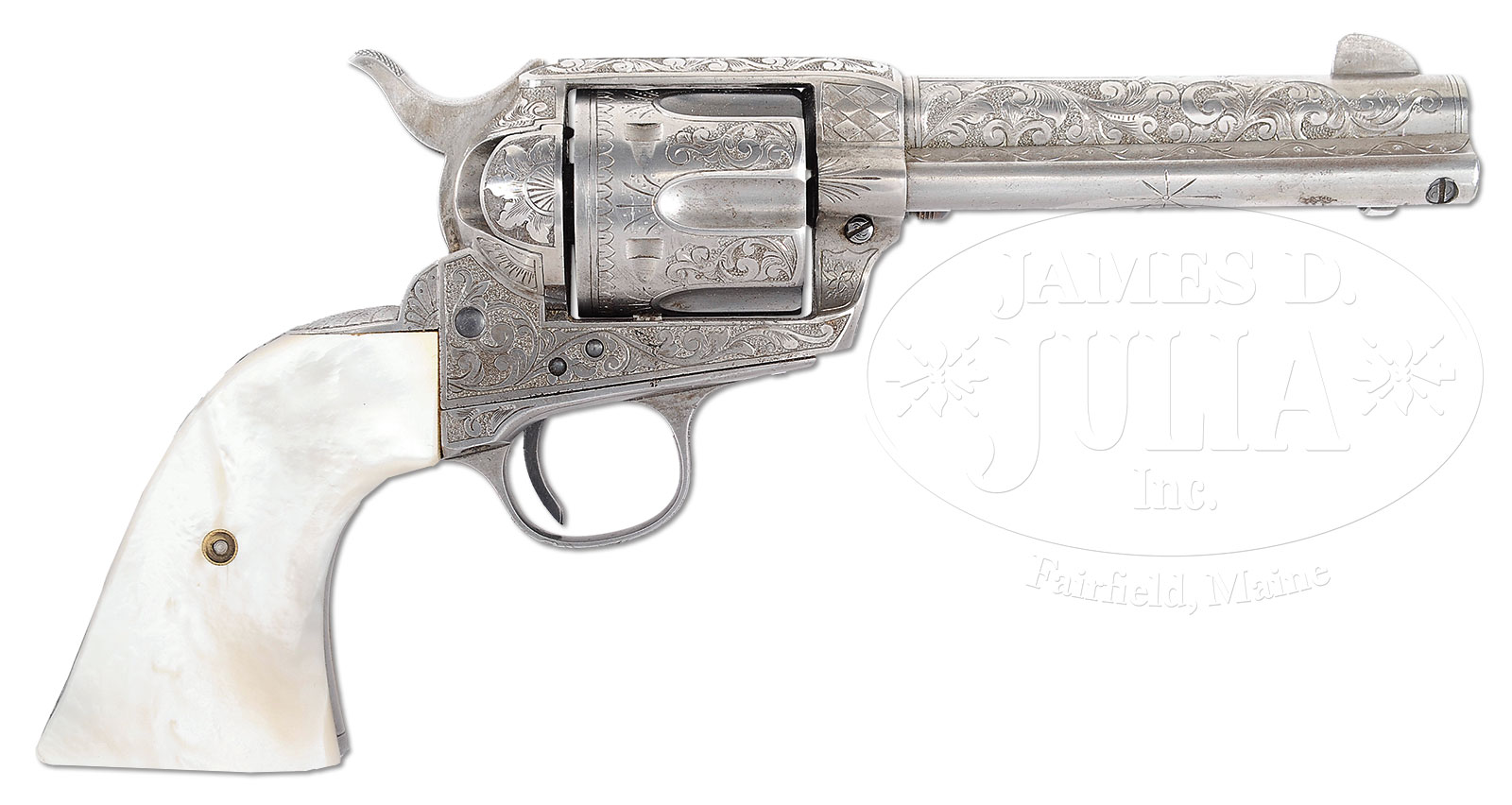 *VERY FINE ENGRAVED 1ST GENERATION COLT SINGLE ACTION REVOLVER WITH MOTHER-OF-PEARL GRIPS.SN 313305. Cal. 45. Standard configuration Single Action Army with 4-3/4″ bbl made in 1910 is beautifully engraved with about 70% coverage, showing light use. CONDITION: Fine to very fine overall. Gun retains bright blue on engraved screws and cylinder pin head. Crisp markings and engraving. Left grip has chip on left rear toe. Mechanically crisp with bright shiny bore. 52175-1 JS (5,000-7,000) C&R – Lot 3085