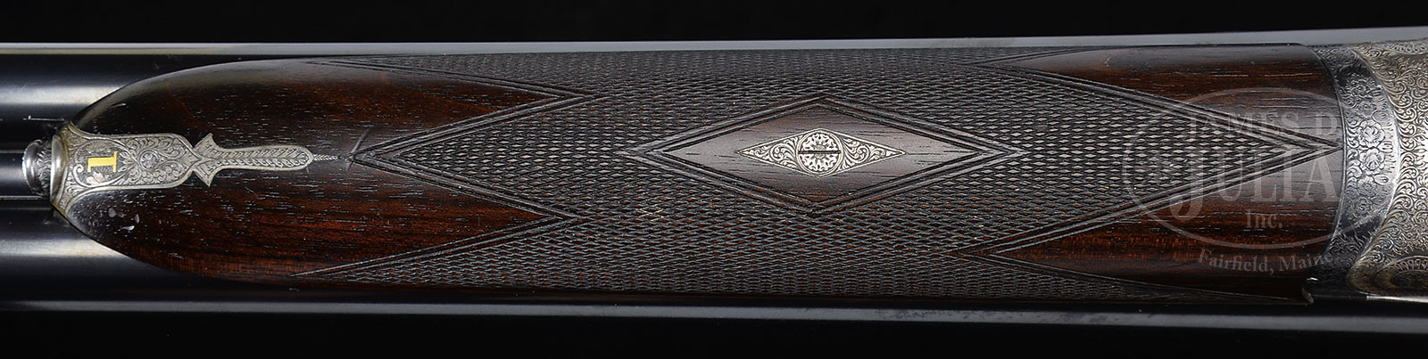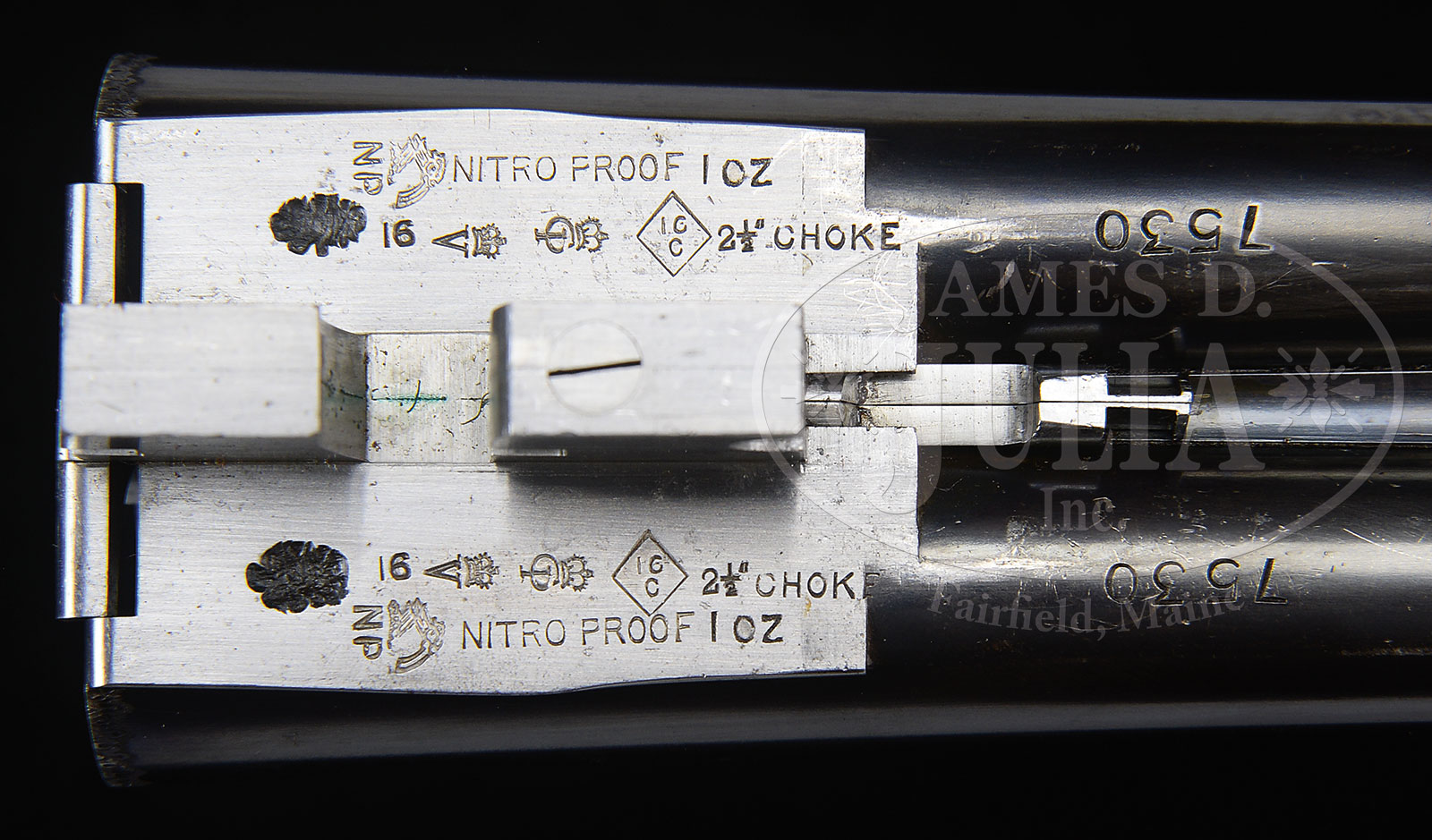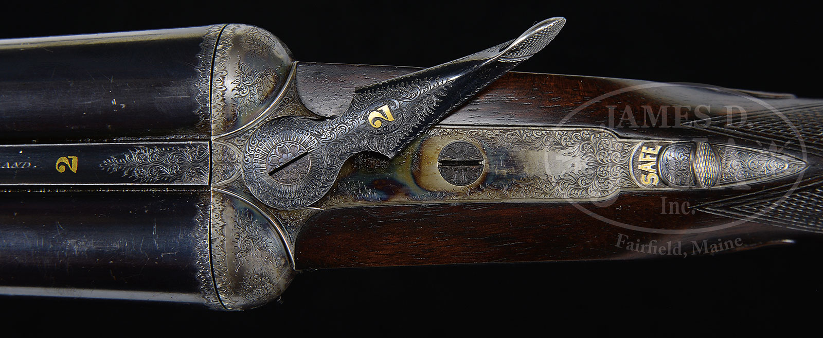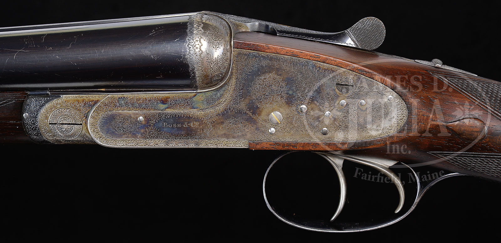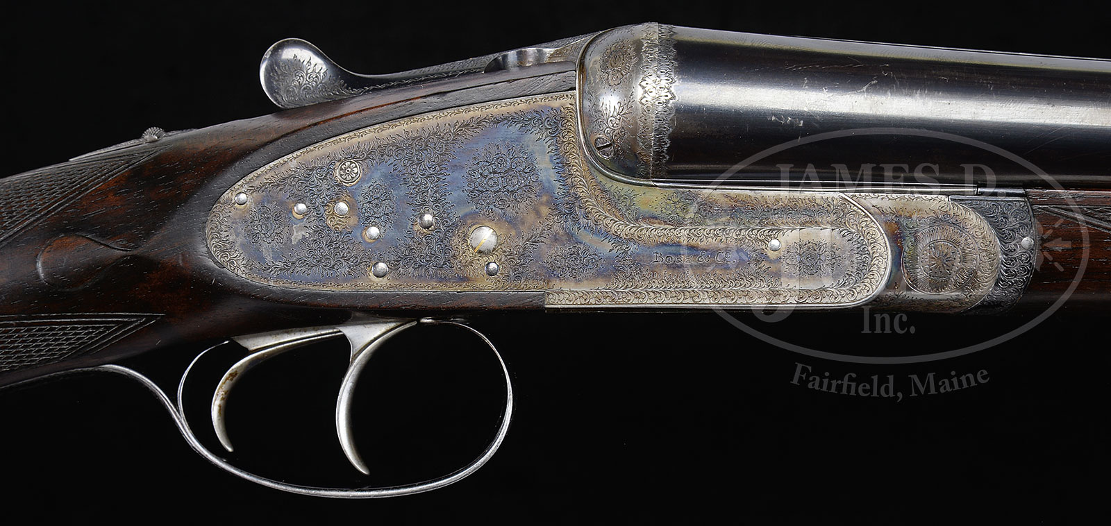 *TRULY SUPERB, AS FOUND, HIGH ORIGINAL CONDITION, LIGHTWEIGHT PAIR OF 16 GAUGE “GOLDEN AGE” BOSS SIDELOCK EJECTOR DOUBLE TRIGGER LIGHT GAME SHOTGUNS MADE FOR MRS. DODGE SLOAN, HEIRESS, SOCIALITE, SPORTS WOMAN, AND OWNER OF A MAJOR HORSE RACING STABLE, WITH ORIGINAL CASE AND ACCESSORIES.1) BOSS SXS DBL. SN 7529. (ca 1928) Cal. 16 ga. 2-9/16″ Chambers. 28″ Chopper lump bbls engraved “Boss & Co Dover Street, Piccadilly, London. England” on narrow swamped game rib. Gun built as part of a true pair, with the number “1” gold inlaid on rear portion of rib, top lever, and forend tip. Bbl flats stamped with London nitro proofs for 2-1/2″ chambers. SN are on bottom of bbls. Nicely scaled down case hardened sidelock action stocked to the fence and features automatic safety (SAFE inlaid in gold), bushed striker, gold band tumbler end cocking indicator, and very unusual (for this time period), double triggers. Action is engraved in classic Boss house style wonderfully cut scroll and 19 rose bouquets, and is undoubtedly the work of noted engraver, Jack Sumner. “Boss & Co” is on the front of lockplate. Blued single beaded trigger guard has more rose and scroll on bow, and SN on tang. Well matched nicely marbled and lightly figured European walnut straight grip buttstock measures 14″ over checkered wood butt. Classic point pattern checkering with mullered borders, is at grip. Stock also features nicely shaped and attenuated drop points. Gold oval engraved “I. D. S.” are on toe line. Matching splinter forend has Anson release, and is fitted with Boss’ excellent ejector system. Bore diameter: left -.661, right – .660. Bore restrictions: left – .011 (mod), right – .005 (IC). Wall thickness: left – .032, right – .032. Drop at heel: 2-3/8″, drop at comb: 1-9/16″. Cast about 5/8″ off. Weight: 5 lbs. 12 oz. CONDITION: Exceptionally fine, original as found. Bbls retain over 95% orig blue, silvered at muzzle and around breech end, along with some high edge wear on rib, and a few scattered marks. Bbl flats and breech ends of bbls retain nearly all of their orig polish. Action retains 80 – 90% of orig case hardening color, silvered on fence and bead, thinning somewhat on bottom from normal hand wear. Lockplate retains nearly all of its orig color, tail of plate shows a bit of thinning. Top lever and trigger guard are silvered on high points. Stock retains nearly all of its orig hand rubbed oil finish with a few nicks and dings. Checkering shows light wear, and is a bit dirty, with a 1/2″ x 1/4″ dent on right rear of the forend. Bores are excellent. Action is tight. Bbl is on face. Ejectors are strong and in time. C&R 2) BOSS SXS DBL. SN 7530. (ca 1928) Cal. 16 ga. 2-9/16″ Chambers. 28″ Chopper lump bbls are engraved “Boss & Co Dover Street, Piccadilly, London. England” on narrow swamped game rib. Gun built as part of a true pair, with the number “2” gold inlaid on rear portion of rib, top lever, and forend tip. Bbl flats are stamped with London nitro proofs for 2-1/2″ chambers. SN on bottom of bbls. Nicely scaled down case hardened sidelock action is stocked to the fence and features automatic safety (SAFE inlaid in gold), bushed striker, gold band tumbler end cocking indicator, and very unusual (for this time period), double triggers. Action engraved in classic Boss house style wonderfully cut scroll and 19 rose bouquets, and is undoubtedly the work of noted engraver, Jack Sumner. “Boss & Co” is on the front of lockplate. Blued single beaded trigger guard has more rose and scroll on bow, and SN on tang. Well matched nicely marbled and lightly figured European walnut straight grip buttstock measures 14″ over checkered wood butt. Classic point pattern checkering with mullered borders, is at grip. Stock also features nicely shaped and attenuated drop points. Gold oval engraved “I. D. S.” is on toe line. Matching splinter forend has Anson release, and is fitted with Boss’ excellent ejector system. Bore diameter: left -.-.661, right – .661. Bore restrictions: left – .012 (mod), right – .008 (IC). Wall thickness: left – .031, right – .032. Drop at heel: 2-3/8″, drop at comb: 1-9/16″. Cast off 5/8″. Weight: 5 lbs. 12 oz. Orig makers oak and leather two gun case with brass corners, has central darker leather shaped rectangle embossed “Mrs. DODGE SLOAN” “LOCUST VALLEY” “LONG ISLAND, N.Y.” Case has its orig leather trimmed canvas cover with storage pouch in top, containing leather and canvas scabbard type gun slip cases. Central medallion on cover and ends of scabbards are embossed “I. D. S.” Interior of case is lined in burgundy cloth and has large Boss Dover Street card label in lid, Dover Street address has been lined out and over-stamped with later Albermarle Street address in red. Small instruction label relates to ejectors. Case is partitioned for both guns and contains 2-pc rosewood and brass cleaning rod with short handle, 2 pairs of snap caps marked “Watson Brothers”, Boss marked square oil bottle, pull through field cleaning kit in black morocco wallet, two brown leather wallets marked “1” and “2” containing spare strikers, as well as an assortment of cleaning mops, brushes, jags, turks head and tow. PROVENANCE: Wikipedia info on Mrs. Dodge Sloan(e). CONDITION: Exceptionally fine, original as found. Bbl retains over 95% orig blue, silvered at muzzle and around breech end, along with some high edge wear on rib, and a few scattered marks. A bit more hand wear shows toward breech end. Bbl flats and breech end of bbl retain nearly all of their orig polish. There is some light staining on breech end. Action retains 80 – 90% of orig case hardening color, silvered on fence and bead, thinning somewhat on bottom from normal hand wear. Lockplate retains nearly all orig color. Top lever and trigger guard are silvered on high points. Stock retains nearly all orig hand rubbed oil finish with a few nicks 