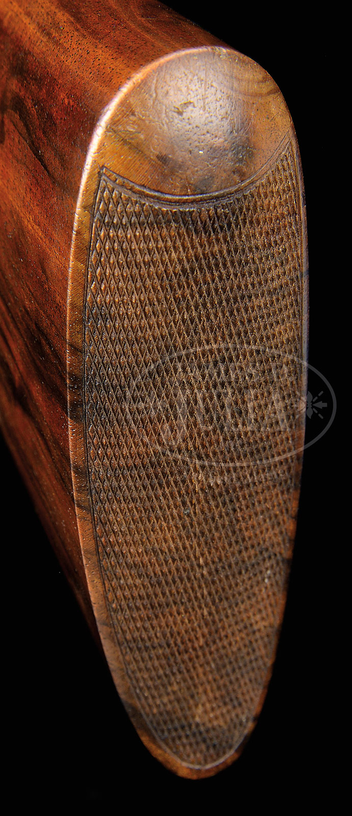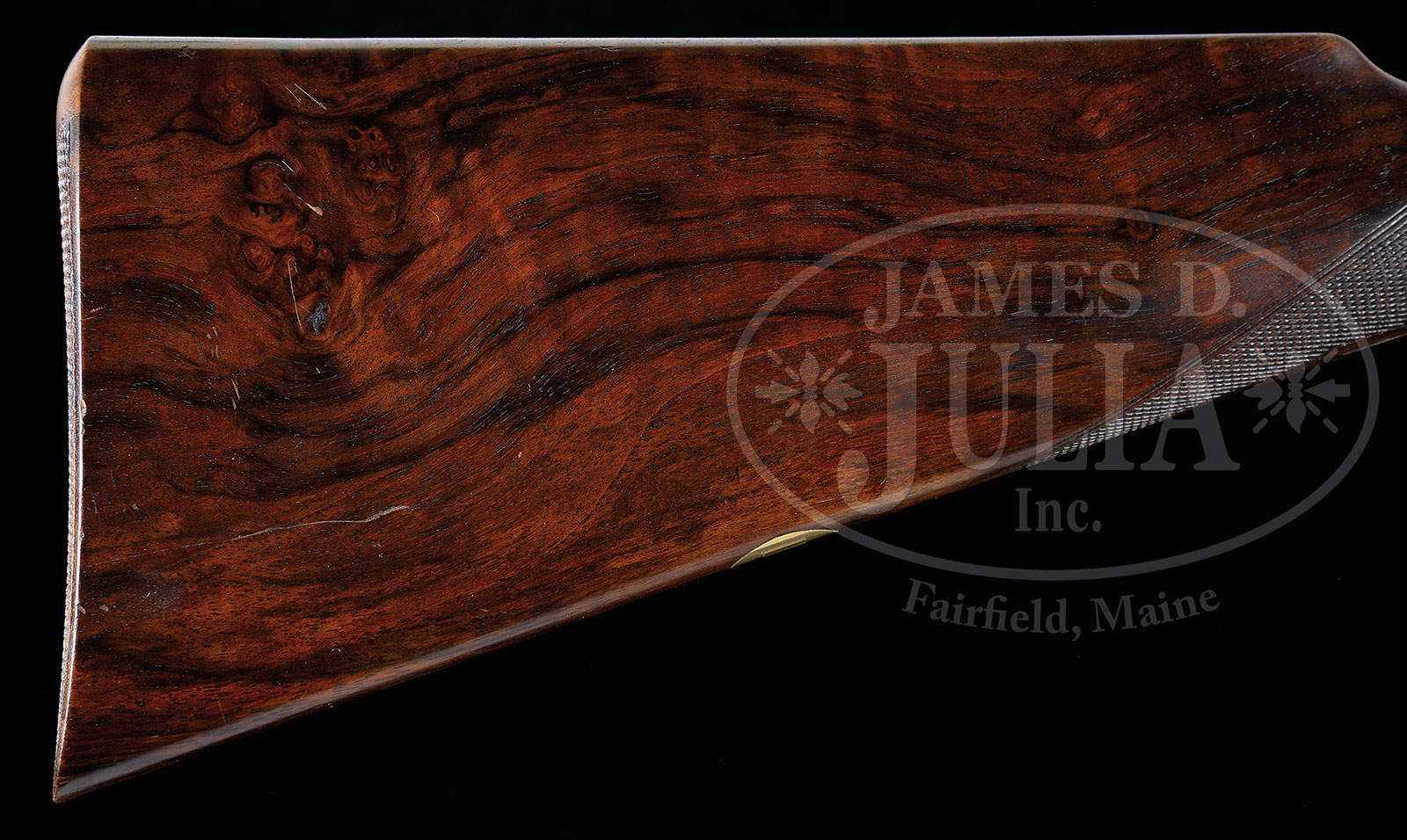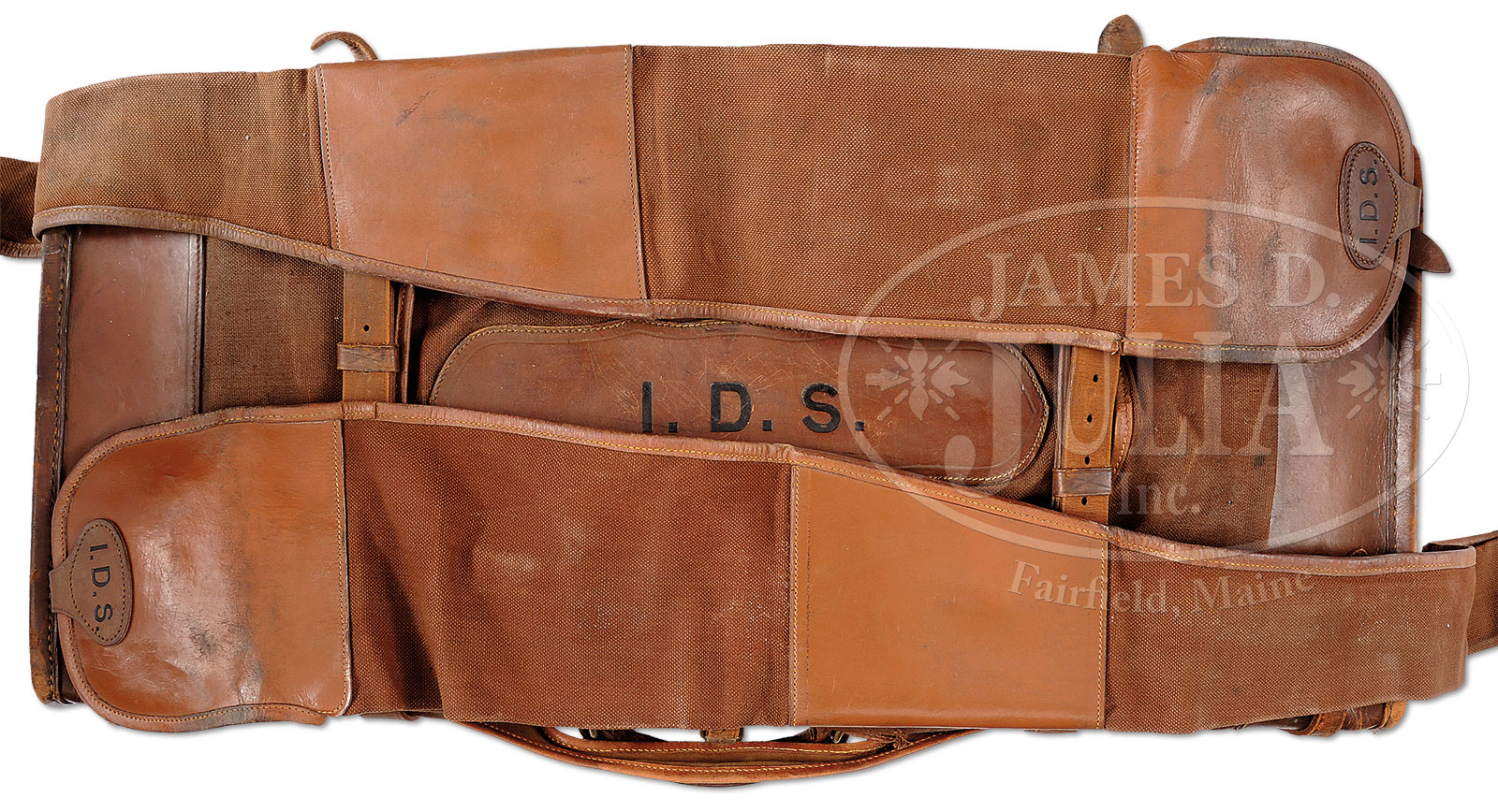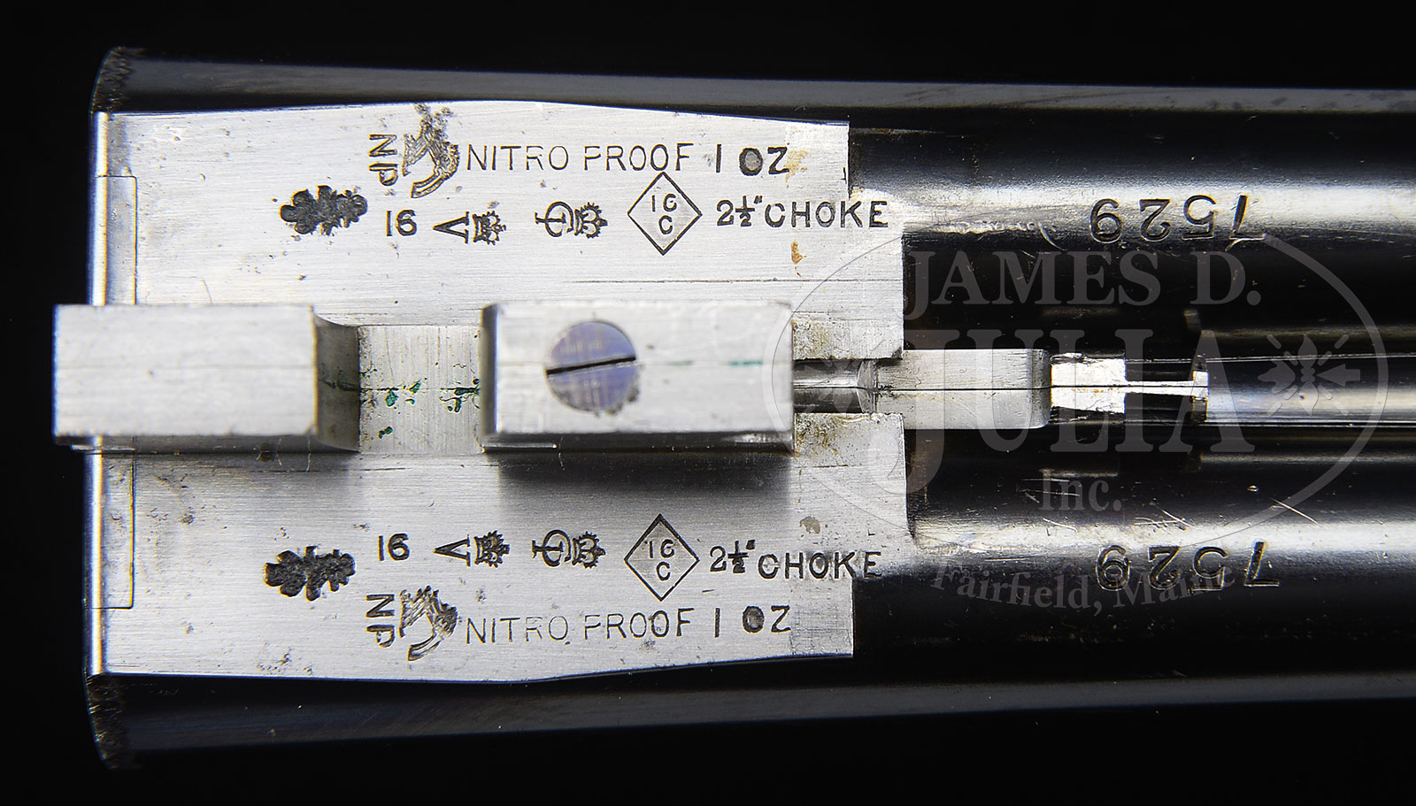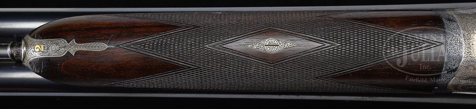 *TRULY SUPERB, AS FOUND, HIGH ORIGINAL CONDITION, LIGHTWEIGHT PAIR OF 16 GAUGE “GOLDEN AGE” BOSS SIDELOCK EJECTOR DOUBLE TRIGGER LIGHT GAME SHOTGUNS MADE FOR MRS. DODGE SLOAN, HEIRESS, SOCIALITE, SPORTS WOMAN, AND OWNER OF A MAJOR HORSE RACING STABLE, WITH ORIGINAL CASE AND ACCESSORIES.1) BOSS SXS DBL. SN 7529. (ca 1928) Cal. 16 ga. 2-9/16″ Chambers. 28″ Chopper lump bbls engraved “Boss & Co Dover Street, Piccadilly, London. England” on narrow swamped game rib. Gun built as part of a true pair, with the number “1” gold inlaid on rear portion of rib, top lever, and forend tip. Bbl flats stamped with London nitro proofs for 2-1/2″ chambers. SN are on bottom of bbls. Nicely scaled down case hardened sidelock action stocked to the fence and features automatic safety (SAFE inlaid in gold), bushed striker, gold band tumbler end cocking indicator, and very unusual (for this time period), double triggers. Action is engraved in classic Boss house style wonderfully cut scroll and 19 rose bouquets, and is undoubtedly the work of noted engraver, Jack Sumner. “Boss & Co” is on the front of lockplate. Blued single beaded trigger guard has more rose and scroll on bow, and SN on tang. Well matched nicely marbled and lightly figured European walnut straight grip buttstock measures 14″ over checkered wood butt. Classic point pattern checkering with mullered borders, is at grip. Stock also features nicely shaped and attenuated drop points. Gold oval engraved “I. D. S.” are on toe line. Matching splinter forend has Anson release, and is fitted with Boss’ excellent ejector system. Bore diameter: left -.661, right – .660. Bore restrictions: left – .011 (mod), right – .005 (IC). Wall thickness: left – .032, right – .032. Drop at heel: 2-3/8″, drop at comb: 1-9/16″. Cast about 5/8″ off. Weight: 5 lbs. 12 oz. CONDITION: Exceptionally fine, original as found. Bbls retain over 95% orig blue, silvered at muzzle and around breech end, along with some high edge wear on rib, and a few scattered marks. Bbl flats and breech ends of bbls retain nearly all of their orig polish. Action retains 80 – 90% of orig case hardening color, silvered on fence and bead, thinning somewhat on bottom from normal hand wear. Lockplate retains nearly all of its orig color, tail of plate shows a bit of thinning. Top lever and trigger guard are silvered on high points. Stock retains nearly all of its orig hand rubbed oil finish with a few nicks and dings. Checkering shows light wear, and is a bit dirty, with a 1/2″ x 1/4″ dent on right rear of the forend. Bores are excellent. Action is tight. Bbl is on face. Ejectors are strong and in time. C&R 2) BOSS SXS DBL. SN 7530. (ca 1928) Cal. 16 ga. 2-9/16″ Chambers. 28″ Chopper lump bbls are engraved “Boss & Co Dover Street, Piccadilly, London. England” on narrow swamped game rib. Gun built as part of a true pair, with the number “2” gold inlaid on rear portion of rib, top lever, and forend tip. Bbl flats are stamped with London nitro proofs for 2-1/2″ chambers. SN on bottom of bbls. Nicely scaled down case hardened sidelock action is stocked to the fence and features automatic safety (SAFE inlaid in gold), bushed striker, gold band tumbler end cocking indicator, and very unusual (for this time period), double triggers. Action engraved in classic Boss house style wonderfully cut scroll and 19 rose bouquets, and is undoubtedly the work of noted engraver, Jack Sumner. “Boss & Co” is on the front of lockplate. Blued single beaded trigger guard has more rose and scroll on bow, and SN on tang. Well matched nicely marbled and lightly figured European walnut straight grip buttstock measures 14″ over checkered wood butt. Classic point pattern checkering with mullered borders, is at grip. Stock also features nicely shaped and attenuated drop points. Gold oval engraved “I. D. S.” is on toe line. Matching splinter forend has Anson release, and is fitted with Boss’ excellent ejector system. Bore diameter: left -.-.661, right – .661. Bore restrictions: left – .012 (mod), right – .008 (IC). Wall thickness: left – .031, right – .032. Drop at heel: 2-3/8″, drop at comb: 1-9/16″. Cast off 5/8″. Weight: 5 lbs. 12 oz. Orig makers oak and leather two gun case with brass corners, has central darker leather shaped rectangle embossed “Mrs. DODGE SLOAN” “LOCUST VALLEY” “LONG ISLAND, N.Y.” Case has its orig leather trimmed canvas cover with storage pouch in top, containing leather and canvas scabbard type gun slip cases. Central medallion on cover and ends of scabbards are embossed “I. D. S.” Interior of case is lined in burgundy cloth and has large Boss Dover Street card label in lid, Dover Street address has been lined out and over-stamped with later Albermarle Street address in red. Small instruction label relates to ejectors. Case is partitioned for both guns and contains 2-pc rosewood and brass cleaning rod with short handle, 2 pairs of snap caps marked “Watson Brothers”, Boss marked square oil bottle, pull through field cleaning kit in black morocco wallet, two brown leather wallets marked “1” and “2” containing spare strikers, as well as an assortment of cleaning mops, brushes, jags, turks head and tow. PROVENANCE: Wikipedia info on Mrs. Dodge Sloan(e). CONDITION: Exceptionally fine, original as found. Bbl retains over 95% orig blue, silvered at muzzle and around breech end, along with some high edge wear on rib, and a few scattered marks. A bit more hand wear shows toward breech end. Bbl flats and breech end of bbl retain nearly all of their orig polish. There is some light staining on breech end. Action retains 80 – 90% of orig case hardening color, silvered on fence and bead, thinning somewhat on bottom from normal hand wear. Lockplate retains nearly all orig color. Top lever and trigger guard are silvered on high points. Stock retains nearly all orig hand rubbed oil finish with a few nicks 