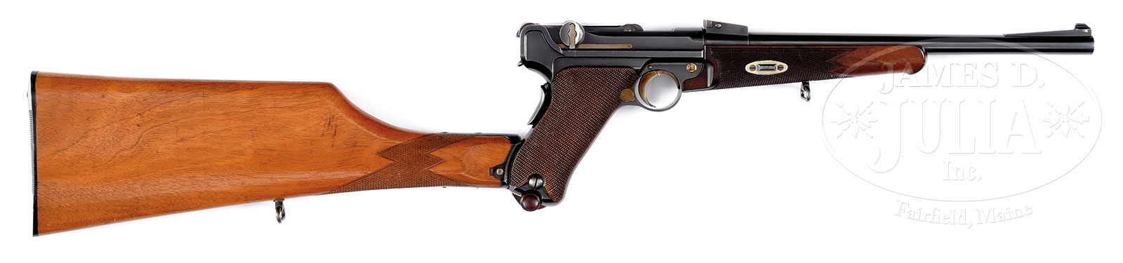 *VERY RARE DWM MODEL 1902 COMMERCIAL LUGER CARBINE WITH STOCK 30 CAL PISTOL.SN 23706. Cal. 30. 11-3/4″ bbl. DWM marked on top of toggle. Numbered under bbl and on forend mounting bar. Matching two digit numbers on small parts. Grip safety. Checkered wood grips. Unnumbered wood bottom mag. Bbl mounted adjustable rear sight, ramp front sight. Checkered forend, internal number no longer visible due to scratches. Stock is unnumbered, very possibly a more modern replacement. CONDITION: Good with a majority of finish. Wear on high points and front strap. Markings clear except where noted. Bore is fine with sharp rifling. Fine mechanical function. 52254-1 GER (9,500-11,500) C&R – Lot 2294