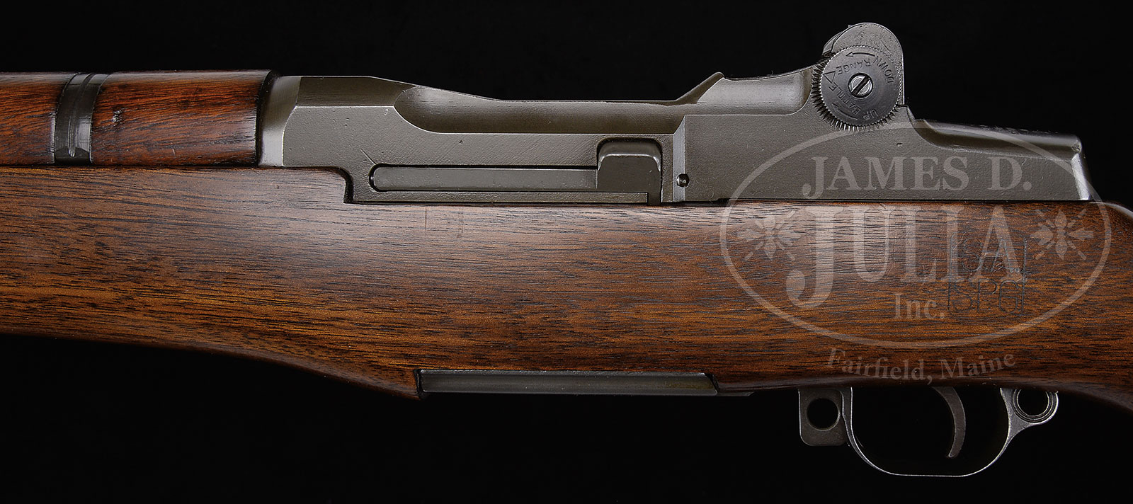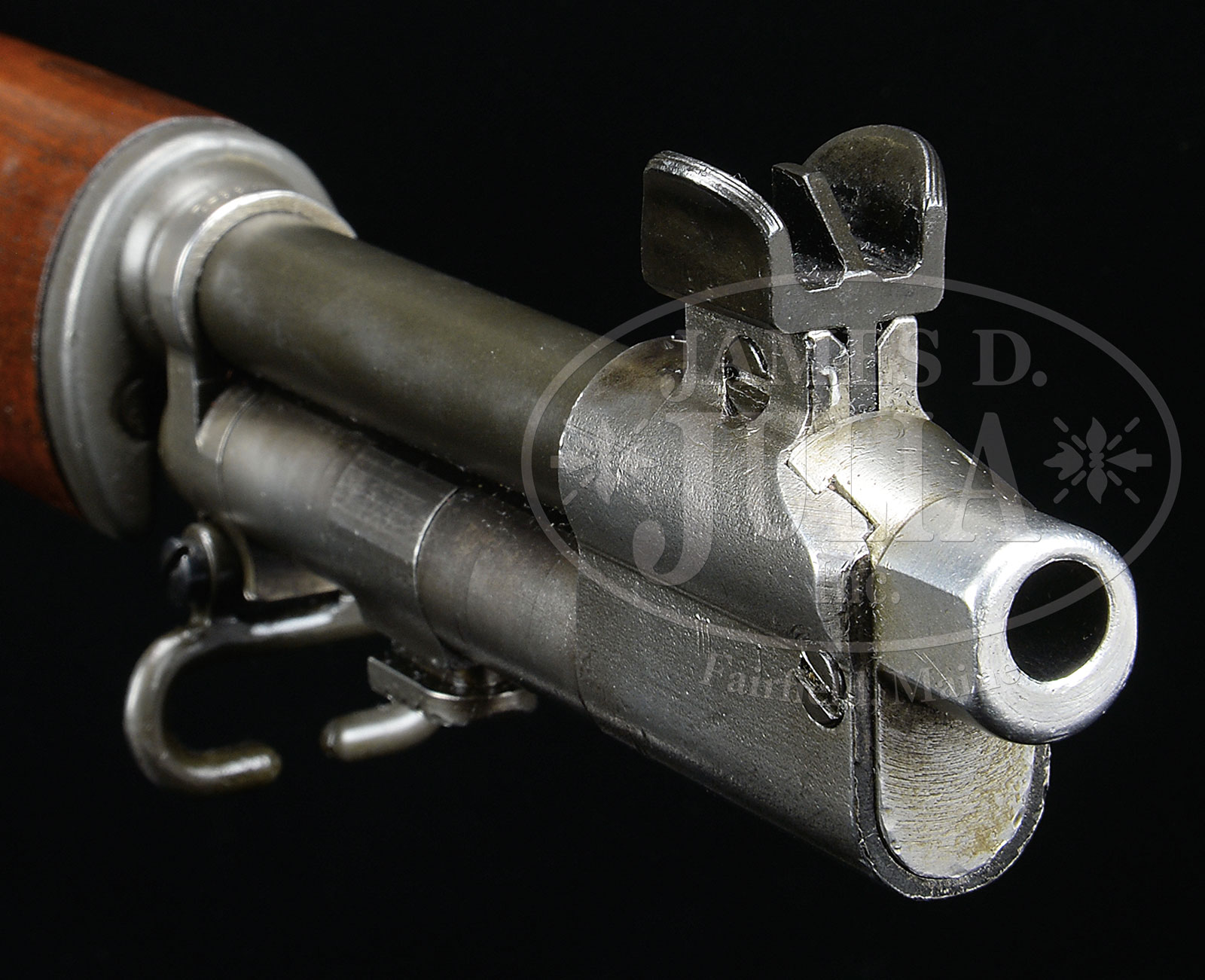 *RARE SPRINGFIELD ARMORY M1 GAS TRAP GARAND RIFLE.SN 1217. Cal. 30/06. This early production Gas Trap Garand was assembled in January 1938 with provenance attributable to well-known author and Springfield rifle collector, William S. Brophy. The rear of the receiver is marked “US RIFLE/CAL 30/M1/SPRINGFIELD/SPRINGFIELD/ARMORY”. Standard three-piece walnut military stock, the forward hand guard and buttstock being more recent replacements. The left side of the stock is cartouched “S.A.-S.G.P.” and an encircled “P” is on the front of the pistol grip. Correct replacement/refinished stock, with small hole/large hole, capped with an unmarked no-trap door buttplate. As true for all the Gas Traps, the main metal parts of this are finished in gray green phosphate. The later operating rod is noticeably darker than the receiver and the gas trap system has transitioned to a dull grey. Disassembly shows the following drawing numbers. Trigger group #D28290, Early Trigger Guard w/ Rear Concentric Rings #C46025, Hammer #C46008-1, Hammer Spring Guide is later version without wings, Bolt #D28287-2SA/B1, Operating Rod #D35382 3 8A (no relief cut), Bullet Guide #B8875SA, Safety Marked “SA”, Front Sight salt blued and unnumbered, Heat Treatment on Right Side of Receiver #D28291, unmarked Trigger, Gas Trap System with small “v” behind sight #D28289-1, Barrel stamped N and P. The rear sight has serrated windage and elevation dials, the rear sight spring is numbered #B8872, and the gun has a two-piece Keystone recoil spring. PROVENANCE: Bill of sale citing purchase from William S. Brophy in 1968. Ex. Bill Morrison Collection. CONDITION: VG-Excellent with refurbished/replaced parts as previously noted. Very small marks are present from storage and handling. Most of the phosphate finish remains except for over the gas-housing, where the parts are greyed. Very light finish loss on operating rod handle and high points of sights. Butt plate has light wear with slight finish loss at high points of checkering. Bore and mechanics are excellent. Gas Trap Garands are a Holy Grail for many military collectors, rarely offered at any price, this one with excellent provenance. 52258-1 (17,500-22,500) C&R – Lot 2067 Click here to view provenance