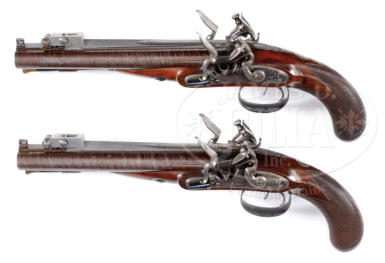 SUPERB CONDITION SPLENDID CASED PAIR OF LARGE DOUBLE BARRELLED FLINTLOCK CARRIAGE PISTOLS WITH SPRING LOADED BAYONETS BY ISAAC BLISSETT.SN NSN/NSN. Cal. 65. 9″ Stub twist bbls fitted with spring loaded, top mounted, bright steel, folding bayonets retained by sliding bolts on breech irons, are engraved “Blissett London” on ribs ( Isaac Blissett, Leadenhall Street, London, 1822 and 1845). Case hardened patent breeches have unlined touch holes. Locks with chamfered plates and slightly rebated rounded tails, are fitted with high breasted serpentine cocks with back sliding safety bolts, waterproof pans, and bridled roller frizzens, springs with rounded finials. Locks are engraved with sweeping acanthus and some feather bursts. “Blissett” is under pans. Blued trigger guards with shield and flowers on bows, have stylized pineapple finials matching thimbles. Densely grained European walnut stocks with flat top checkered bag grips, have vacant silver ovals at tops of grips, and attach to bbls with captive side bolts through oval silver escutcheons. Mahogany ramrods have brass tips and tails with worms under caps on tails. Pistols are housed in (possibly original) deep mahogany case with dual hook closure also with folding handle flush mounted in shaped rectangle at center of top. Interior is lined in olive green cloth, and has the original and rare “I Blissett” paper label with 69 Leadenhall Street address in lid. Case contains full accessories comprising 16 bore nutcracker type ball mold, plain copper bag type combination powder and ball flask, and 2-pc rosewood and brass loading/ cleaning rod. Covered compartments have gold plated round knobs on their mahogany covers. CONDITION: Excellent, retaining nearly all orig finishes on wood and metal, with some light cleaning and minor age oxidation on bbls and bayonets. Patent breeches and locks most all their orig case colors. Stocks have the usual minor handling marks and scratches.One pistol has a period repair to the bottom of stock under the lock from an apparent age or shrinkage crack. Trigger guards and thimbles retain nearly all of their original bright blue, thinning at grips, with some flecking. Original ‘nitre’ blue remains on frizzen springs and side bolts. Bores are excellent, bright and shiny. Guns appear unfired, with only very minor flint strike marks on frizzens. Case is excellent with minor marks and nearly all its orig finish. Case closure missing studs. Interior cloth is fine. Label has the expected foxing but is bright and entirely legible. Accessories are fine. The finest pair of double barrel, spring bayonet flintlock pistols we have offered to date. Truly extraordinary in every respect. Mechanics are excellent. 52311-3 (27,500-35,000) – Lot 1535