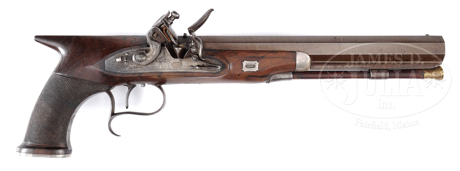 GOOD QUALITY PARTIALLY SILVER MOUNTED LARGE BORE SAWHANDLED FLINTLOCK “DUELING” PISTOL BY HOLLIS.NSN. Cal. 60. (.655) 10-1/4″ Octagon Damascus bbl with under rib, is engraved “LONDON” on top flat. Patent breech with silver lined touch hole and two platinum bands is fitted with U-notch rear sight. Breech iron is scroll engraved. Engraved lock with flat plate high breasted serpentine cock, fully waterproof pan, and bridled frizzen with roller is marked “HOLLIS” in oval brass poincon. Trigger is set. Steel trigger guard with finger spur has pineapple finial. Checkered grip has silver oval and band on bottom, matching silver oval on left side, silver nose cap, and shaped silver escutcheons for captive side bolt holding bbl. Ramrod has brass tip and tail with steel worm under cap. CONDITION: Good as refinished. Bbl with excellent re-brown, has good definition of pattern. Lock has re-hardening over pitting. Trigger guard is a gray brown patina. Stock lightly refinished, sound, but with a few cracks along bbl channel. Tip of saw handle has repair. Bore is pitted otherwise mechanically good. 52315-2 (2,000-2,750) – Lot 3387