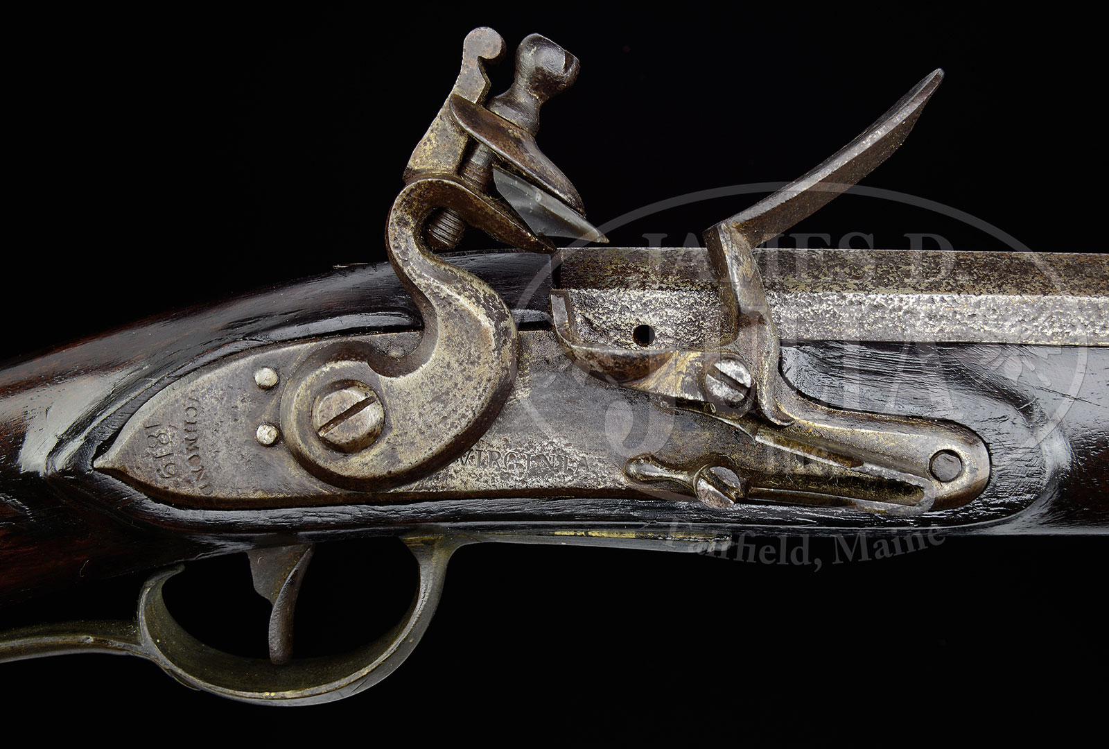 RARE 1819 DATED 2ND MODEL VIRGINIA MANUFACTORY RIFLE WITH BRASS PATCHBOX.NSN. Cal. 48. 39″ full oct bbl. Virginia Manufactory rifles are all quite rare, even though 1819 dated examples are among the most common, there were still only 197 produced that year. However, finding these guns in any configuration is quite difficult. This gun appears to be a well disguised re-conversion, but was not disassembled. PROVENANCE: The collection of Robert Roughton. CONDITION: Good to very good. Gun appears all orig, though old lock components probably utilized in re-conversion. Metal has been cleaned showing old pitting overall, now a mottled grey/brown. Brass mounts have a medium mustard patina. The stock has been refinished with several crack repairs. Mechanically sound with clear rifled bore. But all in all, a good representative example of a rarely seen Virginia rifle. 52332-126 JS (4,500-6,000) – Lot 3331