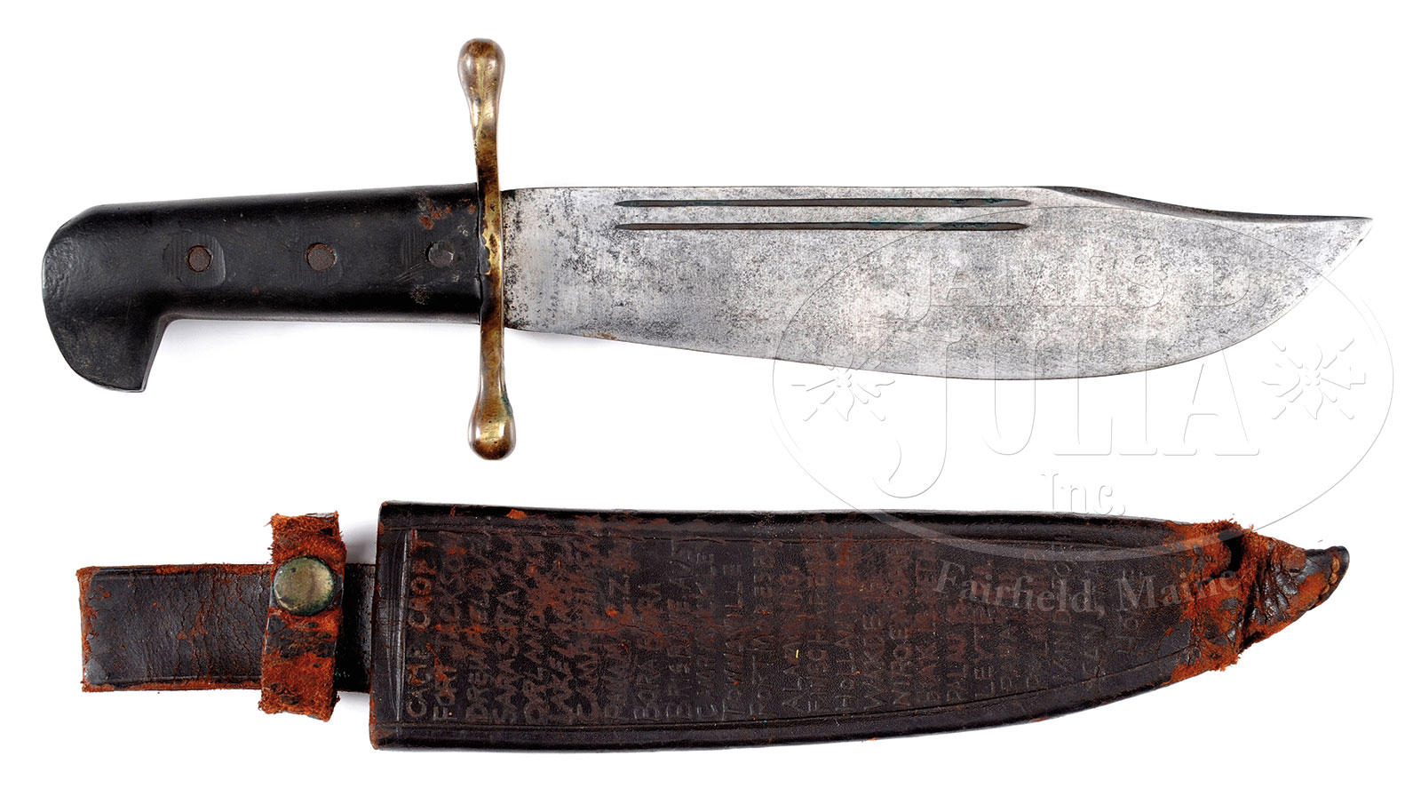 RARE WWII US AIR CORPS-USMC V-44 SURVIVAL KNIFE OF AMERICAN GI WHO LISTS 26 POSTS, INCLUDING CAMPS AND PACIFIC ISLANDS.This is an honest example of an unmarked V-42 survival knife that saw some use and “BUD YOKLEY” wrote his name and listed 26 places he was stationed starting at Camp Croft and ending with several Philippine and Pacific Islands before coming home. PROVENANCE: The collection of Robert Roughton. CONDITION: Very good overall. 9-1/4″ blade is overall grey with staining and pitting. Brass cross guard has been cleaned with several small dents. Composition grips are worn with several reductions; iron pins have dark patina. Snap closure to scabbard is heavily scuffed and worn. Scabbard is fairly solid with break near tip with folding. 52332-216 JS (300-500) – Lot 2274
