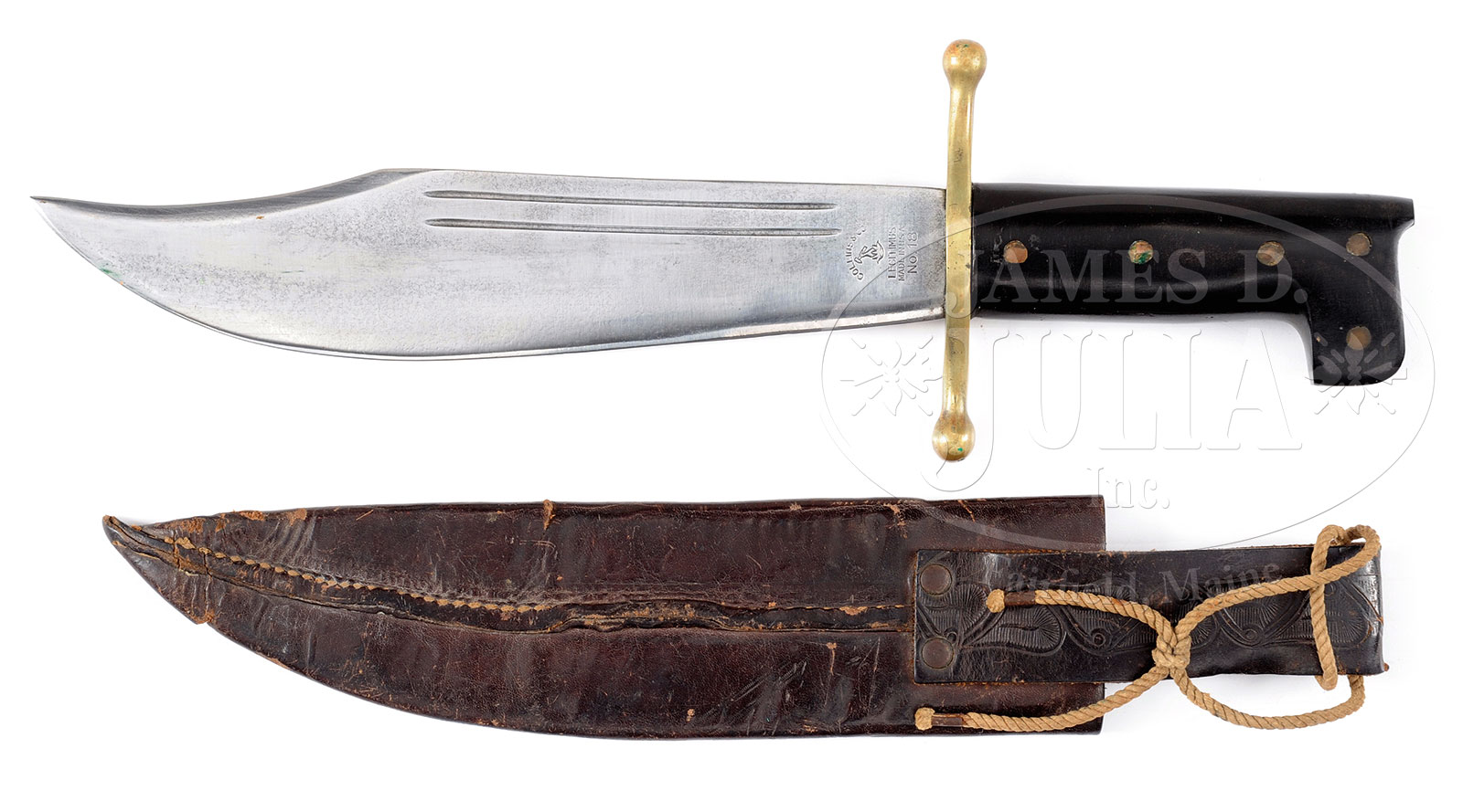 RARE AND FINE “COLLINS” WWII US AIR CORPS V-44 SURVIVAL KNIFE.This is an extremely fine, orig and authentic example of a highly reproduced knife measuring 14-1/4″ overall with 9-7/16″ Bowie blade marked “COLLINS & CO / logo with hammer / LEGITIMUS / MADE IN USA / NO. 18” with 2-pc black composition grip retained by 5 brass rivets. Knife is accompanied by orig brown leather scabbard. PROVENANCE: The collection of Robert Roughton. CONDITION: Fine overall. Blade shows old cleaning with light pitting, polished bright. Brass cross guard is smooth. Tooled brown leather scabbard properly maker marked and has tear near tip. 52332-217 JS (300-500) – Lot 2275