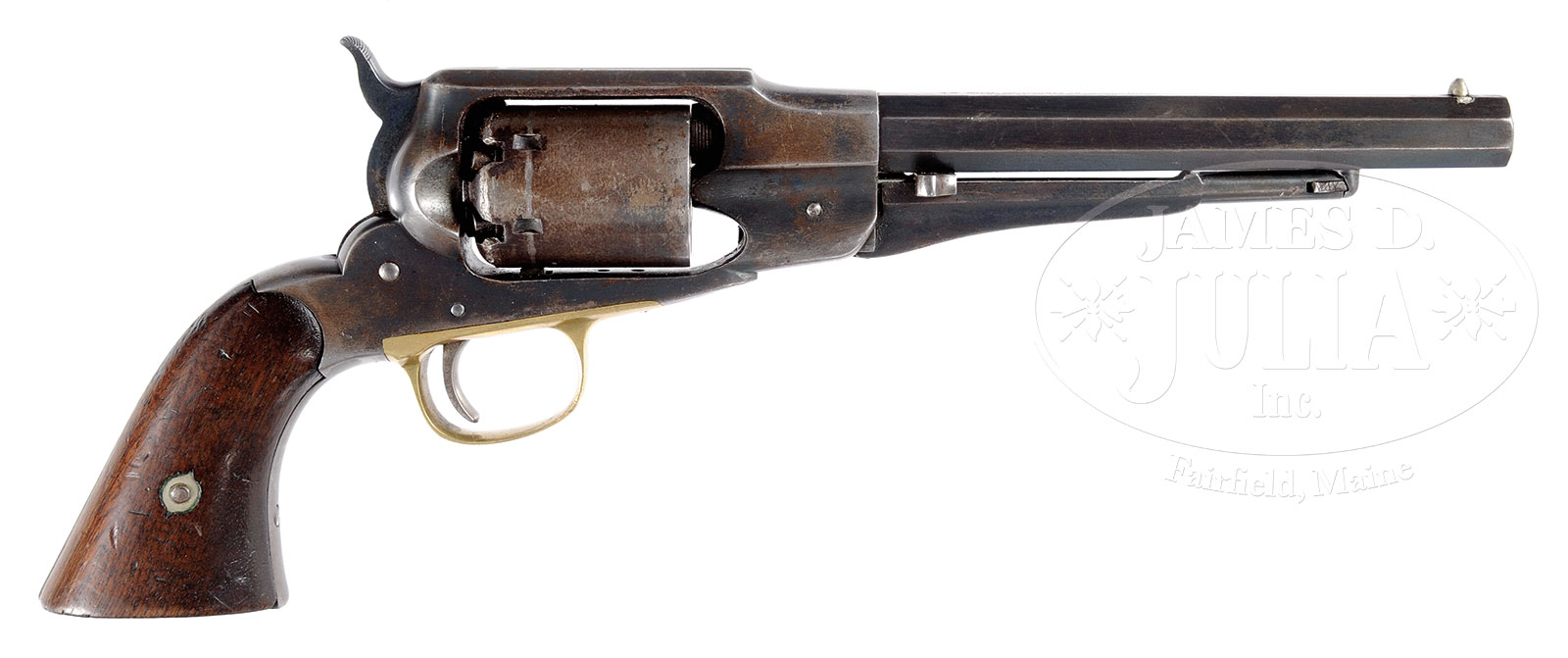 RARE MARTIALLY MARKED REMINGTON MODEL 1861 NAVY PERCUSSION REVOLVER.SN 19567. Cal. 36. Standard configuration with 7-3/8″ oct bbl, 2-line address “PATENT DEC 17 1861 / MANUFACTURED BY REMINGTONS’ ILION. N.Y.”. Only about 7,000 of this model were made 1862 and all made for Army contracts. This gun has discernible inspector’s cartouches on left stock and sub-inspector letters found on most metal parts. This is a nice example with crisp markings and strong traces of orig finish. PROVENANCE: The collection of Robert Roughton. CONDITION: Very good to fine overall, all matching, SNs found on bbl and frame. Gun is a mottled blue/plum with staining and pitting, early large German silver cone front sight. Gun retains about 30% orig finish overall. Cylinder has heavy drag mark and is battered between cones. Markings crisp, grips well fit with moderate edge wear, cartouche is just visible in outline with hand worn patina. Mechanically, cylinder does not index; crisp shiny bore. 52332-6 JS (1,500-2,000) – Lot 3197