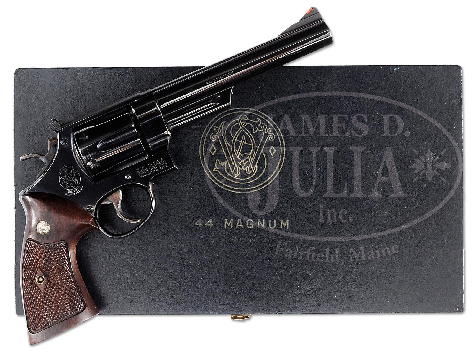 *SMITH & WESSON 44 MAGNUM “PRE-MODEL 29” DA REVOLVER WITH BLACK BOX.SN S154085. Cal. 44 Mag. Developed at the urging of Elmer Keith, the 44 Magnum was announced on January 19, 1956 and became known as the “Most Powerful Handgun in the World”. 5-screw N frame square butt action with pinned bbl. 6-shot fluted cylinder. 6-1/2″ rnd bbl with rib and shrouded ejector. Red ramp serrated front sight with white outline micrometer click adjustable rear sight. Blue finish. Case colored .500″ target hammer. Case colored .500″ grooved target trigger. 2-pc diamond checkered Goncalo Alves target grips. SN’s on frame and ejector housing match. Includes black presentation box. Lid has S&W logo over “44 MAGNUM”. Box has relined blue satin interior and contains cleaning kit. PROVENANCE: The collection of Robert Roughton. CONDITION: Fine condition. Over 90% orig blue with cylinder drag line. Light edge wear. Grips show light marks. Mechanics are fine. Bright bore with sharp rifling. 52332-66 DS (2,500-3,500) C&R – Lot 2430