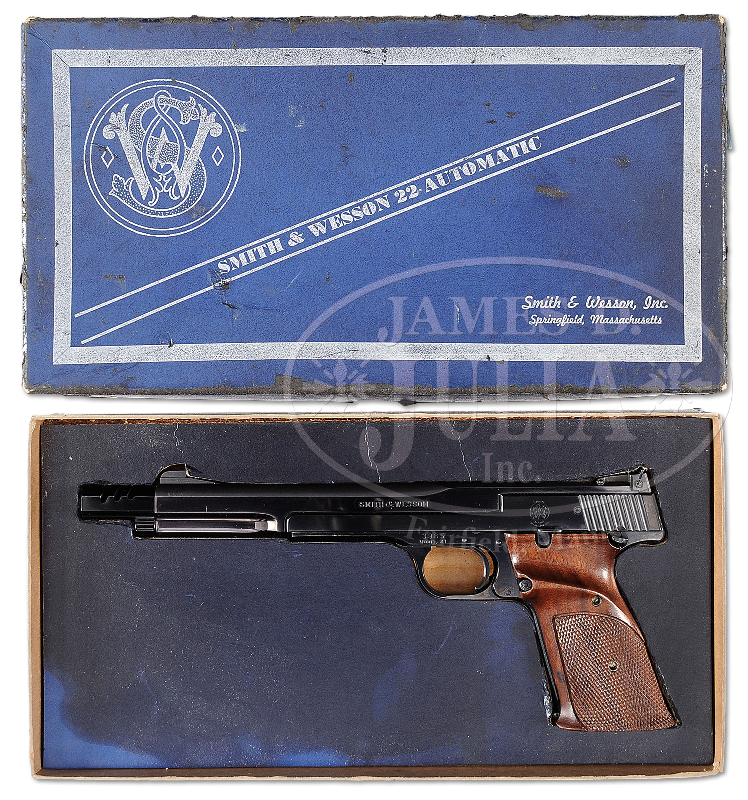 *SMITH & WESSON MODEL 41 SA TARGET PISTOL.SN 3985. Cal. 22LR. Early version, 7″ bbl with muzzle break. Undercut Patridge front sight with square notch adjustable target rear sight. Serrated .365″ trigger with adjustable stop. 10-shot detachable magazine. 2-pc checkered walnut thumb rest grips. Includes 2-pc box. Box has taped corners and end covering label. PROVENANCE: The collection of Robert Roughton. CONDITION: Very fine i, retaining over 95% blue. Grips show light handling marks. Mechanics are fine. Bright shiny bore. 52332-79 DS (800-1,000) C&R – Lot 2424