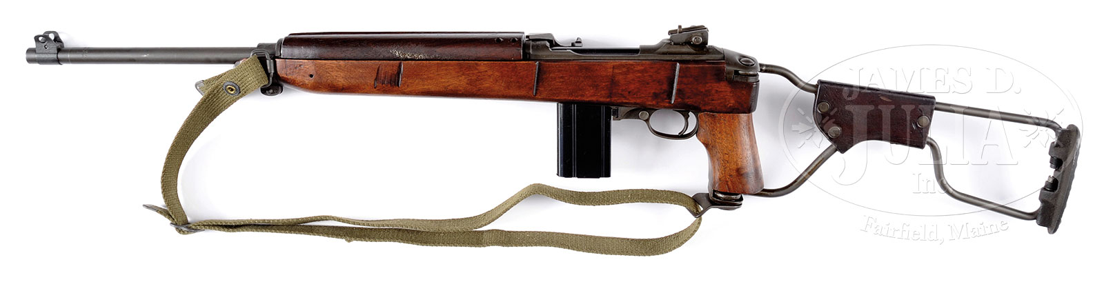 *VERY FINE INLAND M1A1 PARATROOPER 30 CAL. CARBINE.SN 5519134. Cal. 30. 18″ bbl. Standard markings. Adjustable rear sight. 9-44 dated bbl. Type II front band. Stock has worn Ordnance wheel on right side of grip. “RI” marked on bottom of pistol grip. Proper leather cheek rest with steel rivets. This is later style WWII paratrooper carbine in very difficult to find condition. “IA” marked 15 rnd mag. Comes with sling and oiler. PROVENANCE: Collection of Robert Roughton. CONDITION: Very fine with most of the proper Parkerized finish. All markings are clear. Stock has light handling marks, marks from folding stock on left side. Minor chip at very front top left corner of stock. 1/4″ crack on left side of stock where it meets upper hinge cover. Leather has light scuff marks. Bore is bright with sharp rifling. Mechanics are fine. All external numbers matching. 52332-98 GER (3,500-5,500) C&R – Lot 2204