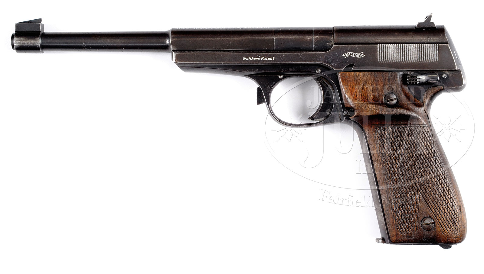 *WALTHER 1926 OLYMPIA, SPECIAL ORDER FOR CHAS. A. HEYER OF NAIROBI.SN 3193. Cal. 22LR. Standard configuration Walther 1926 Olympia with 5.5″ bbl, having a vertically adjustable front sight and drift adjustable rear sight. The right side of the bbl is marked with the SN along with a pair of Crown/N proofs. On the crest of the bbl, in bold lettering, is the marking “SPECIALLY MADE FOR / CHAS. A. HEYER & CO., NAIROBI”. The slide markings are per standard production with the “Walther’s Patent” and banner appearing on the left side and “CAL 22 long rifle” and location “Waffenfabrik Walther Zella-Mehlis (Thur.)” on the right side. In front of the trigger guard is a dismounting lever and on the left side of the tang is a large,coarsely checkered safety lever. Fitted with a single piece wrap-around grip with a shallow thumb rest, checkered on each side and secured with four screws. Correct magazine with a single viewing slot on the left side and three slots on the right side along with “27”. PROVENANCE: Session two of the extraordinary Warren Buxton Collection. CONDITION: Approximately 70-80% orig blue with moderate wear in expected areas, particularly with the frontstrap that has largely turned to gray. Comparable condition wood grip that has a 1.5″ crack on the left side near the spine with scattered areas of blunting and losses. Bright bore with sharp rifling. Perfect manual mechanics. One of very, very few Olympias marked for this well-known distributor in Africa. 52342-165 (1,400-2,400) C&R – Lot 2400