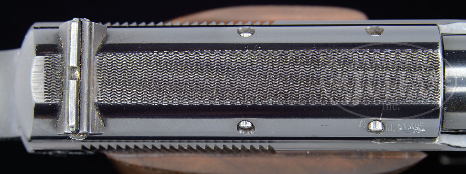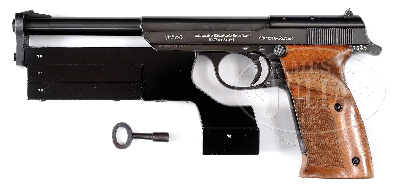 ◊*VERY FINE CONDITION WALTHER 1936 OLYMPIA, FULL COUNTERWEIGHT ASSEMBLY, TOOL.SN 7645. Cal. 22 LR. 7-1/2″ bbl. Standard production 1936 Olympia Match pistol. Left side of the slide marked with the Walther banner followed by the usual 2-line Walther address and the model denomination “Olympia-Pistole”. Right side of the slide marked “CAL. 22 long rifle”. Crown/N markings on right side of bbl & slide. Checkered wood grips. Matching magazine with wood base. Pistol is fitted with a full set of black anodized counterweights that attach to the muzzle & the forward frame. Weights are all marked “76” on left side and all securing square-head bolts are present. Complete with special key to manipulate the square-head bolts. PROVENANCE: Ex-Collection of Dr. Geoffrey Sturgess. Session two of the extraordinary Warren Buxton Collection. CONDITION: Very fine, with slight wear to finish and light handling marks. Small chip missing from bottom of right grip at front. Fine condition magazine & wood base. Tight mechanical function. Bore is bright with sharp rifling. One of the better Olympia pistols with a full set of weights to be offered at auction. 52342-23 (2,000-2,250) C&R – Lot 2394