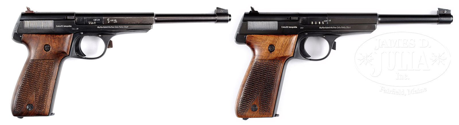 *PAIR OF WALTHER MODEL 1932 OLYMPIA PISTOLS.1) WALTHER 1932. SN 1148. Cal 22LR. 7-1/2″ bbl. Standard markings on slide. Crown/BUG proof marks on right side of bbl along with cal. Crown/BU proofs on right side of slide and bbl sleeve. Checkered wood grip with banner Walther at top of left side. Mag marked “9” on right side. PROVENANCE: Session two of the extraordinary Warren Buxton Collection. CONDITION: Fine condition with orig finish showing wear and handling marks on front strap, bbl and high points. All markings clear. A few very small areas of light pitting. Several dings on the chamber end of bbl. Grip shows normal handling marks and varnish wear with minor chips along where it meets the back of the frame on top. Fine bore is bright with sharp rifling. Mechanics are fine. All external numbers matching. C&R 2) WALTHER 1932 OLYMPIA. SN 3281. Cal. 22LR. 7-1/2″ bbl. Standard Walther markings on both sides of slide. Left side of slide is also marked “FLUCKIGER”. This significance of this marking is not known to us. Crown/N proofs on right side of pistol. Checkered wood grip. Mag marked “26” on right side. PROVENANCE: Session two of the extraordinary Warren Buxton Collection. CONDITION: Very fine condition overall, showing minimal wear and a few very light handling marks. Minor ding at front of trigger guard and grip strap. All markings clear. Grip has small handling marks, no cracks. Bore is bright with sharp rifling. Mechanics are fine. All external numbers matching. C&R 52342-47, 52342-48 (2,500-3,000) – Lot 2414