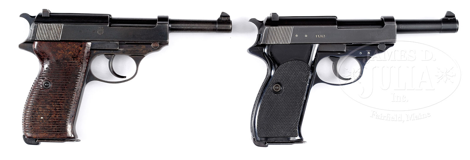 ◊*LOT OF TWO WALTHER P38 9MM PISTOLS WITH HOLSTERS, ONE AC43 SCARCE CROATIAN MARKED, ONE POST WAR GERMAN POLICE.1) WALTHER P38. SN 1796F. Cal. 9mm. 5″ bbl. Standard markings on slide, with the addition of the “369” shield marking of the 369th Croatian Infantry Regt., Wehrmacht. Matching SN on slide, frame and bbl. Brown Bakelite grips. WaA706, jvd marked mag. This gun is explained on pgs. 237 and 238, pictured on pg. 239 of The P38 Pistol vol. 3 by Warren Buxton. Accompanied by black leather clam shell holster. Marked on back “bml/43″/WaA23, “P.38”. PROVENANCE: Session two of the extraordinary Warren Buxton Collection. CONDITION: Good condition showing considerable finish wear. Markings are clear. Bore shows moderate pitting, rifling worn but visible. Fine mechanical function. Holster is solid showing wear. C&R 2) WALTHER P38. SN 230739. Cal. 9mm. 5″ bbl. Standard post war P38 “Ulm/Do.” markings. Dated 11/63 on right side of slide. Alloy frame. Matching SN’s. Post war black plastic checkered grips. Post war P38 banner Walther mag. Accompanied by a black leather German police holster dated 9/59. PROVENANCE: Session two of the extraordinary Warren Buxton Collection. CONDITION: Fine condition with light finish wear on high points. Minor handling marks. Markings clear. Grips show light handling marks. Bore is fine, bright with sharp rifling. Fine mechanical function. Holster is very good showing handling marks and minor wear from use. C&R; IMPORT 52342-69, 52342-125 GER (1,200-1,500) – Lot 2317