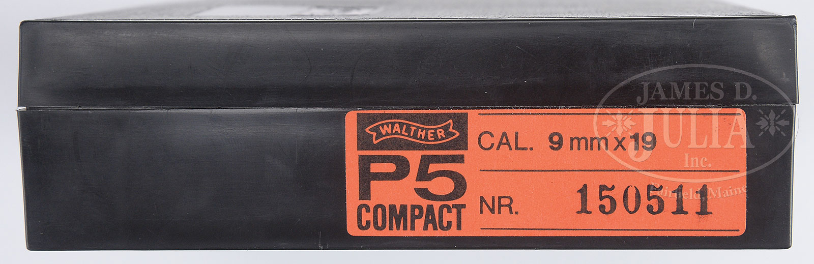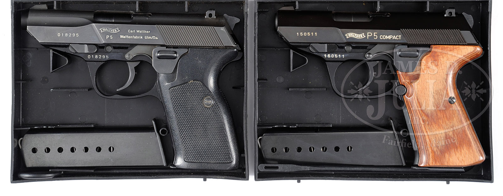 ◊*LOT OF TWO WALTHER P5 LEFT HANDED 9MM PISTOLS IN BOXES.1) WALTHER P5. SN 150511. Cal. 9mm. 3-1/8″ bbl. This gun is a P5 Compact. Standard markings “II” date code on right side of frame. All external numbers match. Wood grips. Comes in factory matching box, with test target, flyer, plastic cleaning rod, and a total of two proper mags. PROVENANCE: Session two of the extraordinary Warren Buxton Collection. CONDITION: Extremely fine condition. Gun appears as new. All markings are clear. Excellent wood grips. Excellent bore. Mechanics are fine. IMPORT 2) WALTHER P5. SN 018295. Cal. 9mm. 3-1/2″ bbl. Standard markings. “IA” date code on right side of frame. Black plastic grips. All external numbers match. Alloy frame. Comes in Walther black plastic box which is unnumbered along with matching factory test target, manual, plastic cleaning rod, and a total of two proper mags. PROVENANCE: Session two of the extraordinary Warren Buxton Collection. CONDITION: Very fine condition. Showing light wear along high points. All markings clear. Fine grips with minor handling marks. Fine bore with sharp rifling. Fine mechanical function. 52342-81, 52342-145 GER (800-1,200) – Lot 2325
