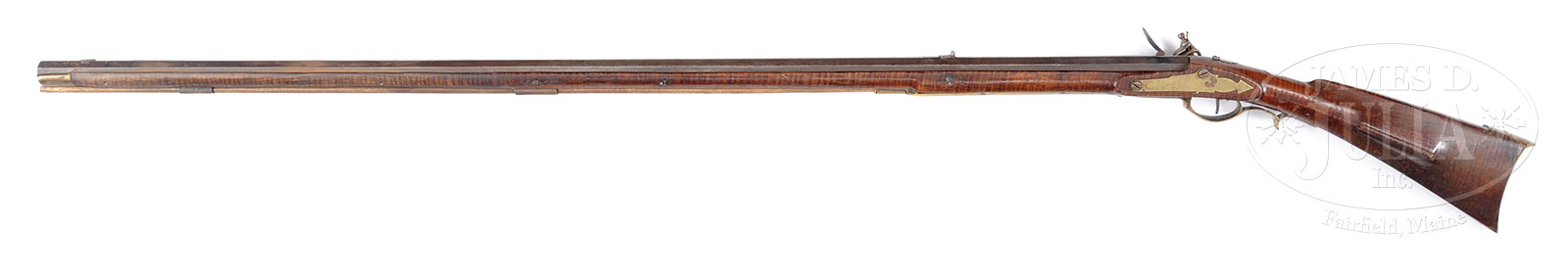 LEHIGH COUNTY PA FLINTLOCK RIFLE ATTRIBUTED TO JOHN MOLL.NSN. Cal. 41. Overall 63″ . Buttplate 4-1/8″ x 1-3/4″. 48″ full oct unmarked rifled bbl. Rifle is curly maple stocked with no carving and 2-pc brass fleur-de-lis patchbox is characteristic of John Moll’s style and is engraved with a “PB”. The studded brass trigger guard, the sheathed buttplate and 5″ arrowback sideplate are all characteristic of Lehigh county style. 2″ toeplate is nicely engraved. The 9″ brass saddleplate is not common to Moll rifles but has been used in the Lehigh County area. Rifle has an oval silver inlay at the wrist which is engraved “GW”. The long saddle plate and large flat arrowback sideplate are more typical of guns made in northwest section of Lehigh County, PA. CONDITION: 18″ forend wood is replaced along with 12″ of bbl. Lock hammer screw needs repair. Otherwise, the rifle is in very good condition throughout. Good mechanical function, lock functions. 52367-2 (2,000-3,000) – Lot 3299