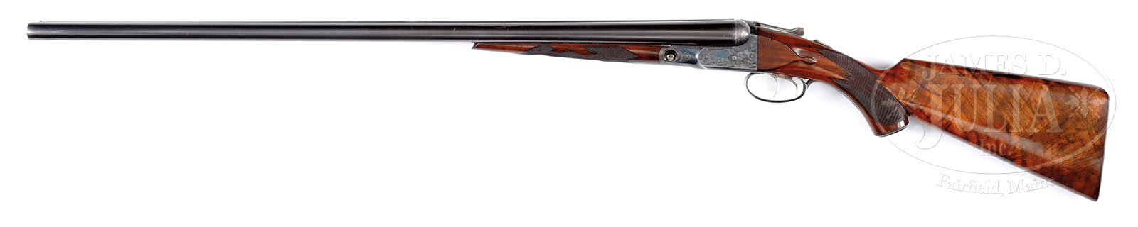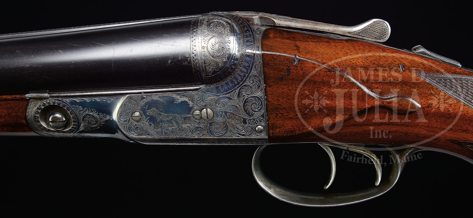 *FABULOUS HIGH ORIGINAL CONDITION PARKER DHE 12 GAUGE SHOTGUN.SN 212317. Cal. 12 ga. 30″ Titanic steel bbls. 2-3/4″ chambers. Full length matted top rib steel front bead. No. 1-1/2 frame. Dbl triggers, automatic ejectors, automatic safety. Capped pistol grip buttstock checkered in 3-point pattern with teardrop behind action and 14-1/4″ LOP over orig SSBP. Splinter forearm with engraved Deeley release and steel tip checkered in typical DHE pattern. Receiver is nicely engraved in standard DHE with pointer on left, setter on right, 4 pheasants on bottom all surrounded by standard Parker scroll engraving. All visible SN’s match. WEIGHT: 7 lbs, 13 oz. CONDITION: Very fine, and completely appears untouched and orig throughout. Bbls retain approximately 85-90% orig blue finish with scattered light toning and light handling marks. Buttstock and forearm are excellent and retain nearly all their orig finish with a few light handling marks. Receiver is gorgeous and retains more than 90% orig case color just starting to tone on bottom and breech balls. Top lever has toned. There is a most minute grain separation behind top tang otherwise stocks are sound. SSBP retains about 1/3 orig blue. Bores brilliant and shiny. Mechanics are crisp. This is an outstanding gently field used Parker and is exactly the type of gun a collector should buy to judge orig Parker finishes by. 52419-7 JSL (6,000-9,000) C&R – Lot 2525