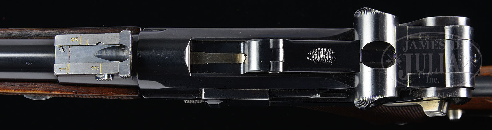 *WONDERFUL 1902 DWM LUGER CARBINE WITH MATCHING STOCK.SN 24314. Cal. 30 Luger. Standard 1902 Luger carbine with 11-3/4″ bbl having long ramp bead front sight, 3-position rear sight, and full SN on bottom of bbl where covered by forend. Intertwined “DWM” on center toggle link. Dished toggles with toggle lock on right side. Checkered walnut forearm, internally matched with the number “314”, with sling swivel. Checkered walnut grips. Correct and excellent magazine with unmarked walnut plug. Disassembly shows all numbered parts are matching. Inner surfaces of unnumbered grips are each marked with a six-pointed star. Inspector numeral “2” on the left grip panel; partial “I” on the right. Matching stock with second sling swivel and serrated horn buttplate. Not only is the gun entirely matching, but the finish, condition, and color of the forearm and stock are also consistent, making for an especially attractive ensemble. CONDITION: Original condition, approximately 97-98% bright rust blue, with expected sharp edge wear from careful use. Comparable condition strawed small parts. The forend and buttstock retain virtually most of their original varnish with just a scattering of light handling dings. Deep checkering with slightly blunted diamonds. Grips are darker with a few small loses and pressure indentations. Horn buttplate whose condition is consistent with the overall appearance of the firearm. Mirror bright bore with strong rifling. Perfect manual mechanics. A very attractive, no excuse, Luger carbine that would be an excellent addition to any collection. 52427-1 LMA (12,500-17,500) C&R – Lot 2039