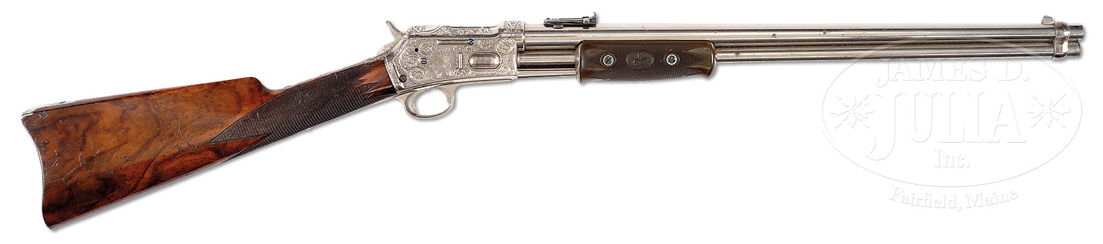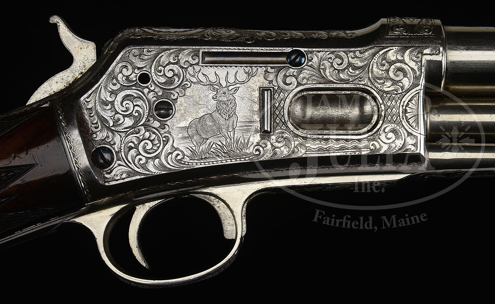 EXTREMELY RARE ENGRAVED AND NICKEL PLATED COLT MEDIUM FRAME LIGHTNING RIFLE THAT BELONGED TO PORFIRIO DIAZ.SN 3543. Cal. 44 WCF (44-40). Full nickel finish with 20″ bbl, full magazine and barleycorn front sight with blued, reverse mounted 900 yard ladder rear sight. Mounted with exceptional Italian walnut buttstock that has checkered straight grip and carbine buttplate without trap. Left side of receiver has a stud & ring and the trigger guard has a safety. Forearm is of 2 pieces, double Schnable checkered hard rubber with the Rampant Colt trademark logo on each side. Underneath top tang has matching SN with matching SN in pencil on rear face of buttstock, under the buttplate and also inside the toe of buttplate. Carbine is incredibly engraved by master engraver Cuno Helfricht with about full coverage on the receiver & top tang. Engraving consists of the large vignette of a cowboy, that resembles Buffalo Bill Cody, roping a bull buffalo in a prairie scene on the left side, a standing bull elk on the right side and the engraved Rampant Colt logo on top rear of the receiver. All the vignettes are surrounded by extremely well executed foliate arabesque patterns with extremely fine pearled background. The areas in front & behind the loading gate recess have extremely fine diamond & dot patterns with a matching diamond pattern over the receiver ring. Each side of the front edge of the receiver is engraved in a small shell pattern. Top tang is engraved with a fan pattern around the hammer slot with foliate arabesque patterns down the tang. Trigger plate & trigger bow are engraved in foliate arabesque patterns and geometric patterns with smaller patterns on the bottom tang. Bottom tang is engraved in period script, also by Mr. Helfricht “Porf. Diaz”. Buttplate tang & heel are engraved to match. This carbine is pictured, both sides & bottom tang, in full color on page 493 of The Colt Engraving Book Volume One, Wilson, in the Cuno Helfricht section of that publication. The medium frame Lightning rifle was Colt’s first attempt at producing a pump action firearm. They made almost 90,000 between 1884-1902. Of that number only a limited few were carbines and of those exceedingly few were so elaborately engraved with special plating. CONDITION: Very fine to extremely fine, all matching. Bbl & magazine tube retain 97-98% strong orig nickel with some fine pimpling in a couple of spots on the bbl. Receiver retains about 90% strong orig nickel with losses from flaking, not wear on the right side. Top & bottom tangs, trigger guard & trigger plate retain virtually all of their strong, orig nickel. Buttplate retains about 60% orig nickel with the losses from flaking not wear. Buttstock has handling and storage nicks & scratches and retains about 90% strong orig varnish. Forearm has a couple tiny bruises on the left rear edge and shows light diamond point wear, turned chocolate on the left side. Mechanics are crisp, strong bore with sharp rifling and moderate pitting. 52428-1 JRL (25,000-45,000) – Lot 1157