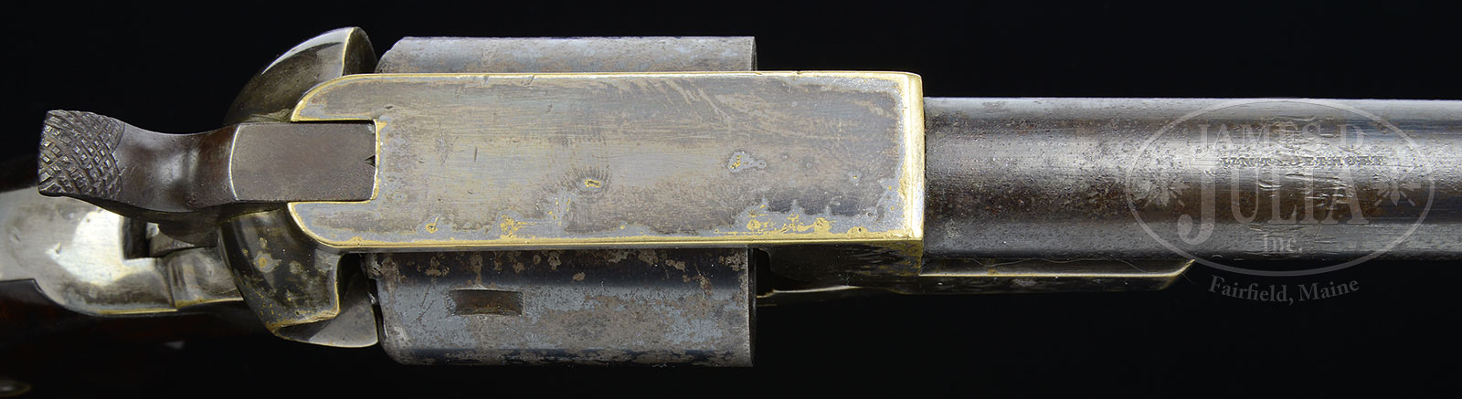 RARE SHAWK & MCLANAHAN BRASS FRAMED REVOLVER, SN 1.SN 1. Cal. 36. Silver plated brass frame, blue and case hardened. This rare gun was made in St. Louis, Missouri. just prior to the Civil War firm owned by Abel Shawk and J.K. McLanahan. This Navy cal. revolver, with a 7-3/4″ totally rnd bbl, is based somewhat on Whitney’s design and functions quite well. This gun and the original silver plated holster that always accompanied this gun had an interesting recent history. This pistol was stolen from a good client of ours, but at the time it was stolen, the gun thief could not also steal the holster, only the pistol. After the discovery of the loss of the pistol, our client put in a claim with their insurance company and collected for the loss. Most recently the crook offered the gun for auction (with a competitor). It was then that the insurance company discovered the unique gun that they had paid a settlement on. We are fortunate to have been selected by the insurance company to sell this rare and historic pistol for their account. We knew that the client still had the holster and so approached him about consigning it to this same auction. This rare, beautiful, inscribed holster will be sold immediately after this pistol is sold. Its very unfortunate that we could not reunite this holster and pistol, but as you can understand, they each belong to different individuals. We certainly hope that the winning bidder of the pistol will acquire, and once again reunite, this rare and historic pistol with the important rare and inscribed silver holster so that they can once again be together as they have been for about 150 years previously. The separate silver repoussé inscribed holster will be sold immediately after this pistol and as its description states, the inscription on the holster reads “FROM FELLOW OFFICERS / OF THE SOUTH CAROLINA / RESERVE FORCE / JAN 3RD 1865 / TO A FINE MAN AND OFFICER / BRIGADIER GENERAL / JAMES CHESTNUT CSA”. This gun and silver holster are both discussed (only gun is pictured) in an article by Frank Graves December 2013 issue of Arms Heritage magazine. It together with the holster also is illustrated and discussed (both the holster and the pistol) in Topper’s “Relics of South Carolina” on pg 81. Only 8 of these unique guns are known and each was handmade and finished with minor differences as noted in referenced article. This example is complete, all orig and once associated with a Confederate general. Gun is now missing its orig silver holster with Confederate inscription. This particular example is marked just like SN “2”, only marked “WM. TEGETHOFF” on bbl and cylinder. Frank Graves in his exemplary research shows that Tegethoff probably designed this pistol and was an early gunsmith working for Hawkens. This is the only example known which is silver plated. PROVENANCE: Confederate Brig. General James Chestnut, January 3, 1865; Ted Meredith Collection; pictured pg 81 “Civil War Relics From South Carolina”, Celeste & David Topper, 1988; Butterfield & Butterflied Auction. CONDITION: Very good overall. Bbl and cylinder retain about half their blue finish with staining and pitting. Brass frame and trigger guard 95% plus silver plate with edge wear and pitting with scattered stains, nicks and scratches. Stocks are sound and solid with strong traces of orig varnish. The last 1-1/4″ of loading assembly is spliced 2-pc construction, but appears absolutely orig from its manufacture. SN “1” is only found on left side of grip frame and penciled inside each grip. Mechanically gun functions well with crisp bright bore. 52428-2 JS (20,000-30,000) – Lot 1324 Click here to view provenance