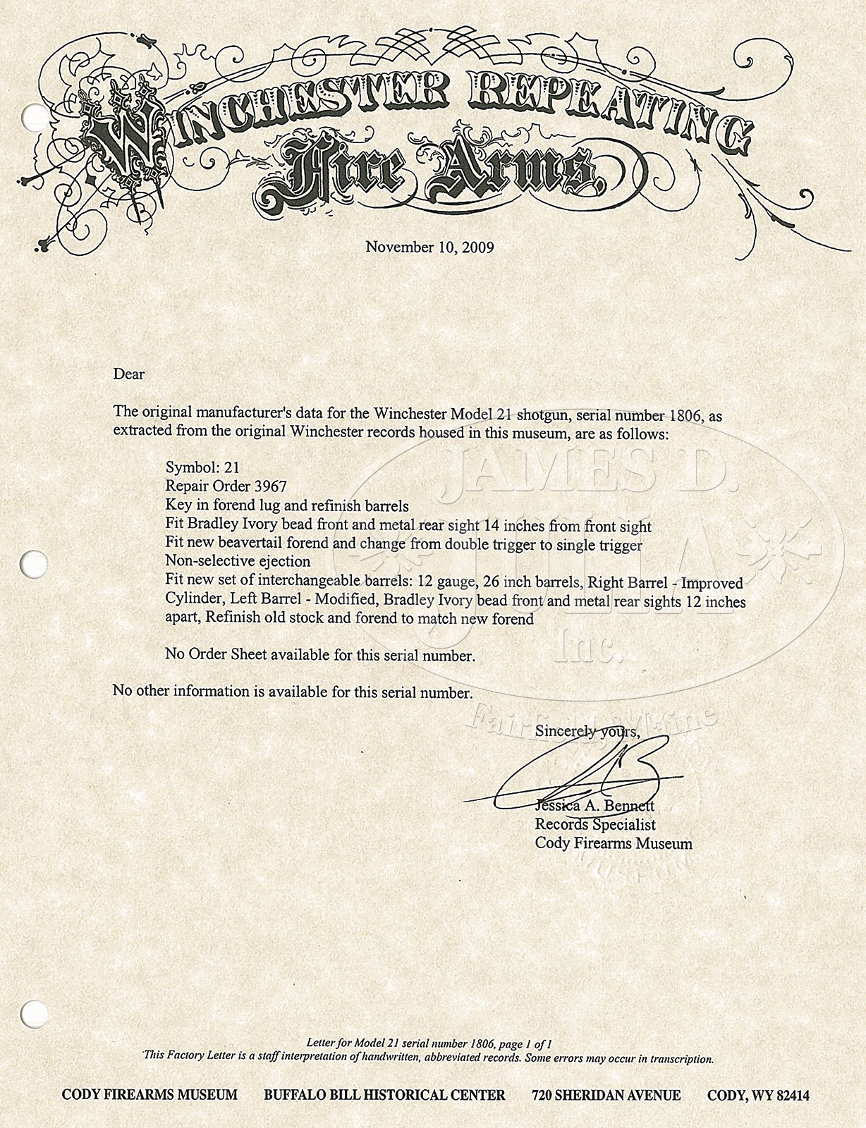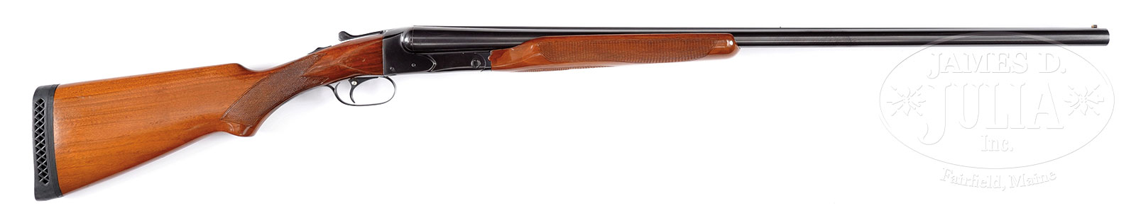 *EARLY WINCHESTER MODEL 21, 12 GAUGE SHOTGUN WITH FACTORY LETTER SHOWING REPAIR WORK.SN 1806. Cal. 12 ga. 30″ fluid steel bbl. Chambers marked for 2-3/4″. Chokes mod/full. Full length matted top rib with steel mid bead and white ivory front bead, to rib with 4 small screws near breech. SST, extractors, automatic safety. Early full knob buttstock checkered in 2-point pattern with 14″ LOP over non-orig black Winchester ventilated pad. Beavertail forearm checkered in 3-panel pattern with roll-type release. Un-engraved receiver. All visible SN’s match. WEIGHT: 7 lbs, 9 ozs. CONDITION: Fine, as factory refurbished per factory letter that accompanies this lot. All metal parts retain more than 95% factory refurbished blued finish. Buttstock and forearm, with contemporary high gloss finish, buttstock with repair on left side of top tang and filler on left side near trigger guard, minor losses on bottom left at frame, and grain separation left of top tang. Bores are bright and shiny with minor orange peel. Mechanics are fine. Special Note: This item(s) contains plant or animal properties that may be covered by the Endangered Species Act (ESA). Please read the Conditions of Sale, section 15, for more information regarding the Endangered Species Act, and your responsibilities as a buyer. 52437-1 JSL (1,500-2,500) C&R; ESA – Lot 2556