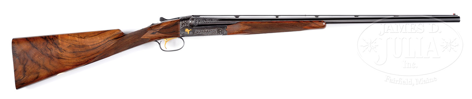 *20 GAUGE WINCHESTER “GRAND AMERICAN” SHOTGUN WITH EXTRA BARRELS AND CASE.SN W33011. Cal. 20 ga. 26″ Bbls with 2-3/4″ Chambers, choked skeet and skeet, and 28″ bbls with 3″ chambers, choked IMod and full. Both bbl sets have raised ventilated ribs marked “CUSTOM BUILT BY WINCHESTER FOR J. S. PARKER” in milled out portions of tops of ribs, with Winchester nomenclature on tops of left bbls. There are 2-3/4″ pyramids of scroll at breech ends. Engine turned bbl flats are stamped with SNs, and bottoms of bbls with “WINCHESTER PROOF STEEL” and chokes. Blued flat side action has Winchester markings on engine turned water table, and features non-automatic safety and gold plated single selective trigger. Action is engraved and gold inlaid in “Grand American” style with near full coverage of varying sized scroll surrounding oval vignettes of game on sides; gold pheasant in flight on left, and a duck flaring over a marsh on right. There is a gold inlaid portrait of a retriever in circular vignette on trigger plate. Gold woodcock is on trigger guard bow. Custom made, nicely figured and marbled European walnut straight grip buttstock measures 14-7/8″ over checkered wood butt. Side panels are checkered and have flush inlet ebony diamond shaped drop points. Borderless point pattern checkering wraps over top of grip and meets along toe line which also has vacant gold oval. Each bbl set has its own dedicated beavertail forend with nos. “1” and “2” stamped on fronts of iron, matching corresponding numbers on loops of bbls. BBL set “1” 26″: Bore diameter: left -.614, right – .614. Bore restrictions: left – .006 (IC), right – .005 (IC). Drop at heel: 2-1/4″, drop at comb: 1-3/8″. Cast about 1/4″ off. Weight: 6 lbs. 13 oz. LOP: 14-7/8″. BBL set “2” 28″: Bore diameter: left -.615, right – .615. Bore restrictions: left – .028 (full), right – .019 (mod). Drop at heel: 2-3/16″, drop at comb: 1-5/16″. Weight: 7 lbs. 1 oz. LOP: 14-7/8″. Orig leather case marked “Made in England” with stitched leather corners, is embossed “J. S. Parker” on top, and has brown canvas outer cover with leather trim, also embossed with owners name. Interior is lined in dark burgundy cloth, and has space for action and both sets of bbls, and contains a pair of snap caps. PROVENANCE: Factory order sheets and shooting reports, along with final inspection report, with all orig specifications, including notation “Mr. Parker will provide a photograph of Labrador”. The Forrest G. Rhodes collection. CONDITION: Excellent, as refinished, retaining essentially all fine professional finishes on wood and metal, most likely done at time of restocking. There are a number of fairly deep dings on left side of buttstock, and on left side of forend of bbl “2”. Mechanically fine. Case is excellent, as protected by its outer cover, which is fine. Interior cloth has some rubs. 52465-4 MGM (20,000-30,000) C&R – Lot 1504 Click here to view provenance