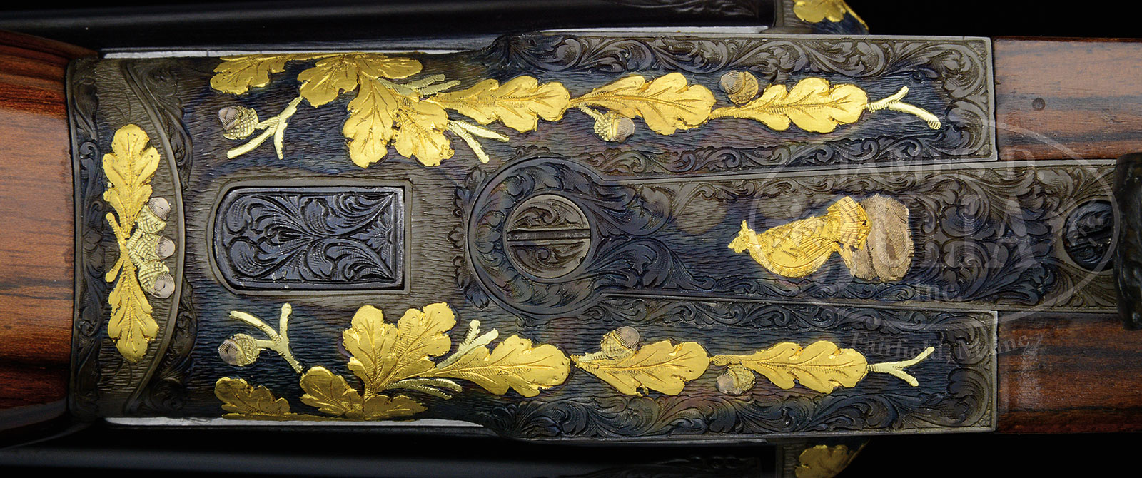 *SPECTACULAR UPGRADED L.C. SMITH DELUXE GRADE 20 GAUGE SHOTGUN.SN 6330E. Cal. 20 ga. 28″ Armor steel bbls, 3″ chambers (lengthened). Chokes MOD/MOD. Full length matted top rib with ivory front bead marked at breech “L.C. SMITH DeLuxe” surrounded by floral scroll engraving with gold oak leaf and acorn pattern. Muzzles with small gold oak leaf inlay. Gold plated Hunter One trigger, automatic ejectors, non-automatic safety. Capped pistol grip buttstock, checkered in 2-point pattern with 14-1/8″ LOP over thin lined HRBP. Beavertail forearm is near fully checkered with banjo roll-type release that is engraved in floral scroll pattern. Receiver is beautifully engraved in floral scroll pattern with abundant gold inlay that include gold setters in detailed game scene along with gold grouse on bottom, gold woodcock on right and quail at front of lockplates. Multi-colored gold oak leaf and acorn pattern extends to top of frame, breech balls, top lever and gold “S” in front of safety. Forearm iron with multi-colored gold oak leaf and acorn engraving. Top lever is pierced and trigger guard edges are sculpted in true Deluxe Grade pattern. Virtually all metal surfaces are engraved in tasteful floral scroll engraving. All visible SNs match. Weight: 6lbs 2oz. PROVENANCE: The Forrest G. Rhodes collection. CONDITION: Extremely fine as totally customized. This gun retains virtually all of its custom finish to both wood and metal with only minor handling marks in wood. Mechanics are crisp. Bores are bright and shiny with minor shot striation in front of chambers. A fantastic high art L.C. Smith custom. An authentic Deluxe 20 gauge is deep into six figures and almost unobtainable for any money. Special Note: This item(s) contains plant or animal properties that may be covered by the Endangered Species Act (ESA). Please read the Conditions of Sale, section 15, for more information regarding the Endangered Species Act, and your responsibilities as a buyer. 52470-2 JSL (4,000-7,000) C&R; ESA – Lot 2506