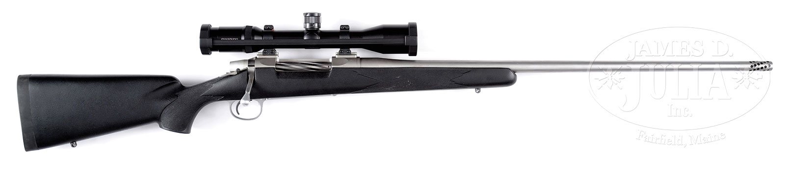 *CUSTOM BORDEN RIFLES LSH MODEL HUNTING RIFLE WITH SWAROVSKI SCOPE.SN JB-1. Cal. .338 REM ULTRA MAG. 28″ ported metallic matte finished bbl. Black composite checkered buttstock with sling swivels and black “Borden Rimrock” pad. Mounted with Swarovski 1.5-6X-42 Habicht scope. WEIGHT: with scope, 8 lbs, 15 ozs. PROVENANCE: The Forrest G. Rhodes collection. CONDITION: Very fine, as field used. There are minor losses behind top of receiver and buttstock, and some minor staining to bbl. Bore is bright and shiny. Optics are clear. Mechanics are fine. 52470-24 JSL (2,000-3,000) – Lot 2747