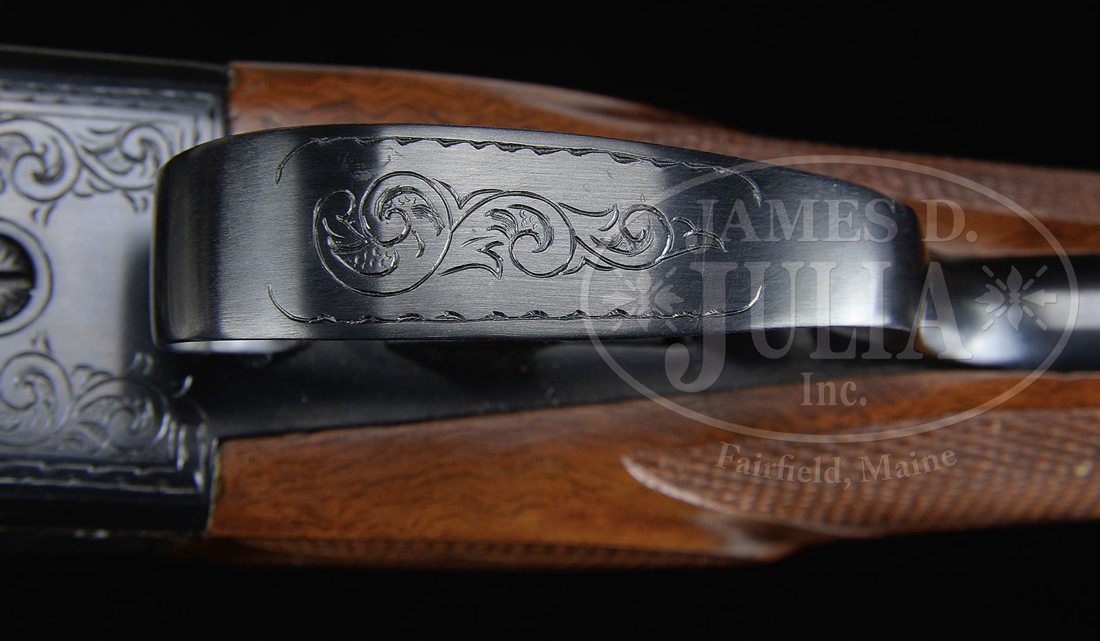 Please Note: Engraved and gold inlaid by Pauline Murrell, Winchester factory engraver, But not done at the factory. Wood work done by Bud Barrett of Rye, NH. *GORGEOUS CUSTOM WINCHESTER MODEL 21, 20 GAUGE SHOTGUN.SN 15753. Cal. 20 ga. 28″ bbls with chamber marked for 2-3/4″, chokes marked MOD/FULL. Full length matted top rib with steel front bead. Dbl triggers, automatic ejectors, automatic safety. Gorgeous custom flame grained American walnut buttstock checkered with ribband through wrist and checkered side panels. Skeleton cap on checkered full pistol grip and 14-1/2″ LOP over SSBP. Custom beavertail forearm also checkered in ribband pattern with roll-type release. Receiver is nicely custom engraved in something comparable to a 21-4 coverage level with flying quail on right, flying woodcock on left in beautiful gold oval accent. Trigger plate with flying woodcock and similar gold circle. Trigger guard with burst of scroll engraving. All visible SN’s match. WEIGHT: 6 lbs, 14 ozs. PROVENANCE: The Forrest G. Rhodes collection. CONDITION: Extremely fine. Retaining virtually all custom finish to both wood and metal. May have been fired since being customized but very little if so. Bores are excellent. Mechanics are crisp. A very pretty custom model 21. 52470-31 JSL (3,000-5,000) C&R – Lot 2553
