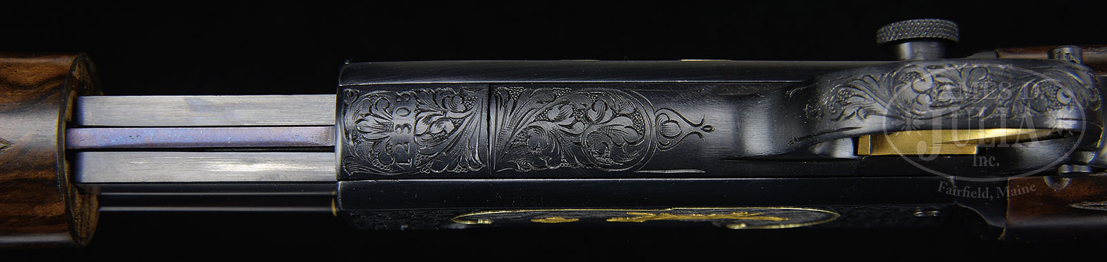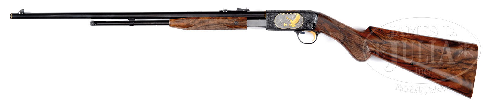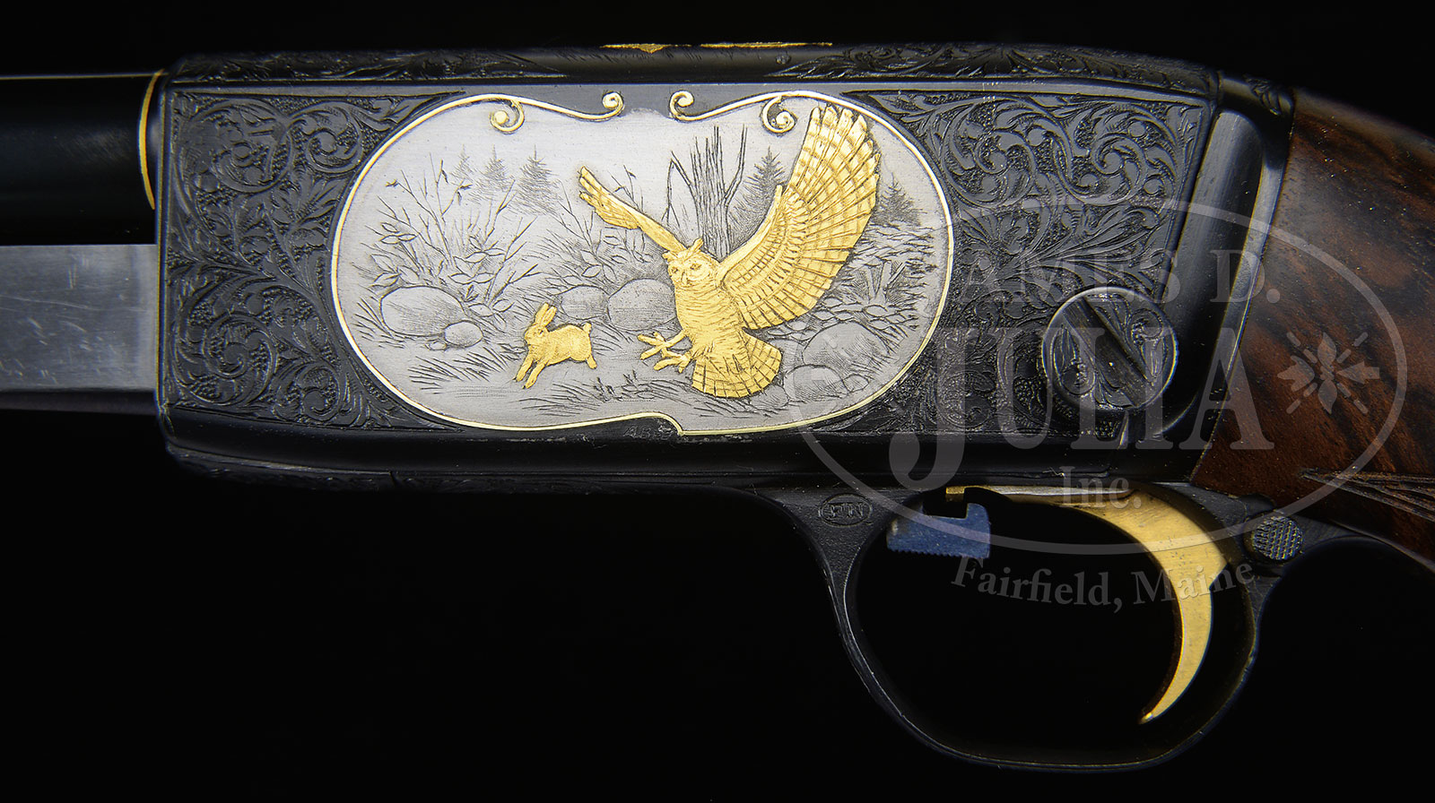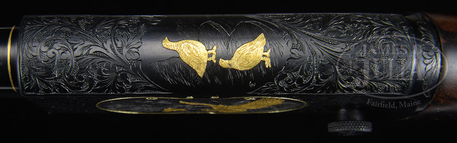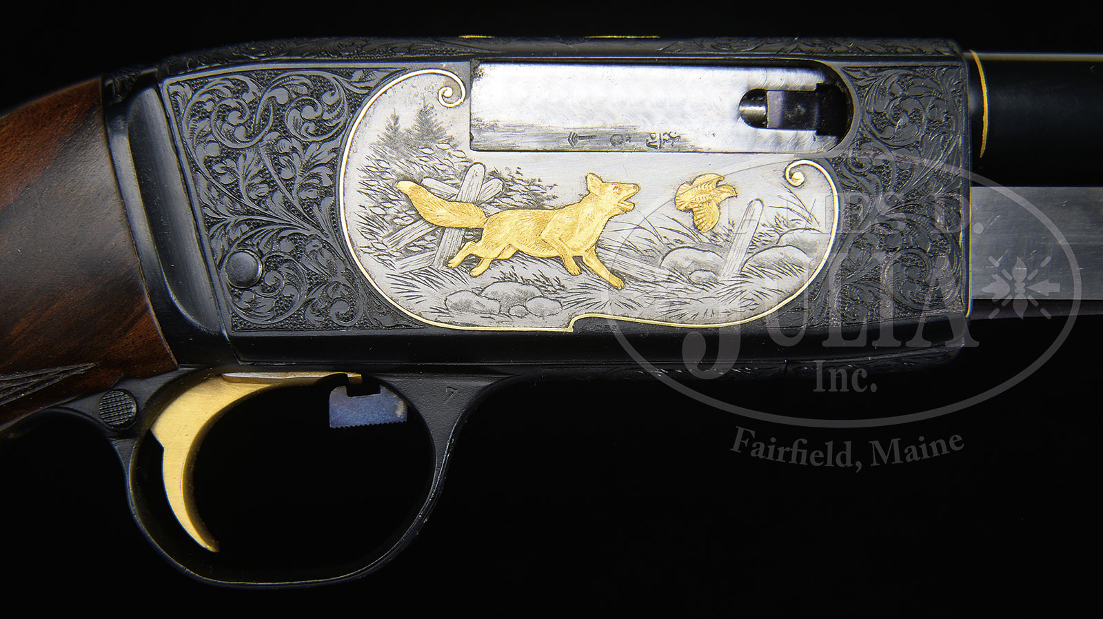 *RARE FABRIQUE NATIONALE (FN) TROMBONE PUMP ACTION 22 RIFLE ENGRAVED WITH GOLD BY MASTER ENGRAVER ANGELO BEE.SN 12803. Cal. 22. Spectacular trombone with 21-3/4″ tapered rnd bbl, sporting front sight & orig sheet metal, V-notch rear sight. Mounted with incredible French or Circassian walnut with checkered, bullet-shaped forearm and bag-shaped grip buttstock that has checkered butt. Receiver is incredibly engraved by master engraver Angelo Bee and signed on both sides. Engraving consists of full coverage foliate arabesque patterns surrounding the very large vignette on the left side of a swooping owl attacking a rabbit, all in raised gold and great detail in an incredibly detailed, bank-note style background of a field scene. This vignette is surrounded by inlaid raised gold wire. Right side is engraved to match with the large vignette of a leaping fox trying to catch a Bobwhite quail, both in raised gold in an equally detailed field scene. This vignette also is surrounded by raised gold wire. Both vignettes are with French grey background. Top of the receiver is engraved with the oval vignette of 2 raised gold partridges in a detailed rocky scene. Trigger plate & trigger bow are engraved to match. Muzzle & chamber ends of the bbl are inlaid with fine gold wire. Top of the bbl over the chamber area, left top front of the receiver and bolt all have Belgian proofs. CONDITION: Extremely fine plus. Overall retains about 99% plus of its fine custom finish to both metal & wood with strong dark blue and bright hand rubbed oil finish on the wood. Checkering is crisp & clean showing only faint diamond point wear. Forearm has a small bruise on each side. Mechanics are crisp, brilliant shiny bore. 52502-1 JRL (7,000-10,000) C&R – Lot 1681