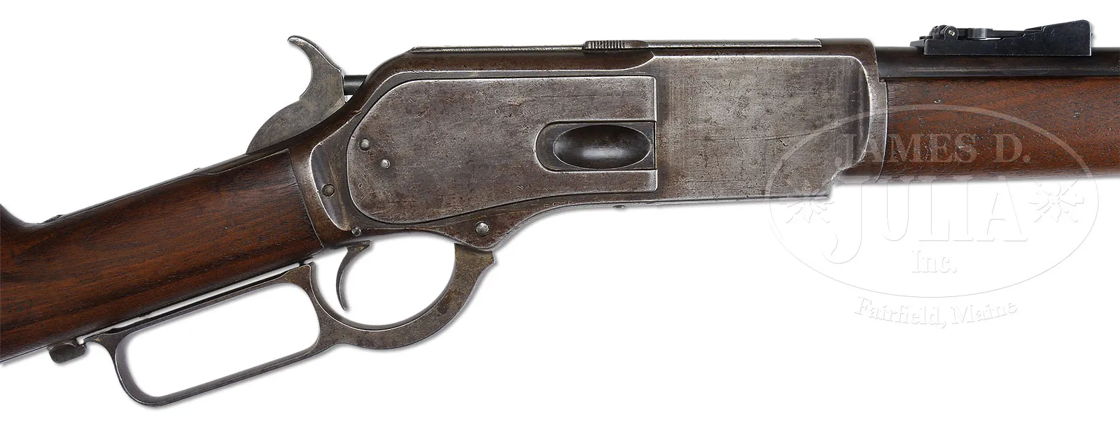 SCARCE WINCHESTER MODEL 1876 NORTH WEST MOUNTED POLICE ISSUED SADDLE RING CARBINE WITH FACTORY LETTER.SN 44181. Cal. 45-75. Standard carbine with 22″ rnd bbl, barleycorn front sight and what is probably a replacement civilian ladder carbine/musket rear sight. Bbl has standard Winchester & King’s patent 2-line address with the area over the chamber marked “CAL. / 45-75”. Receiver is 3rd type with integral dust cover rail containing a 3rd type dust cover and has is a stud & ring in the left side. Carrier is marked “45-75”. Mounted with nicely figured, uncheckered American walnut with full length forearm that has special blued steel nosecap and a single band secured with a spring keeper. Buttstock has a straight grip with carbine buttplate without trap. Right side of buttstock is marked with a Northwest Mounted Police “N.W.M.P. Cartouche” in a half circle. Bottom of stock, below the lower tang has the faint stamping “APP 139” which stands for Alberta Provincial Police. In 1916 the N.W.M.P. loaned the Edmunton Reserve Militia 710 Winchester carbines for training purposes. In January 1919 the Alberta Provincial Police purchased these carbines to arm their police and militia. Accompanied by a Cody Firearms Museum letter which identifies this firearm as a carbine, received in the warehouse March 28, 1885 & shipped the same day to order no. 19589. Also accompanying are copies of research records which shows that order no. 19589 was for 150 carbines which included this serial number. Additionally accompanying is a copy of page 123 “taken out of Lewis Yearout book on 1876 NWMP” which is a listing of 115 carbines by SN which were reported on an inventory of Model 1876’s assigned to H-Division of the N.W.M.P. This division was assigned to Whitehorse in the Yukon Territory during the gold-rush period. The list of 1876 carbines shown on p. 186 of Arms & Accoutrements of the Mounted Police, Clancher, lists this carbine by SN as having been part of a shipment of 150 Winchester carbines shipped from New Haven to Winnipeg on March 28, 1885. After the British Army completely left Canada in 1870, the Canadian Govt raised a small regular force and reorganized the militia cavalry into regiments. It was apparently during this period that the Canadian govt ordered the model 1876 carbine to arm the North West Mounted Police as well as the militia cavalry units. These carbines saw hard frontier service, especially during the Riel Rebellion and as part of the forces assigned to the Yukon Territory during the gold-rush and later patrolling the Canada/U.S. borders & remained in service until 1914. Few of these carbines survive today in orig configuration with orig finish. After their lengthy service with the Canadian Militia they were sold as surplus. Accompanied by an orig 3-piece brass & steel cleaning rod. CONDITION: Good. Bbl retains blue in the most sheltered areas being mostly a silver gray patina with a few nicks and dings. Receiver and sideplates retain about 20-25% thin orig blue in sheltered areas with the left sideplate showing artificial aging. Bottom and top edges of receiver are a blue gray patina. Hammer retains faded case colors, stronger on left side and rear edge. Lever retains traces of case colors, being mostly a mottled silver brown patina. Forearm has two or three gouges about midpoint otherwise wood is sound with a cleaned, hand-worn patina. Mechanics are fine. Strong sharp bore with some shine & very fine pitting. Cleaning rod is fine. 52506-6 JRL (8,500-15,000) – Lot 1061 Click here to view provenance